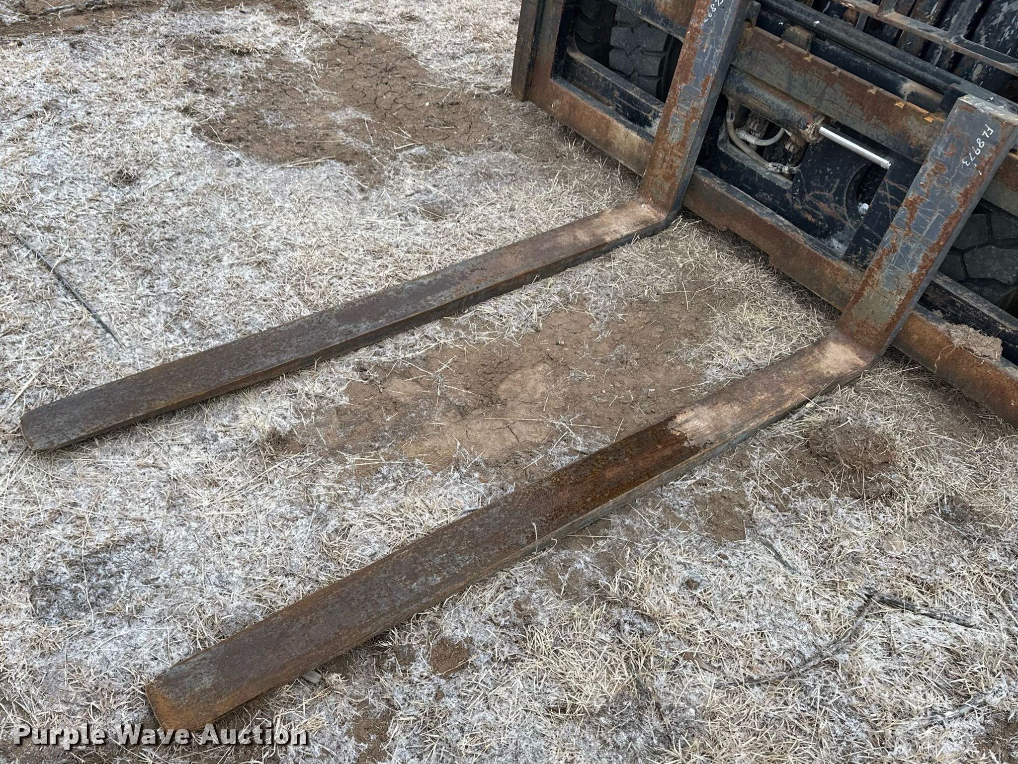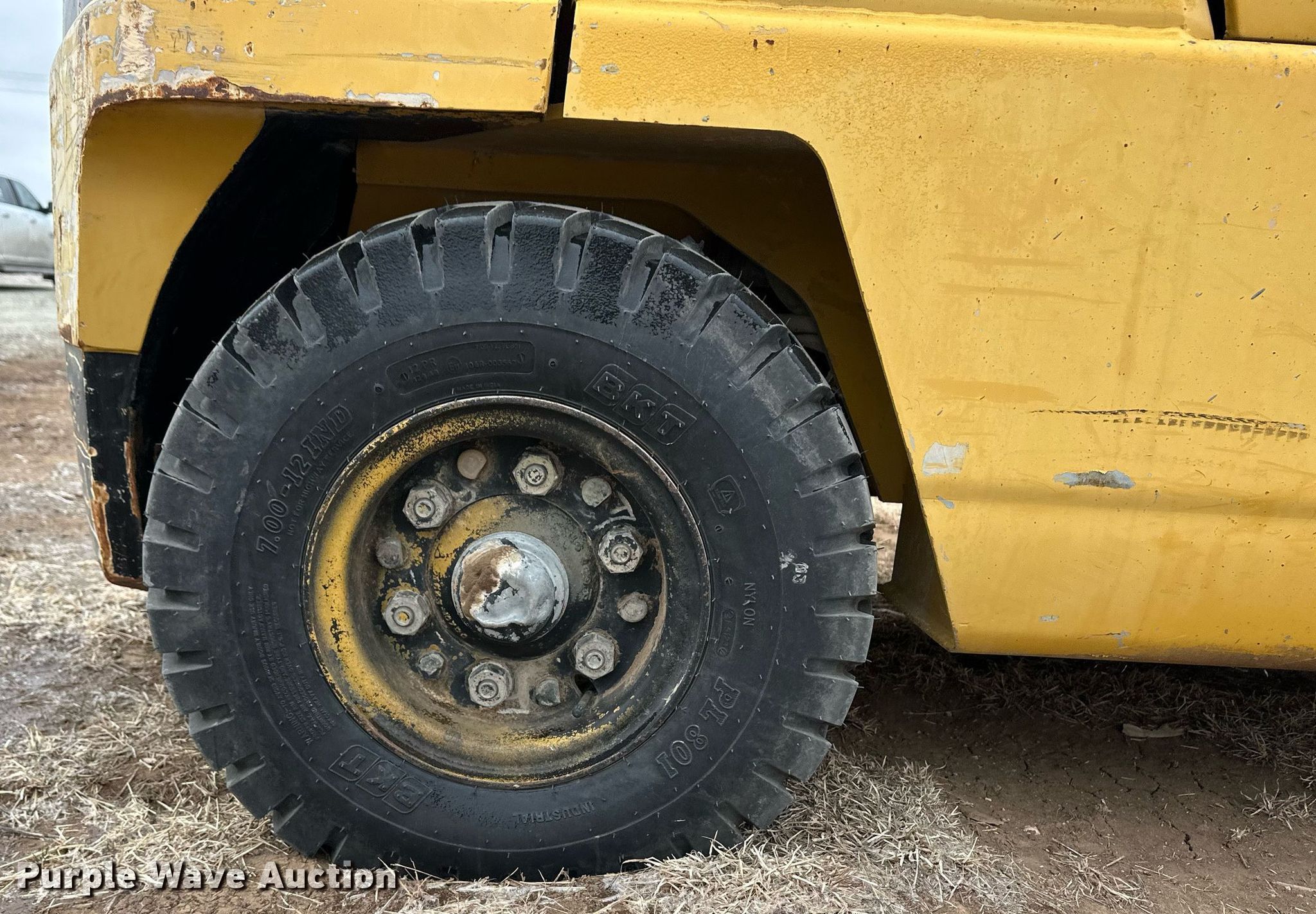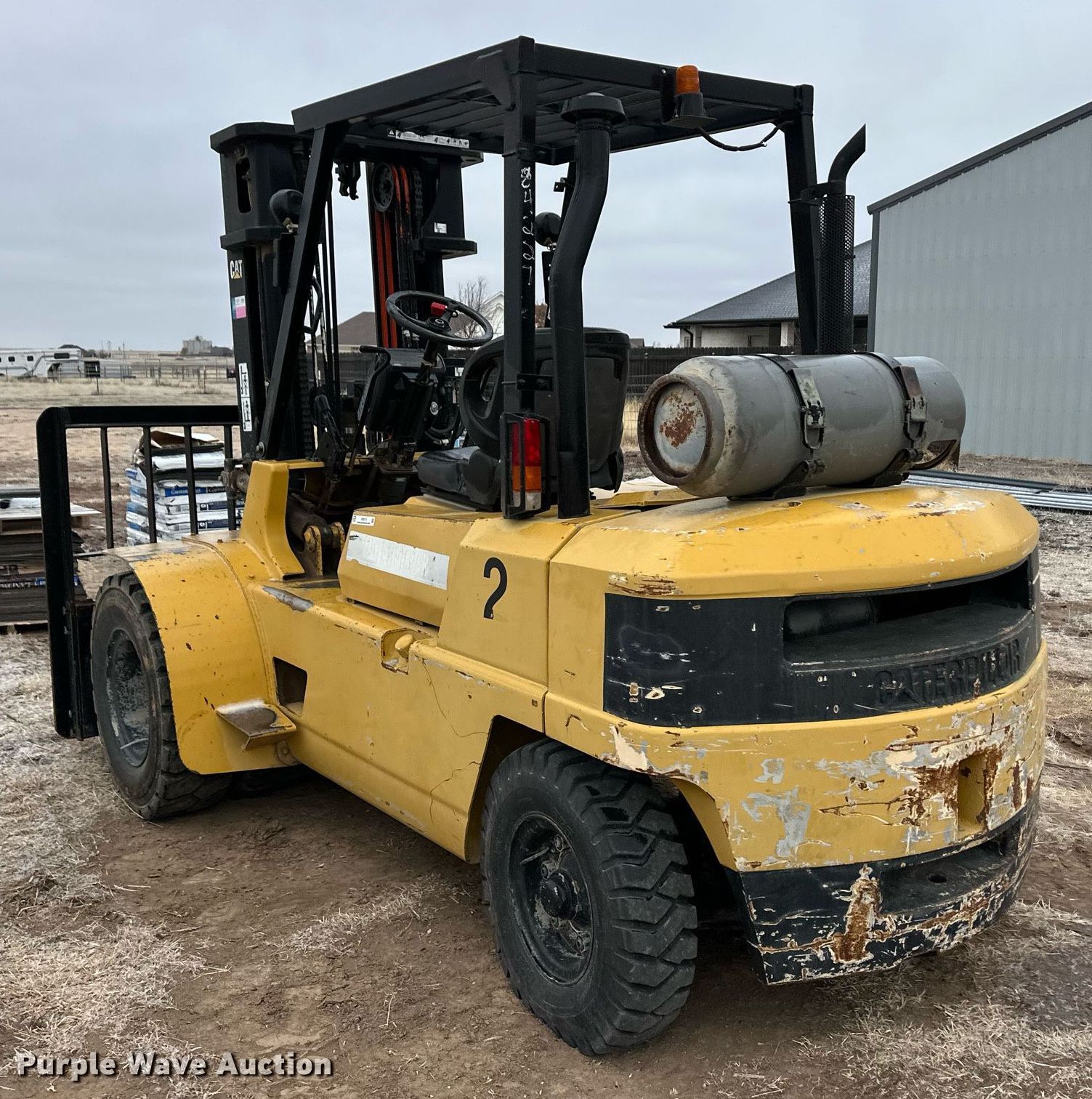 2000 Caterpillar GPL40 forklift. Hours: 9,147 on meter, Serial: AT29A-00141. Engine Cylinders: 6, Fuel type: LPG LP bottle: Included. Transmission Powershift. Operators station Canopy. Features Maximum lift capacity: 9,000 lbs, Maximum lift height: 187", Mast stages: 3, Side shift, Mast tilt, Fork length: 71". Tires Front: 8.25-15, Rear: 7.00-12. Pristine Roofing & Construction. Bushland, TX 79012