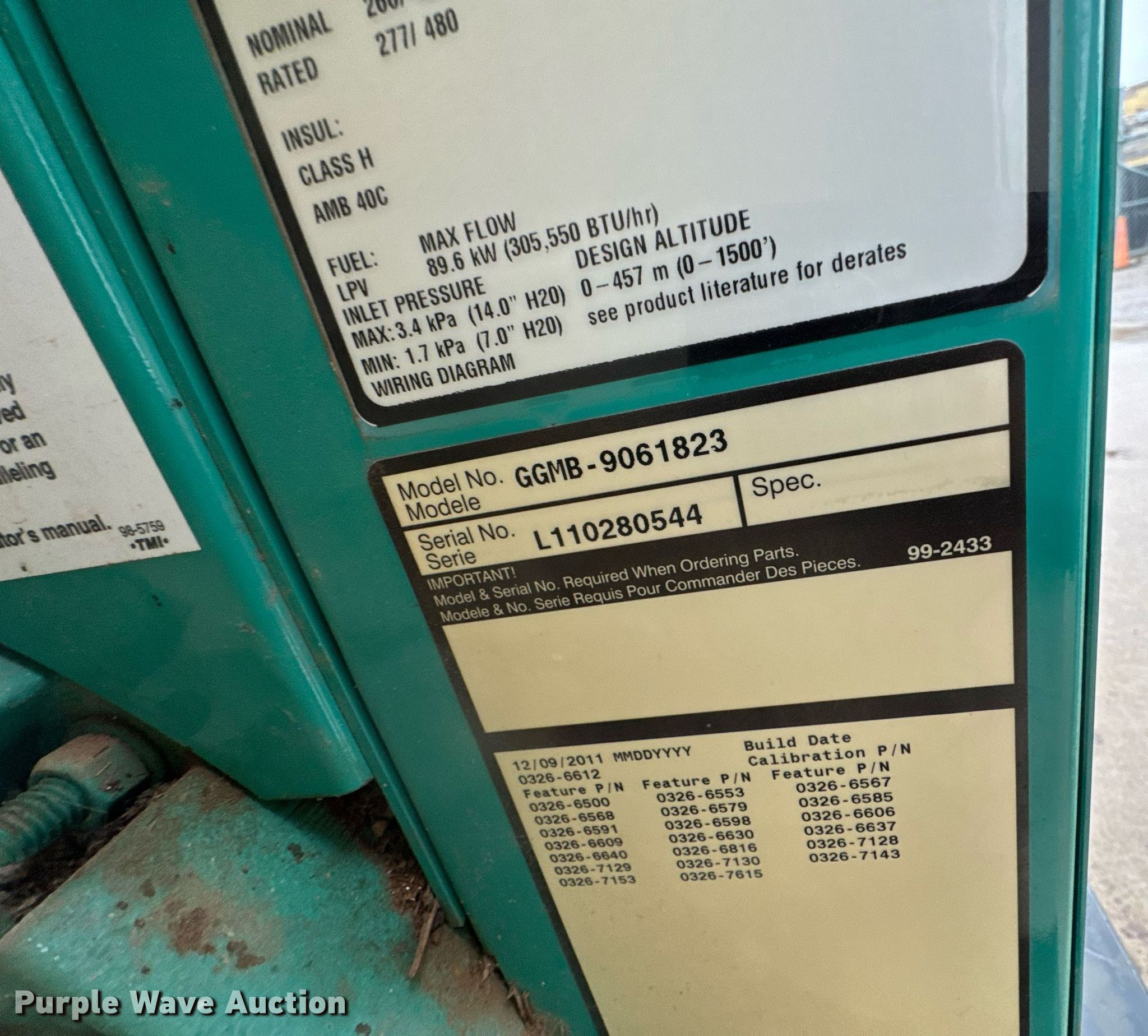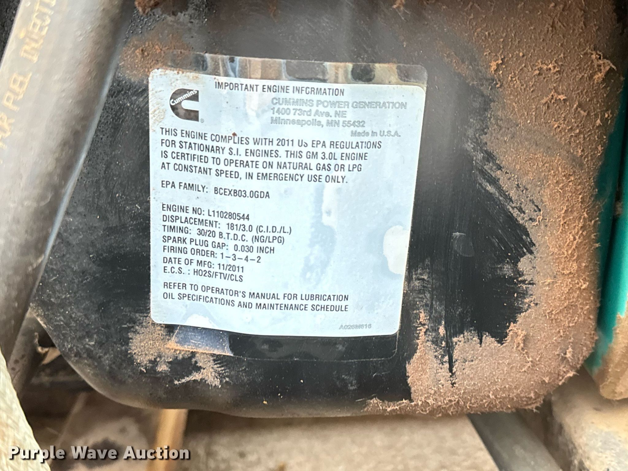 Purple Wave is selling a used Generator Set in Oklahoma. This item is a 2011 Onan GGMB-9061823 generator with the following: Hours: 696 on meter, Serial: L110280544