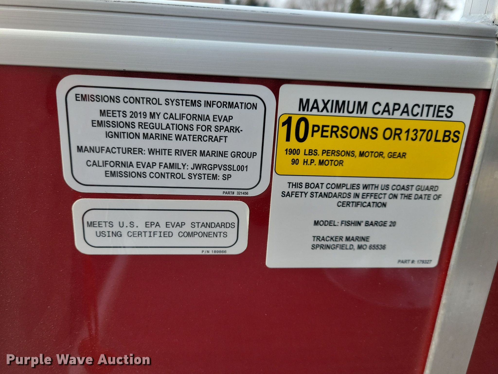 Purple Wave is selling a used Boat in Iowa. This item is a 2019 Sun Tracker Fishin Barge 20 DLX pontoon boat with the following: Length: 20', Hull ID: US-BUJ83312F819