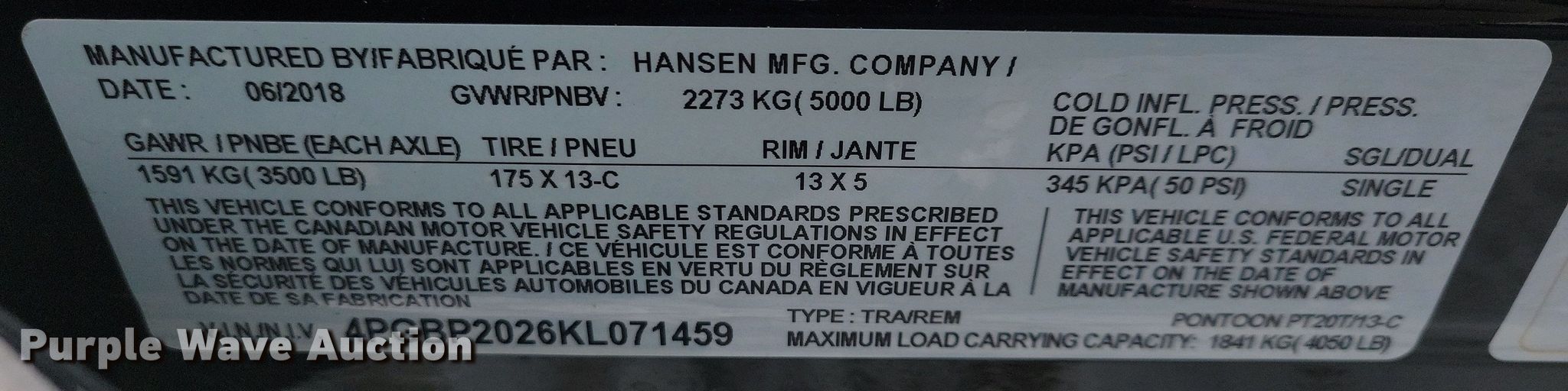2019 Sun Tracker Fishin Barge 20 DLX pontoon boat. Length: 20', Hull ID: US-BUJ83312F819. Engine Engine type: Outboard, 2018 Mercury Four Stroke CT, Serial: 1C543968, Displacement:.996L, Cylinders: 4, Fuel type: Gas, HP: 60, Outdrive Make: Mercury, Model: 1F60453LZ, Propeller: Aluminum. Operators station Capacity Person: 10, 1,370 lbs, Depth finder: Lowrance Hook 5x HDI GPS. Features Wakeboard/ ski tower, Bimini top. Trailer 2018 Mid America Trailers Hanson, Overall length: 25', Overall width: 102", GVWR: 5,000 lbs, Ball hitch size: 2", Axles: Tandem, Tire size: ST175/80D13. Boat - Wisconsin title. Outboard motor - Transfer of ownership documentation will be a bill of sale. Trailer - Transfer of ownership documentation will be a bill of sale. Johnson Farming. Osage, IA 50461