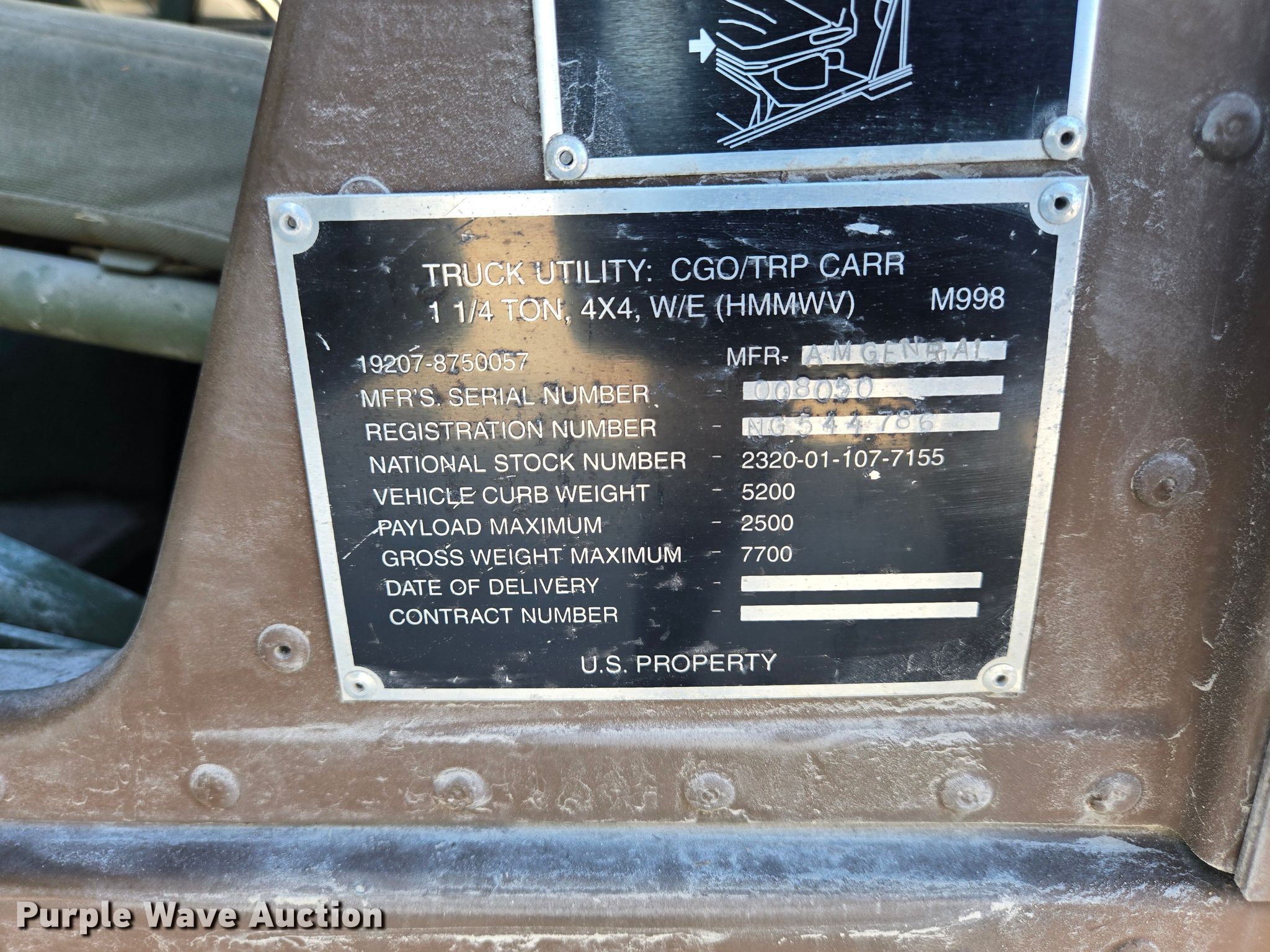 Purple Wave is selling a used Passenger Vehicle in Florida. This item is a 1985 AM General M998 HMMWV with the following: Miles: 4,457 on odometer, VIN: 008050, Unit #: 42774335
