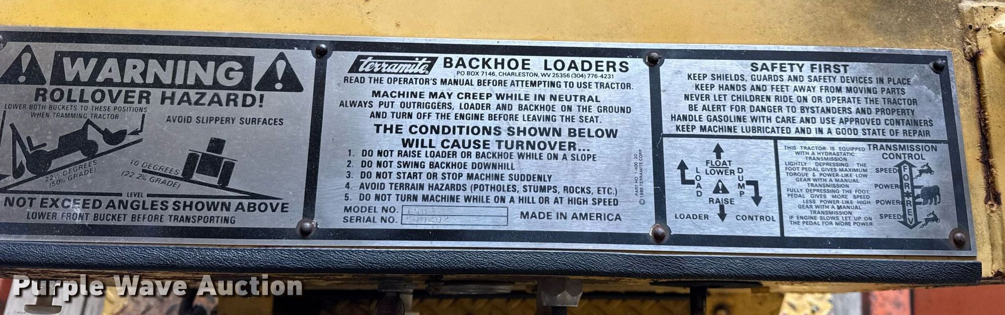 1990 Owens Classic tilt deck equipment trailer. VIN: 10W0TTG12LW015123. Dimensions Overall: 16' L x 92' W, Deck: 12' L x 70" W, Deck height: 15". Features Deck type: Wood. Chassis Hitch: Pintle, Landing gear: Single, Suspension: Spring, Brakes: Electric. Tires Steel wheels, Size: 8-14.5. Terramite T5B landscape tractor Serial: 500202. Engine Kohler Magnum, Cylinders: 2, Fuel type: Gas, HP: 20. Transmission Hydrostatic. Operators station OROPS, Backhoe controls: Wobble stick / two stick. Features Loader Bucket Width: 48", Backhoe Bucket Width: 16", Teeth: 4.. Tires Front: 20.5x8.0-10, Rear: 9.5-16. Notes Fuel issues , Non-operational unit. Transfer of ownership documentation will be a bill of sale. Brightspeed. Rensselaer, IN 47978