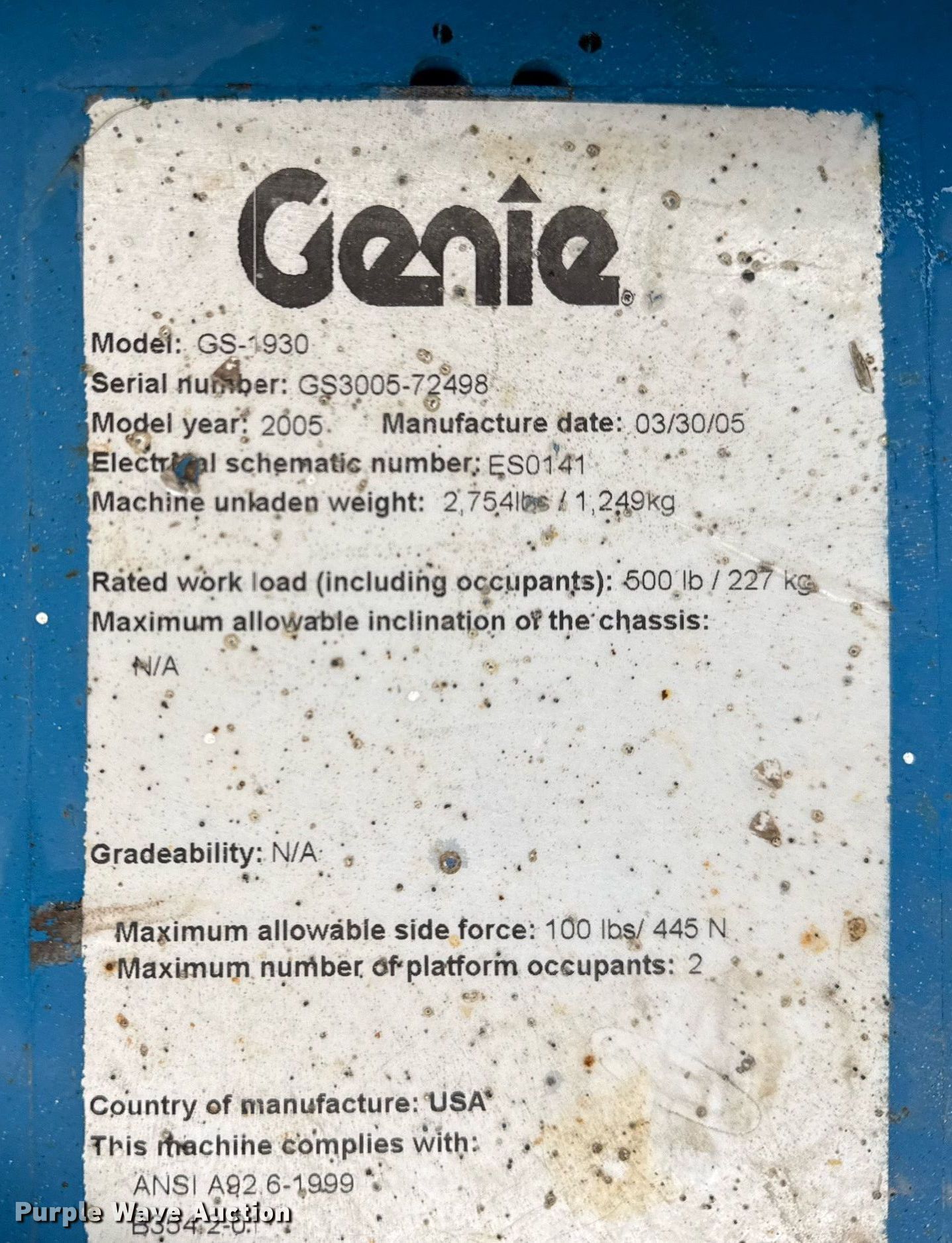 Purple Wave is selling a used Scissor or Vertical Lift in Oklahoma. This item is a 2005 Genie Lift GS-1930 scissor lift with the following: Hours: 621 on meter, Serial: GS3005-72498