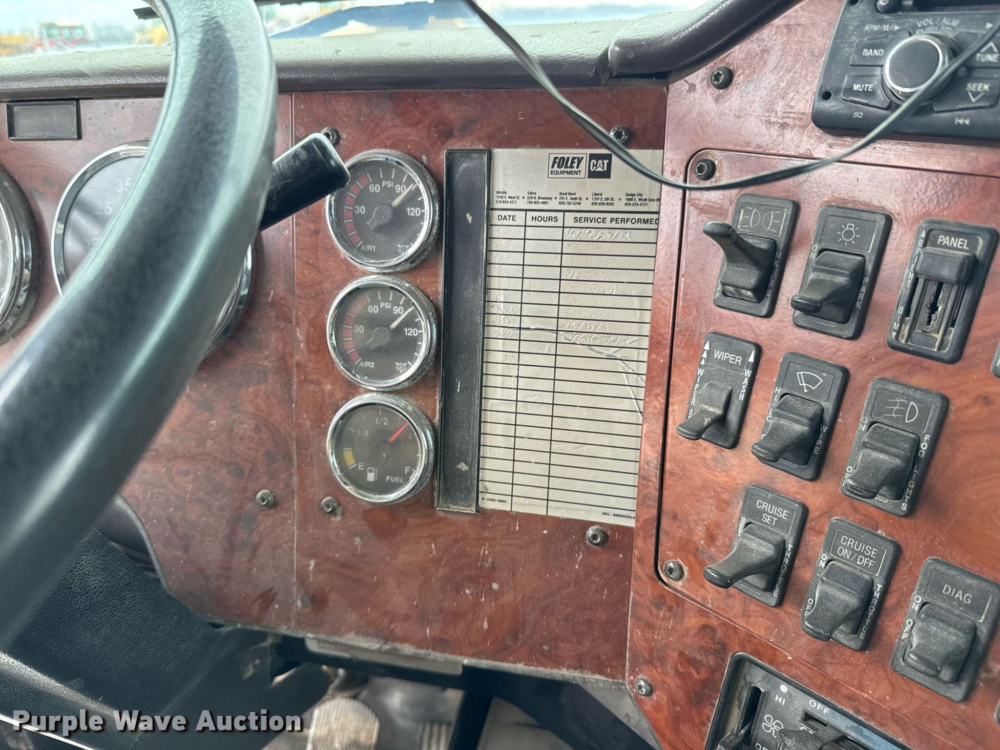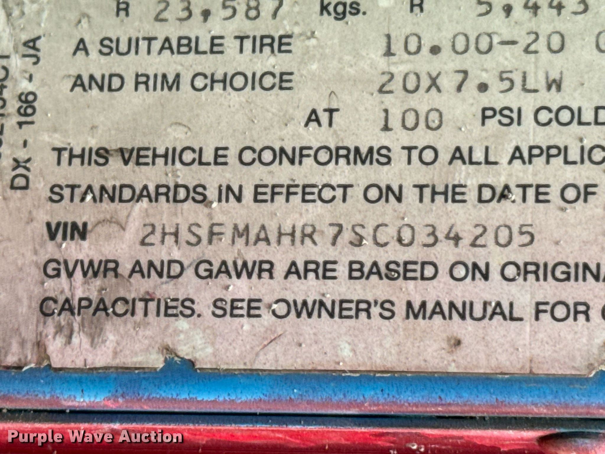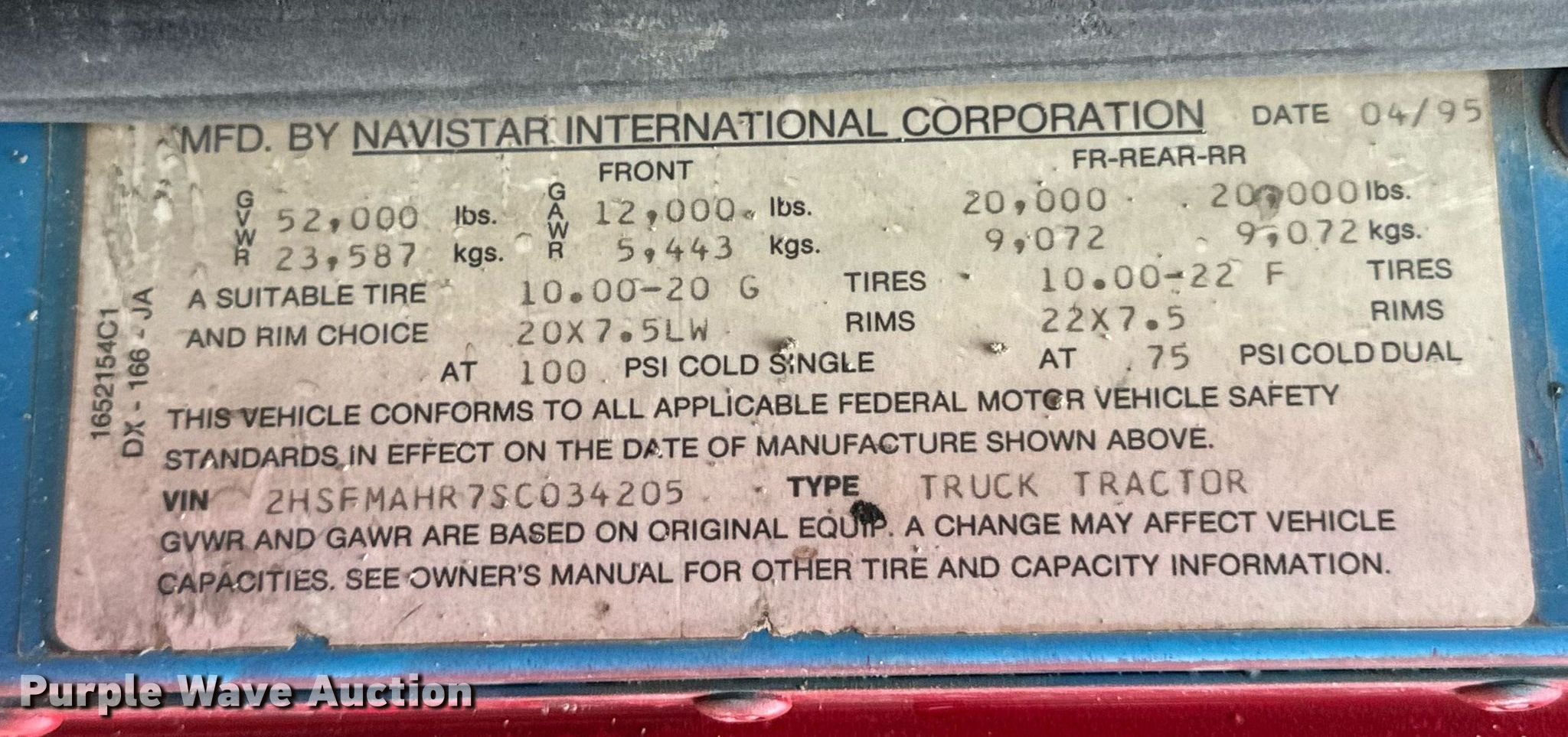 1995 International 9200 dump truck. Miles: 774,232 on odometer, VIN: 2HSFMAHR7SC034205. Engine Displacement: 10.8L, Cylinders: 6, Fuel type: Diesel. Transmission Spicer, Manual, Speed: 10. Chassis Axles: Tandem, Differential lock: Inter-axle, Suspension: Air, Brakes: Air, PTO, GVWR: 52,000 lbs. Interior AC, Heat, Heated mirrors, Cruise control. Features Dump bed 15' L x 96" W, Side height: 42", Side board height: 9", Bed type: Steel, Ram: Single, End gate: Air operated. Tires Size: 11R22.5. Notes Dash warning indicator: High water temp, Low oil temp. Kansas title. Title distribution may be delayed up to 14 days from verification of funds. Whitaker Companies, Inc... Humboldt, KS 66748