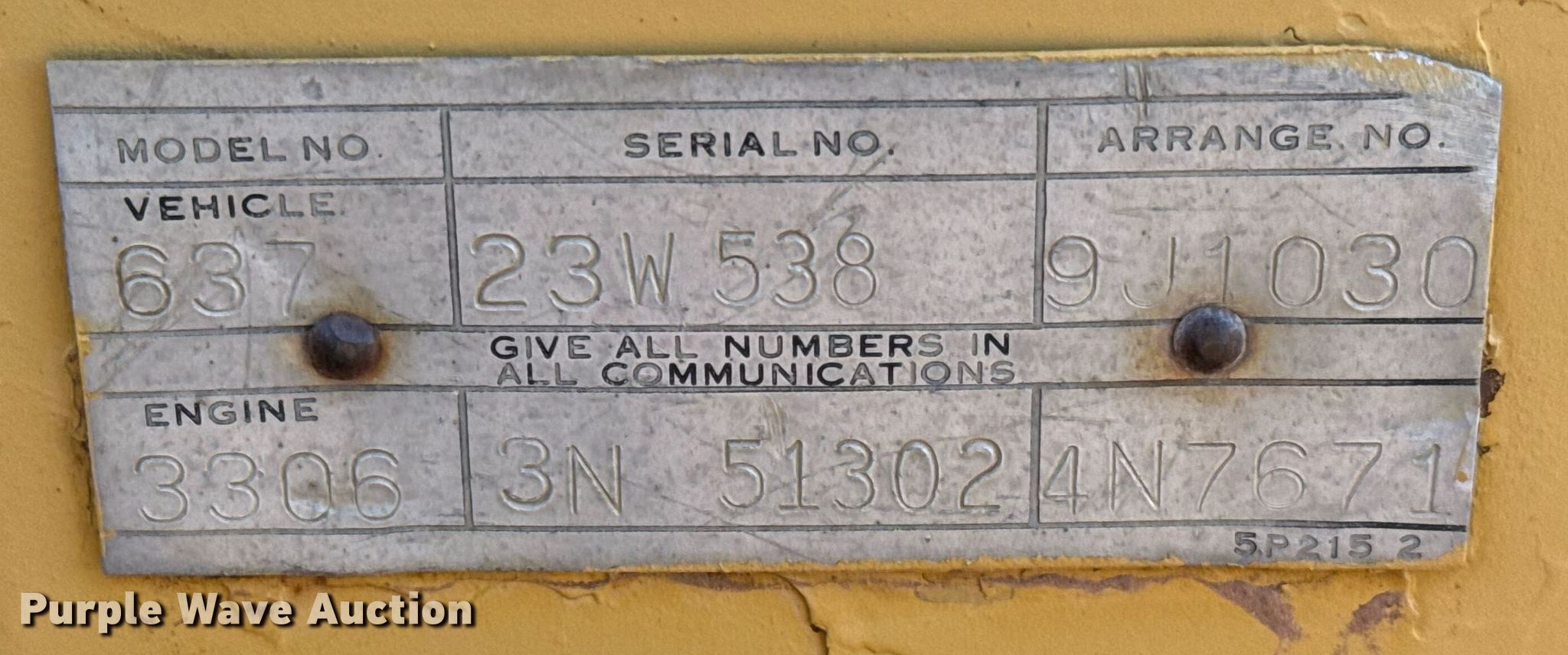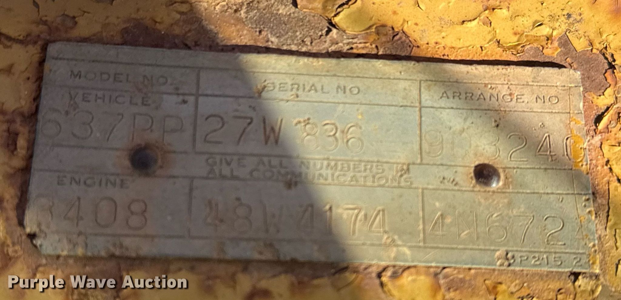 1977 Caterpillar 637D conventional scraper. Hours: 9,375 on meter, Serial: 27W836. Engine Caterpillar 3408, Displacement: 14.6L, Cylinders: 8, Fuel type: Diesel. Second engine Caterpillar 3306, Cylinders: 6, Fuel type: Diesel. Transmission Powershift, 8F - 1R. Chassis Brakes: Air. Operators station Enclosed cab. Features Hydraulic lift, Scraper controls: Lever controls No. of controls: 3, Rear push block. Tires Size: 37.25-35. Notes Non-operational unit. Norton, TX 76865