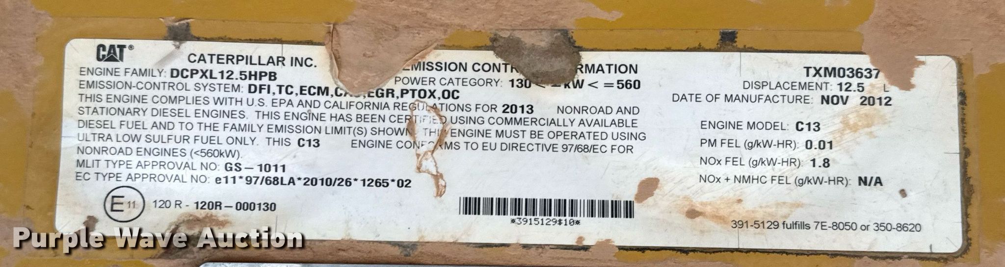 2012 Caterpillar 349EL excavator. Hours: Unknown, Serial: CAT0349EKTFG00714. Engine Caterpillar C13, Displacement: 12.5L, Cylinders: 6, Fuel type: Diesel. Transmission Hydrostatic, Two speed travel. Operators station Enclosed cab, AC, Heat, Backup camera. Features Boom Standard, Bucket Hensley, Width: 66". Tracks Width: 35.5", Steel, Grouser pads: Triple. Notes Non-operational digital odometer, Glass cracked, Engine issues, may need replaced , Non-operational unit. Norton, TX 76865