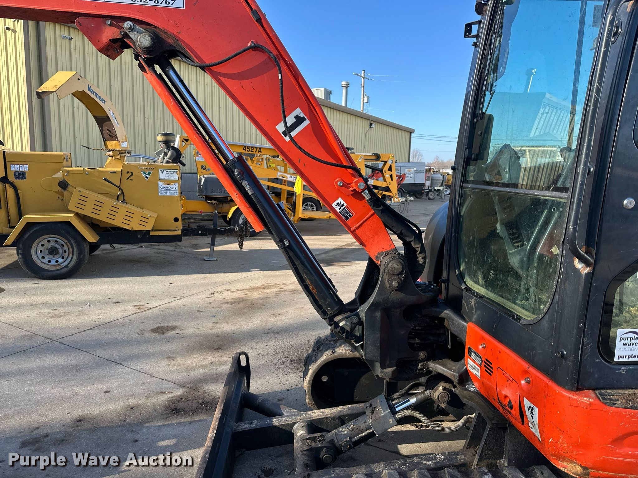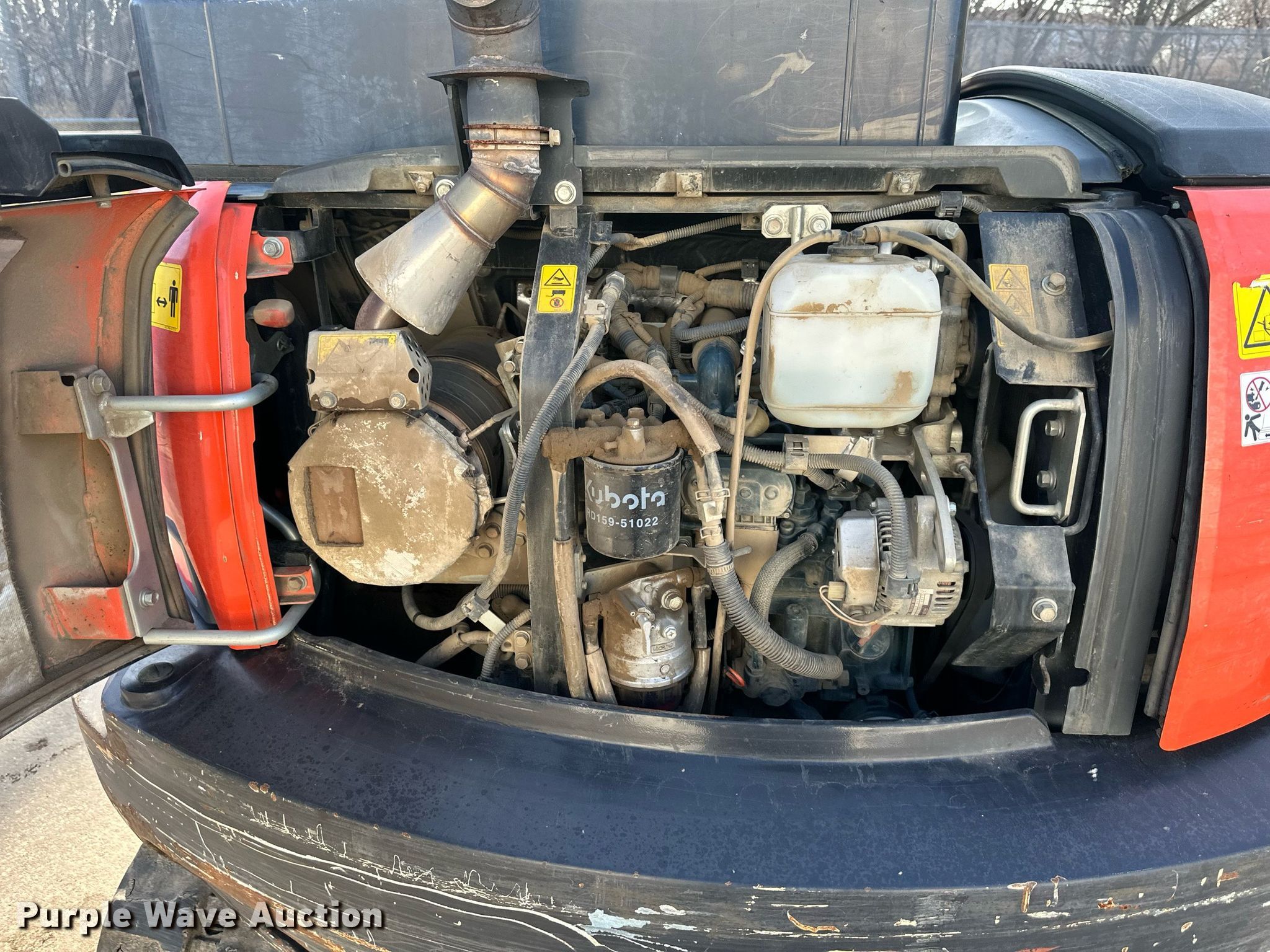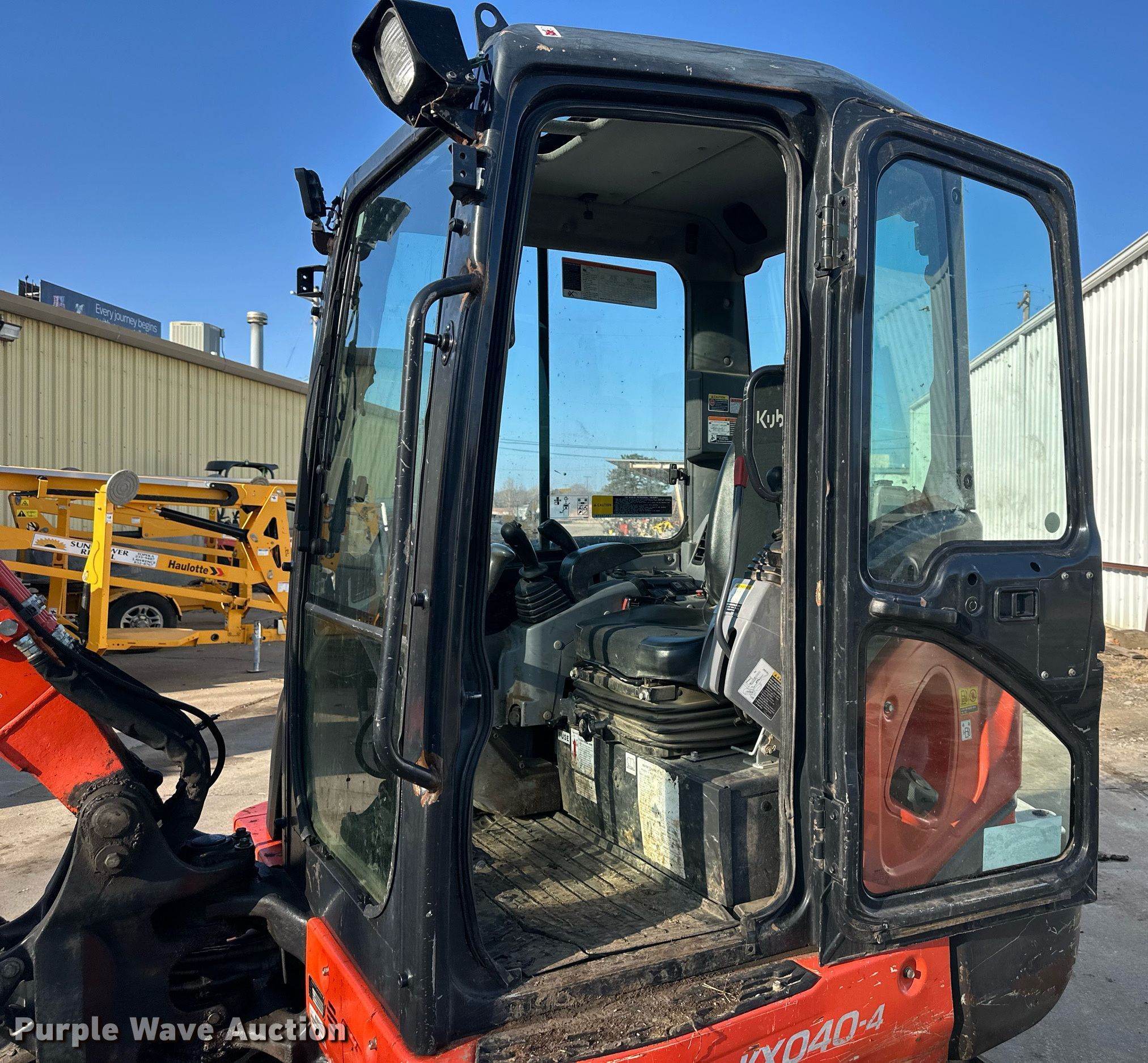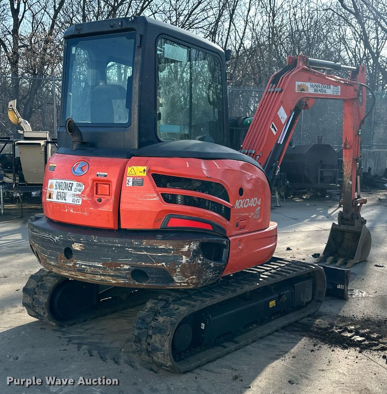 2019 Kubota KX040-4 mini excavator. Hours: 3,430 on meter, Serial: JKUK0404E01H32696. Engine Kubota, Cylinders: 3, Fuel type: Diesel. Transmission Hydrostatic. Operators station Enclosed cab, AC, Heat, Pattern changer. Features Auxiliary hydraulics, Backfill blade Width: 67", Boom Swing, Stick Stick length: 63", Quick coupler: Mechanical, Bucket Width: 18", Teeth: 4. Tracks Width: 14", Rubber. Sunflower Rental. Topeka, KS 66612