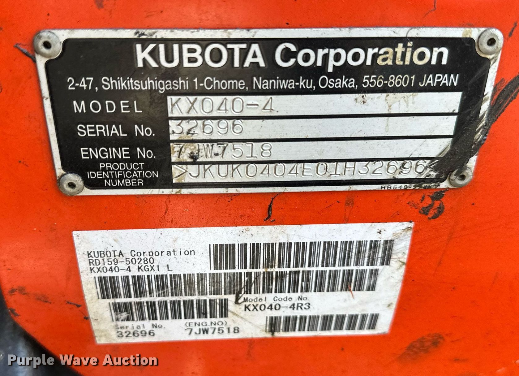 Purple Wave is selling a used Mini Excavator in Kansas. This item is a 2019 Kubota KX040-4 mini excavator with the following: Hours: 3,430 on meter, Serial: JKUK0404E01H32696