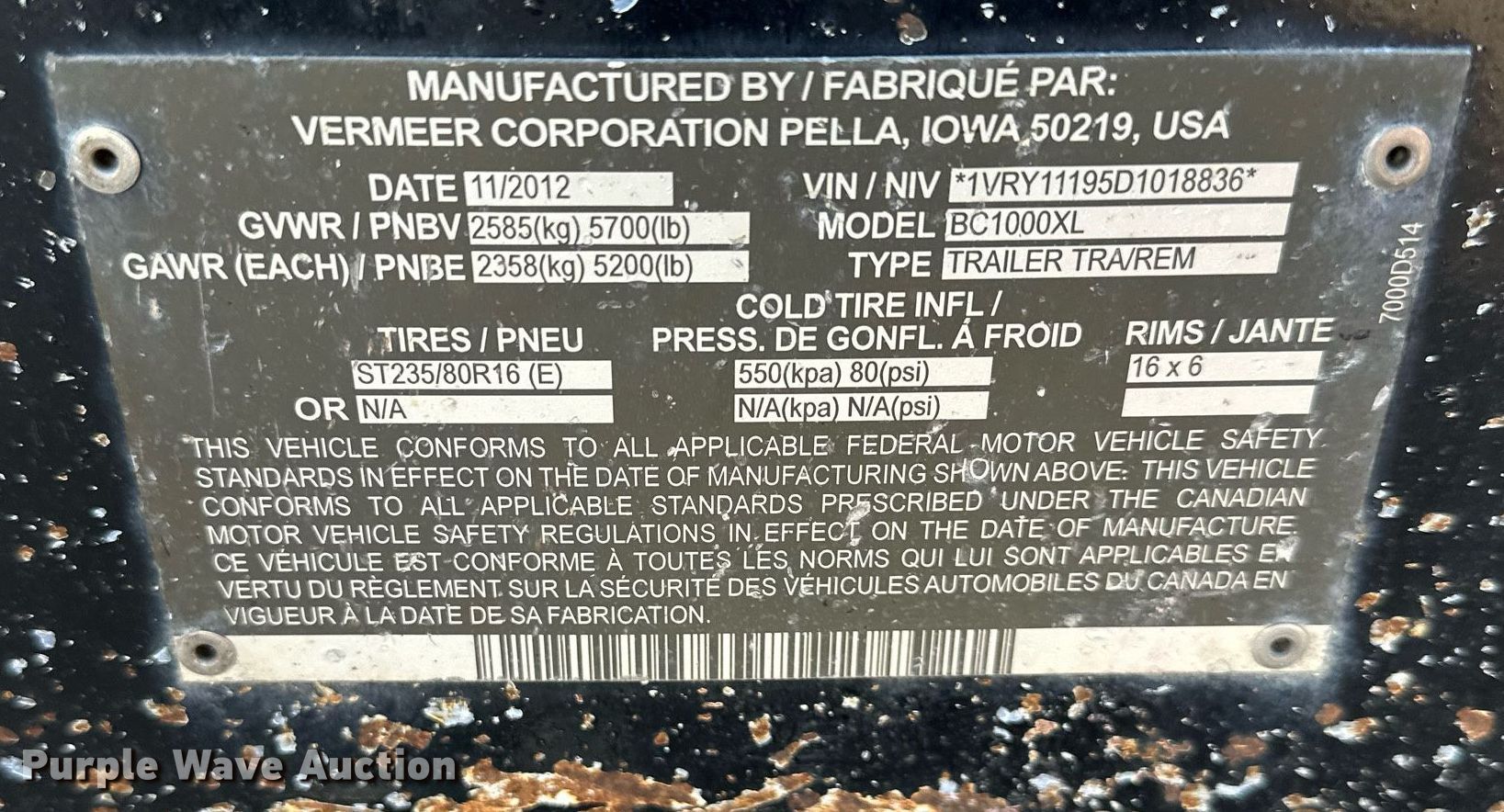 Purple Wave is selling a used Wood Chipper or Stump Grinder in Kansas. This item is a 2013 Vermeer BC1000XL wood chipper with the following: Hours: 1,901 on meter, VIN: 1VRY11195D1018836