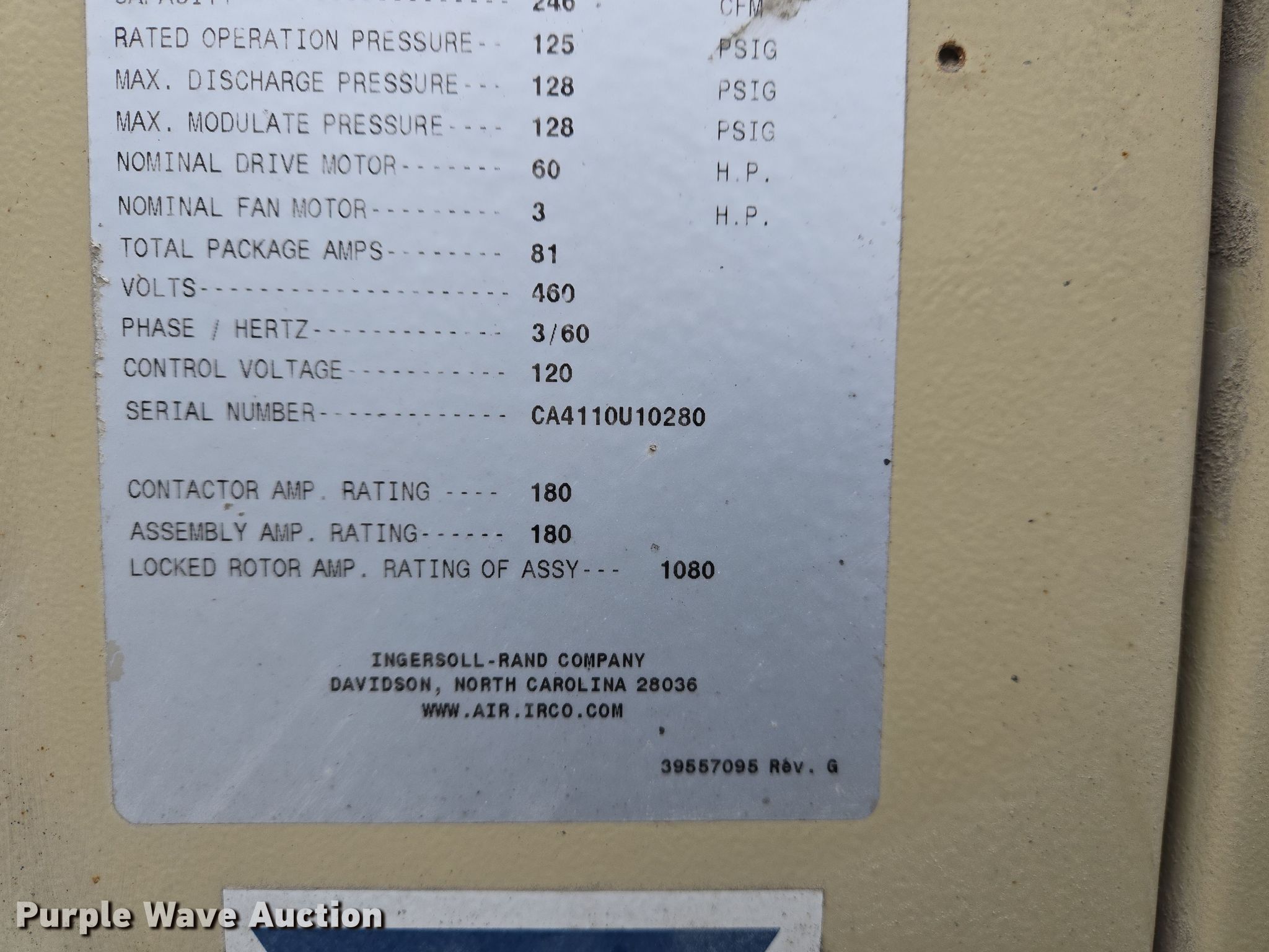 Ingersoll-Rand SSR EP60 air compressor. Hours: Unknown, Serial: CA4110U10280, Unit #: 3. Electric Motor Ingersoll-Rand, HP: 60, Volts: 230/400/460, Phase: Three. Features Air compressor Ingersoll-Rand, CFM: 246, PSI: 125, Skid mounted. Notes Non-operational unit. Runyon Industries. Memphis, TN 38127