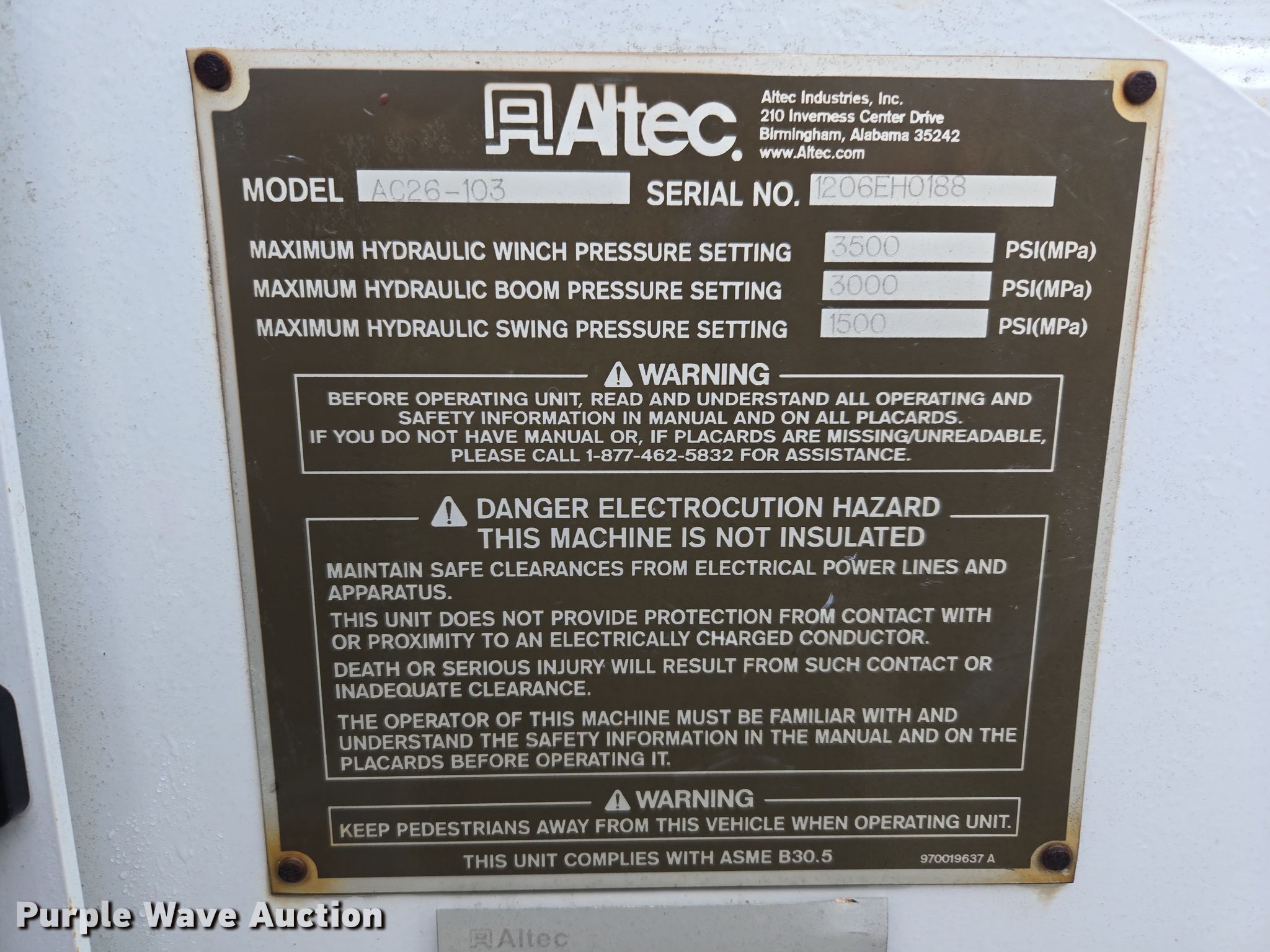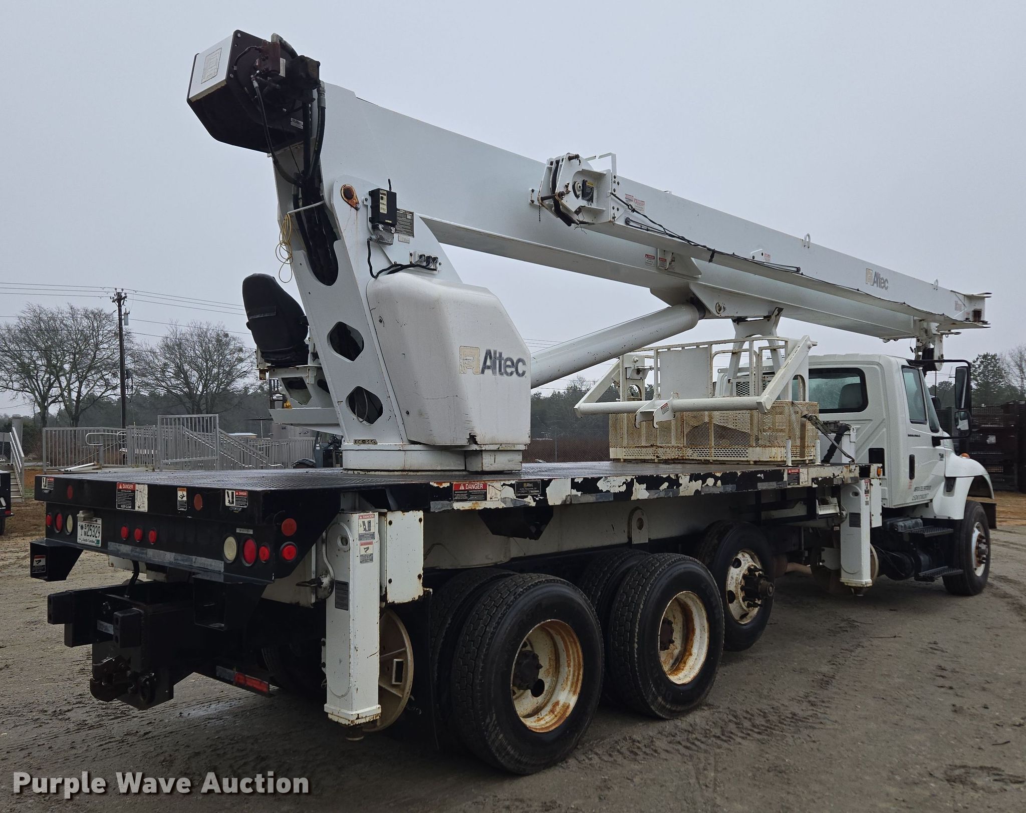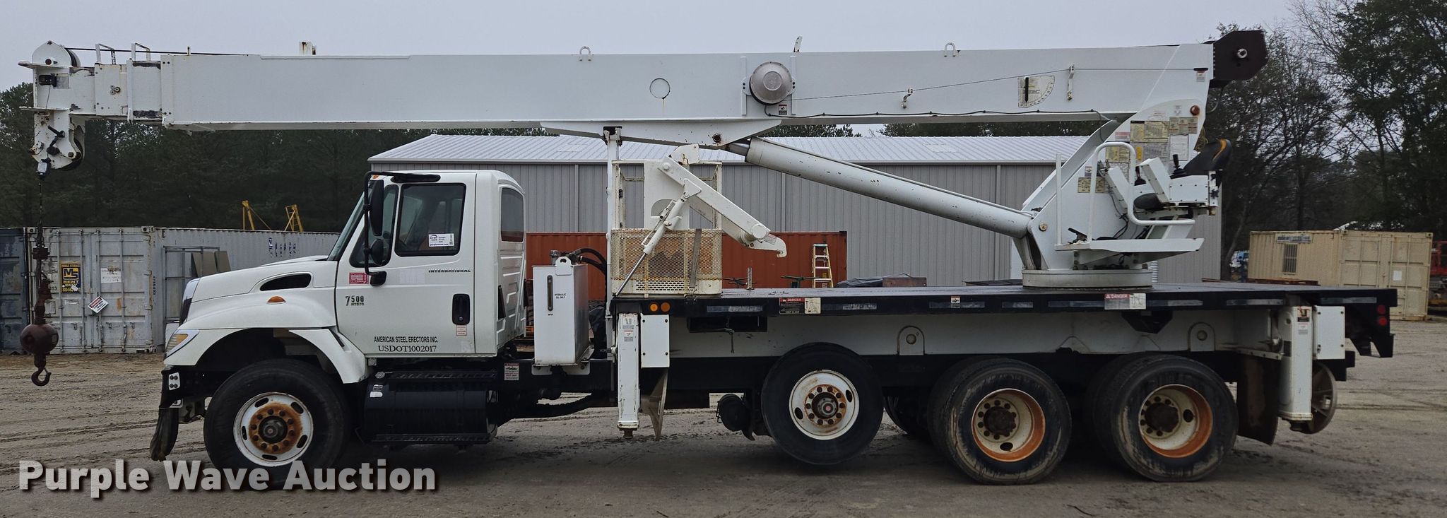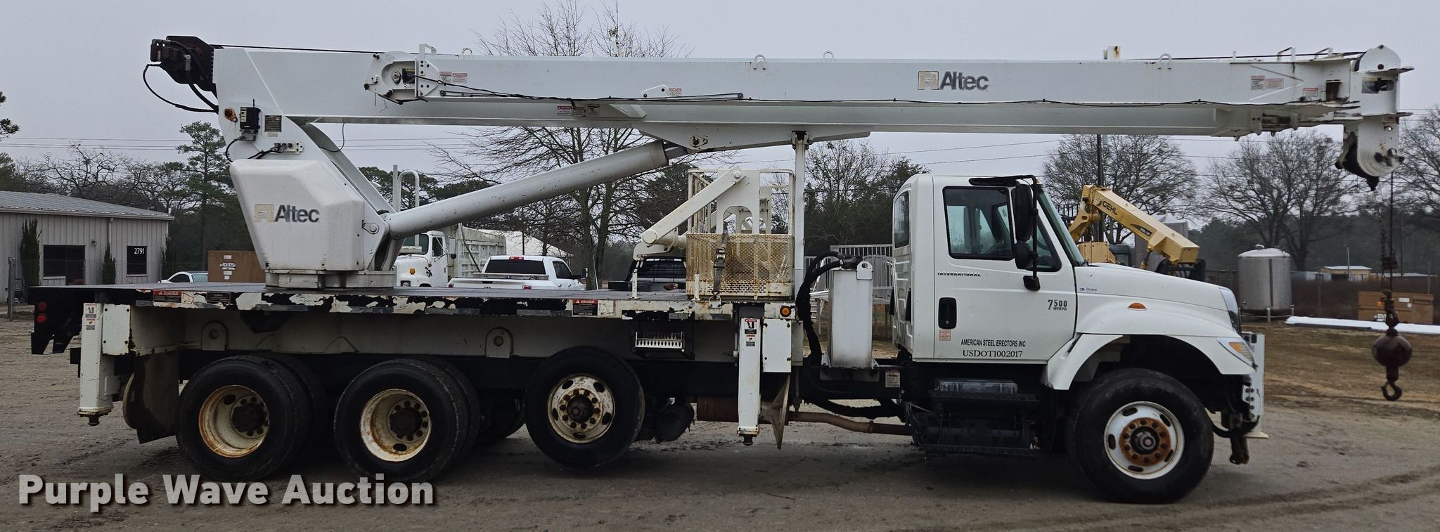 2007 International 7500 crane truck. Miles: Unknown, VIN: 1HTWNAZT87J430784. Engine International D340, Serial: 570HM2U2137279, Displacement: 9.3L, Cylinders: 6, Fuel type: Diesel. Transmission Eaton Fuller 8LL, Manual, Speed: 10. Chassis Axles: Tandem, Pusher axle, Suspension: Spring over walking beam, Brakes: Air, PTO. Interior AC, Heat, Cruise control. Features Flatbed Altec, 20' 11" L x 96" W, Crane Altec AC26-103S, Boom Telescopic, Maximum boom length: 103' Sections: 4, Maximum lift capacity: 52,000 lbs, Jib: 44', Boom controls, Crane block Sheaves: 2, Capacity: 26 tons, Crane ball & hook, Lift chart. Tires Front: 315/80R22.5, Rear: 11R22.5, Lift axle: 11R22.5. Notes Additional parts included Basket, Crane block, Jib, Dash warning indicator: Check engine, ABS, Fuel filter, ECM issues, Dead battery, Engine issues, misfires. South Carolina title. Mileage has not been verified. Odometer discrepancy will be marked on the title. Title distribution may be delayed up to 14 days from verification of funds. American Steel Erectors Inc.. Aiken, SC 29805