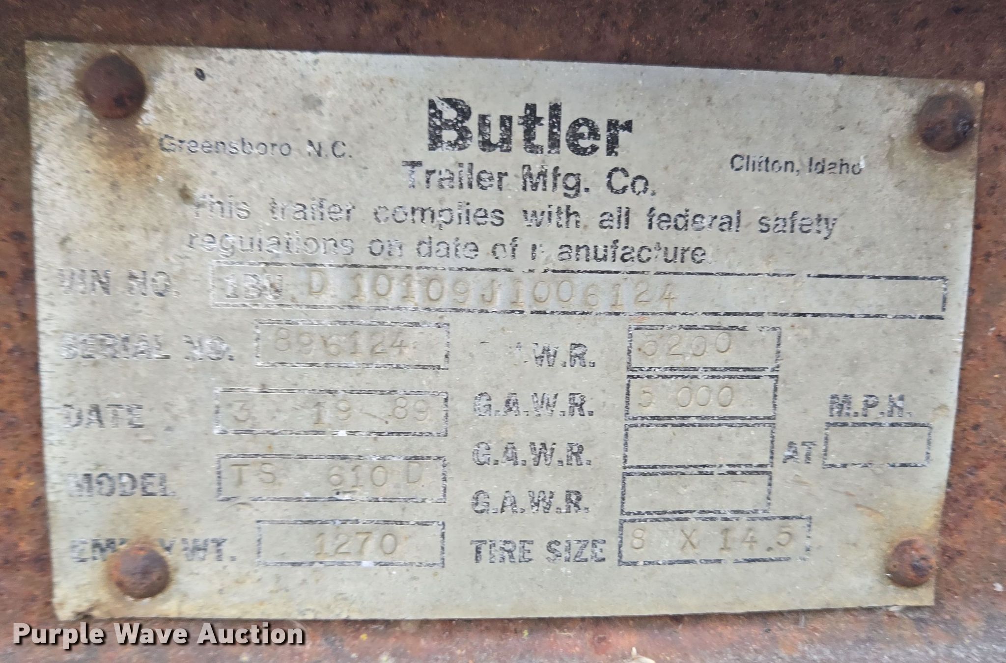 Purple Wave is selling a used Car or Utility Trailer in Indiana. This item is a 1989 Butler TS 610D utility trailer with the following: VIN: 1BUD10109J1006124, Unit #: 89863