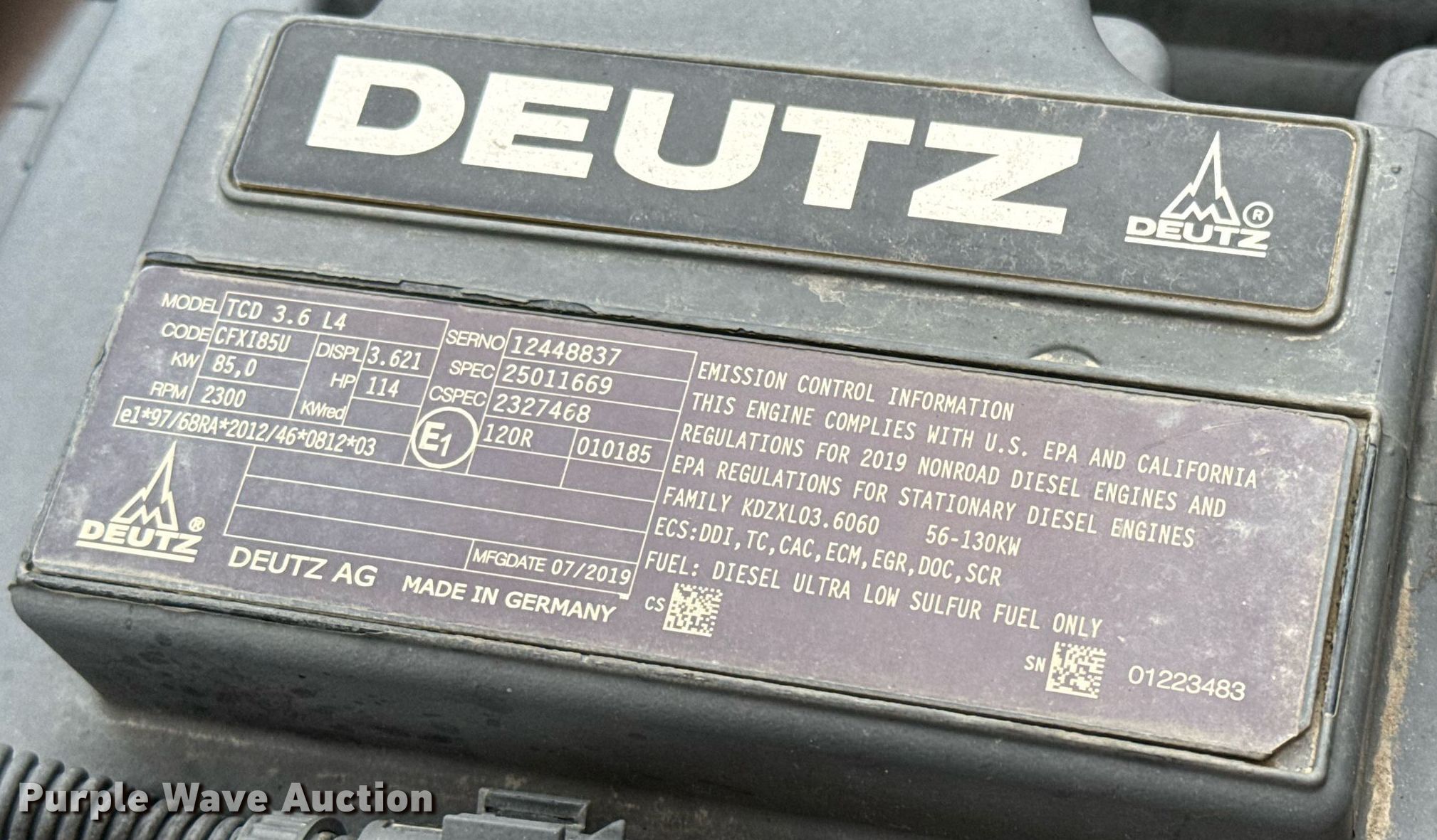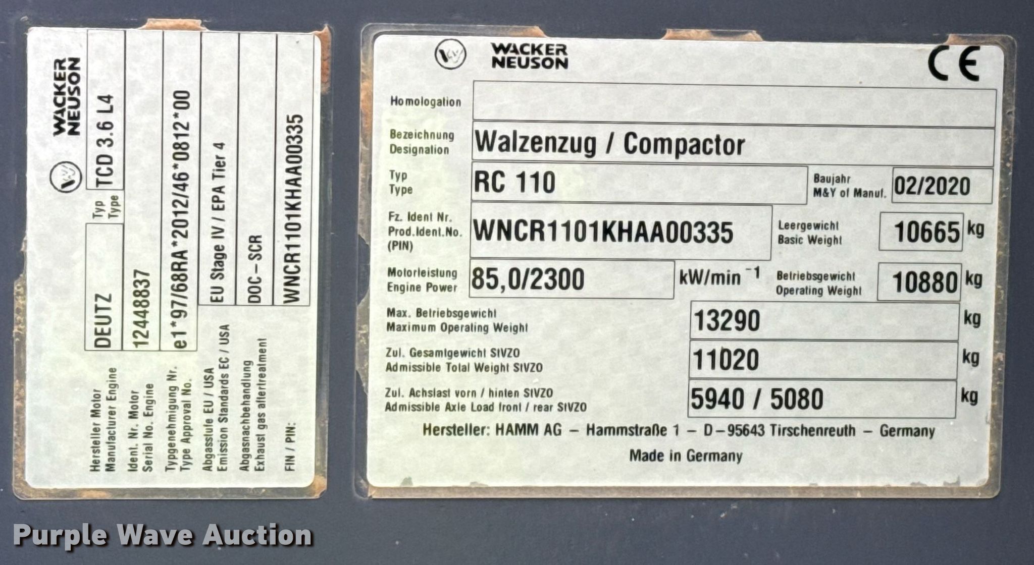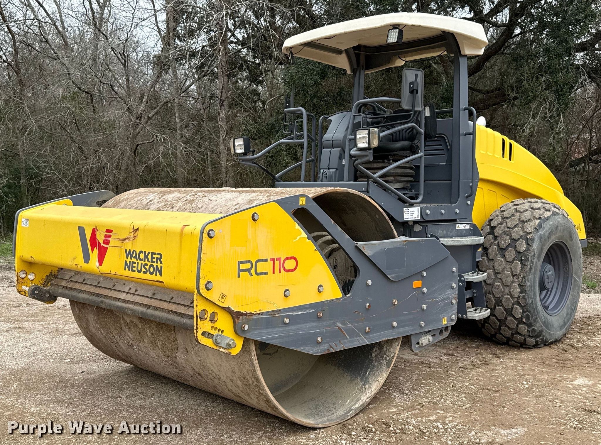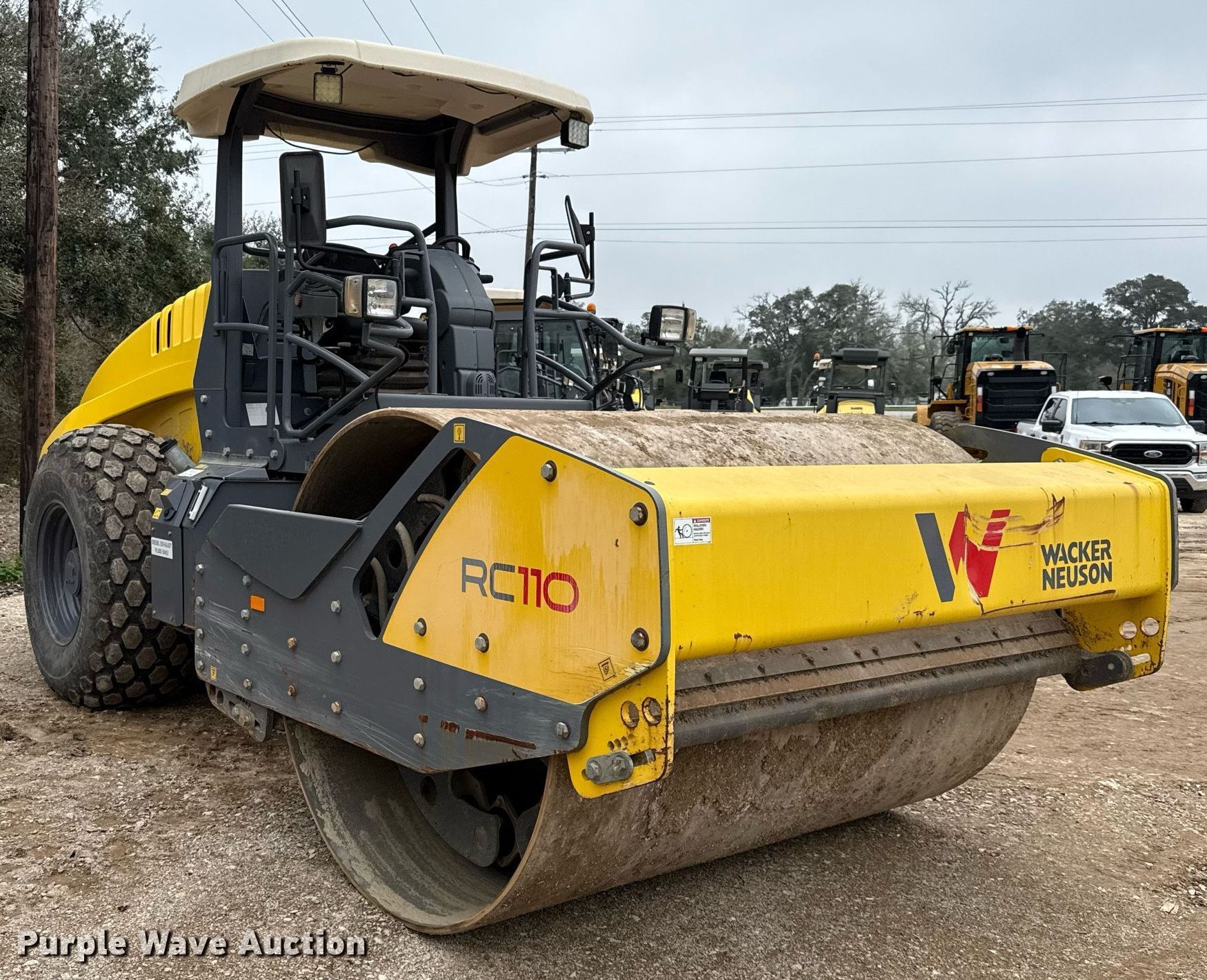 2020 Wacker Neuson RC110 single drum vibratory roller. Hours: 484 on meter, Serial: WNCR1101KHAA00335. Engine Deutz TCD 3.6 L4, Serial: 12448837, Displacement: 3.621L, Cylinders: 4, Fuel type: Diesel, HP: 114, kW: 85. Transmission Hydrostatic. Operators station OROPS. Features Drum: Smooth, Vibratory system: Single, Two speed, Front drum Width: 84", Diameter: 59", Drum scrapers: Front. Tires Size: 23.1-26. Dealer Inventory. Sweeny , TX 77480