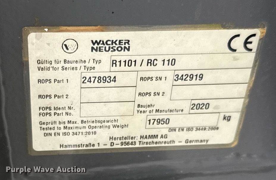 Purple Wave is selling a used Single Drum Roller Compactor in Texas. This item is a 2020 Wacker Neuson RC110 single drum vibratory roller with the following: Hours: 484 on meter, Serial: WNCR1101KHAA00335