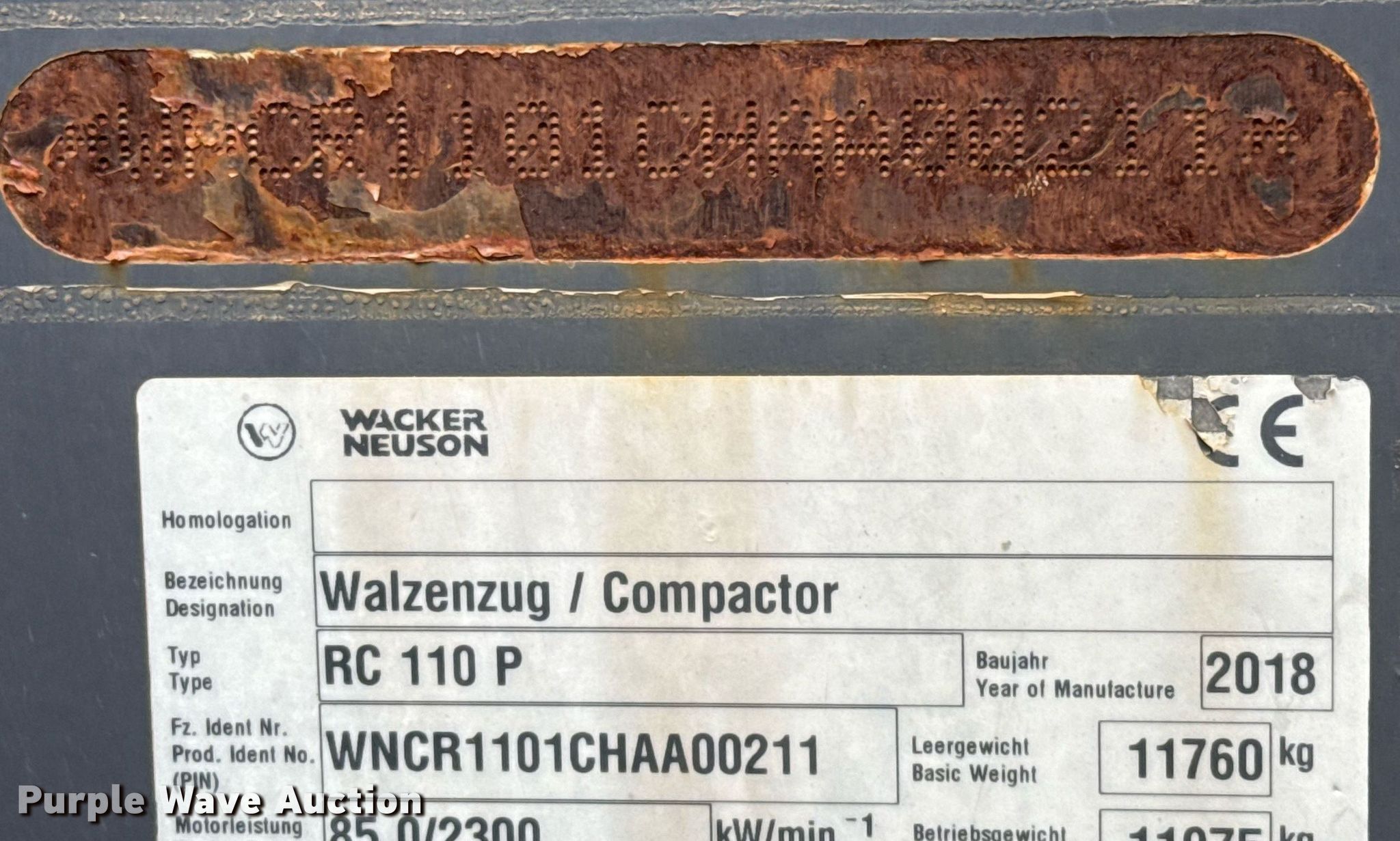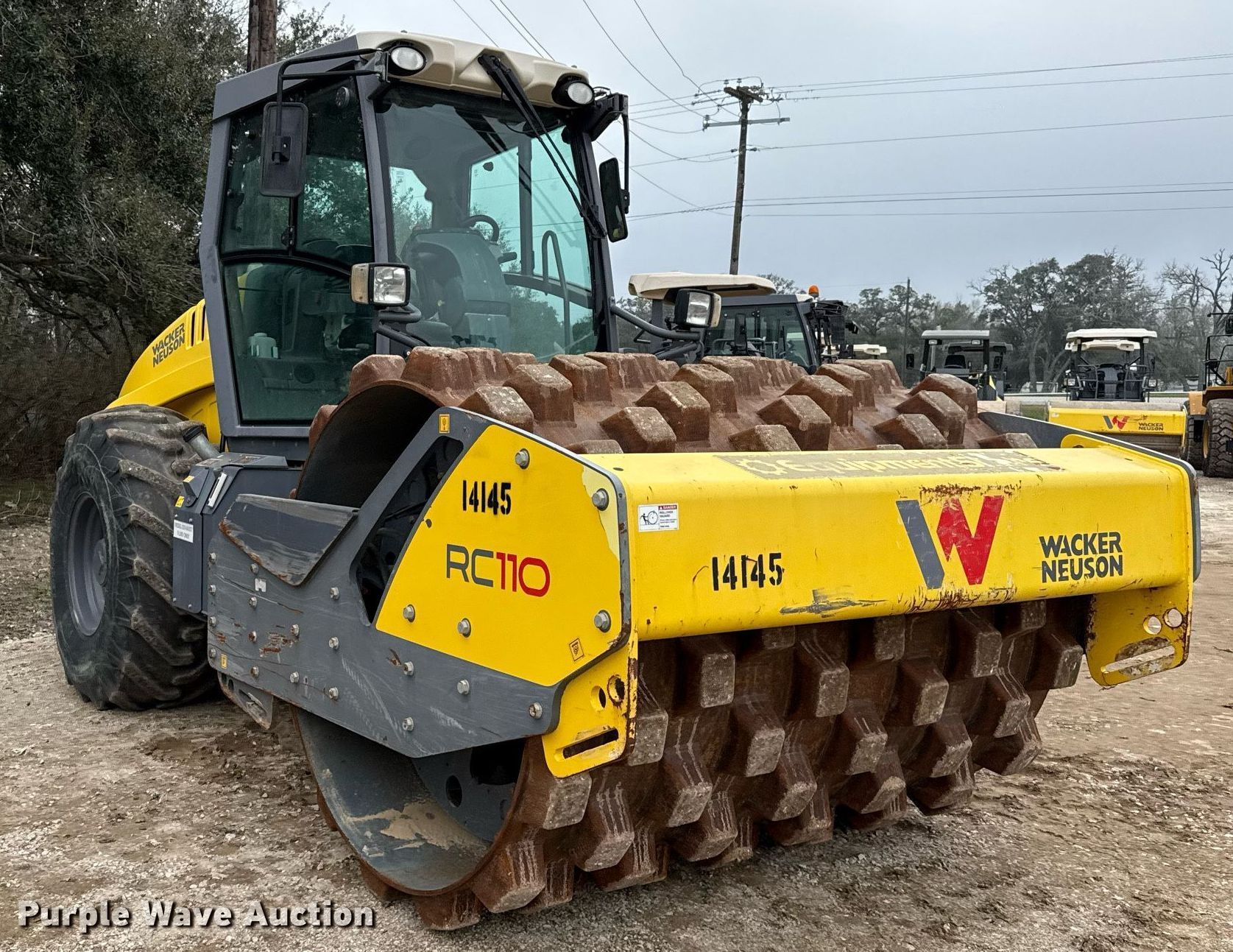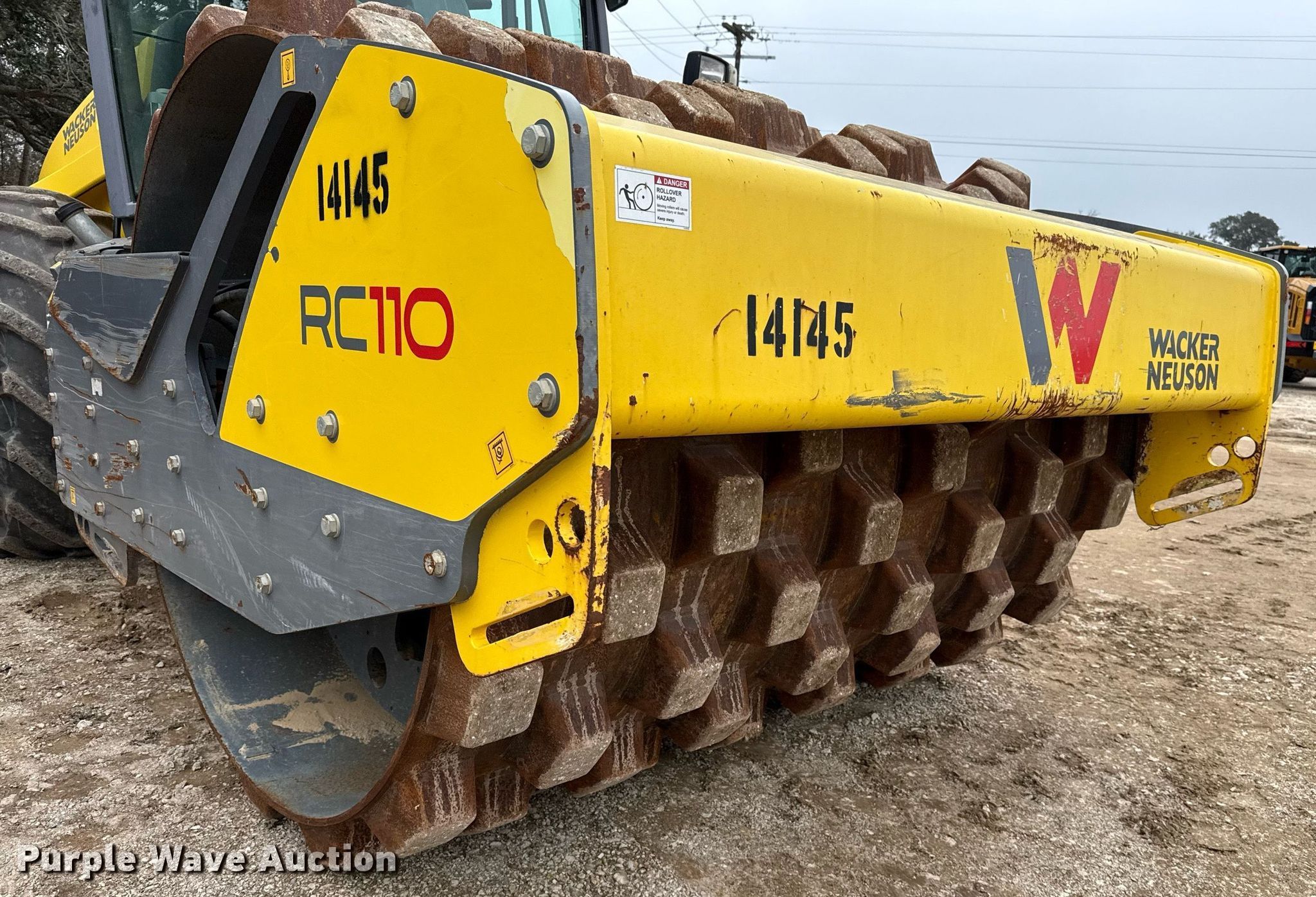 2018 Wacker Neuson RC110P single drum vibratory roller. Hours: 2,503 on meter, Serial: WNCR1101CHAA00211. Engine Deutz TCD 3.6 L4, Serial: 12195336, Displacement: 3.621L, Cylinders: 4, Fuel type: Diesel, HP: 114, kW: 85. Transmission Hydrostatic. Operators station Enclosed cab, AC, Heat. Features Drum: Padfoot, Vibratory system: Single, Two speed, Front drum Width: 84", Diameter: 66". Tires Size: 23.1-26. Dealer Inventory. Sweeny , TX 77480