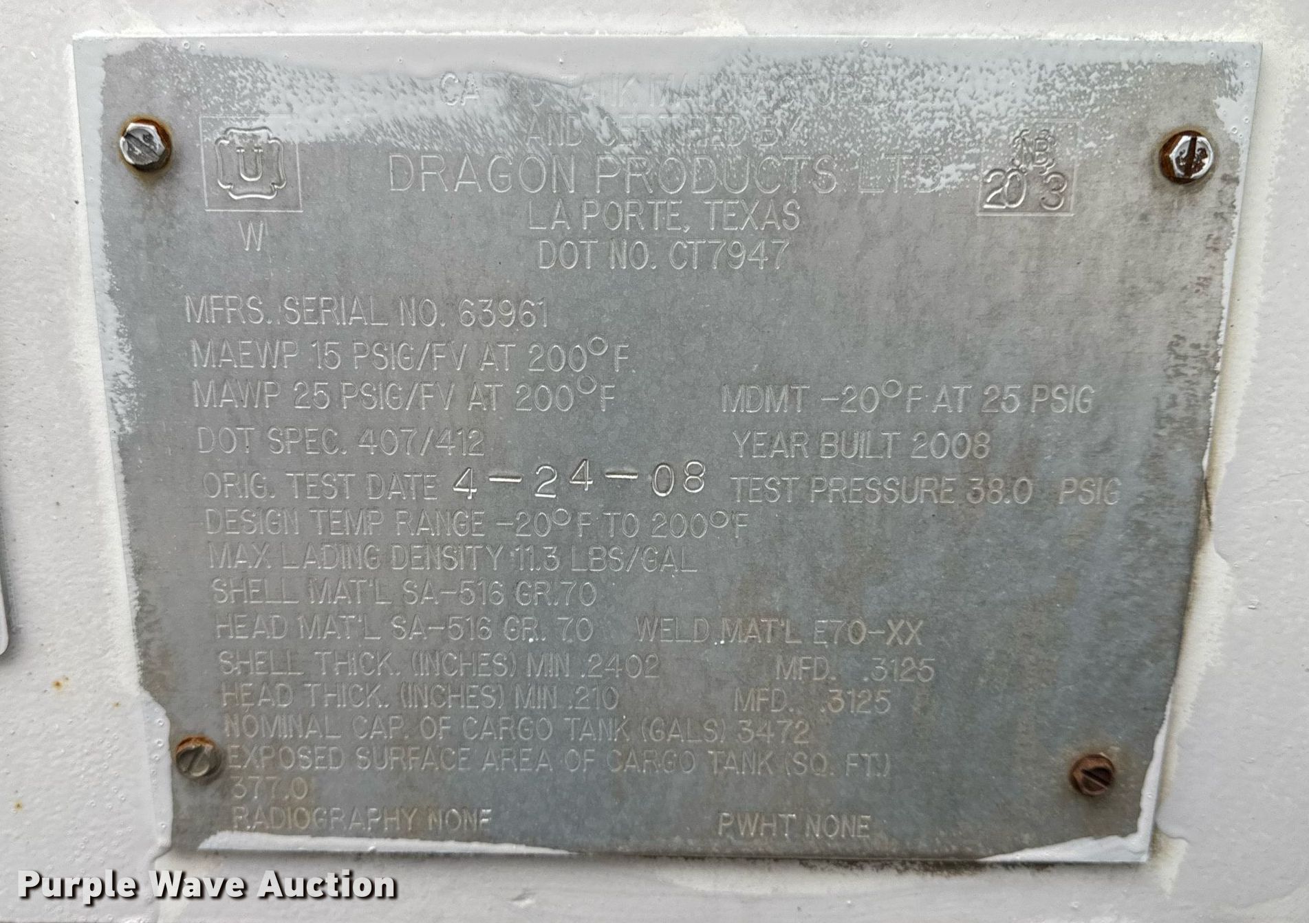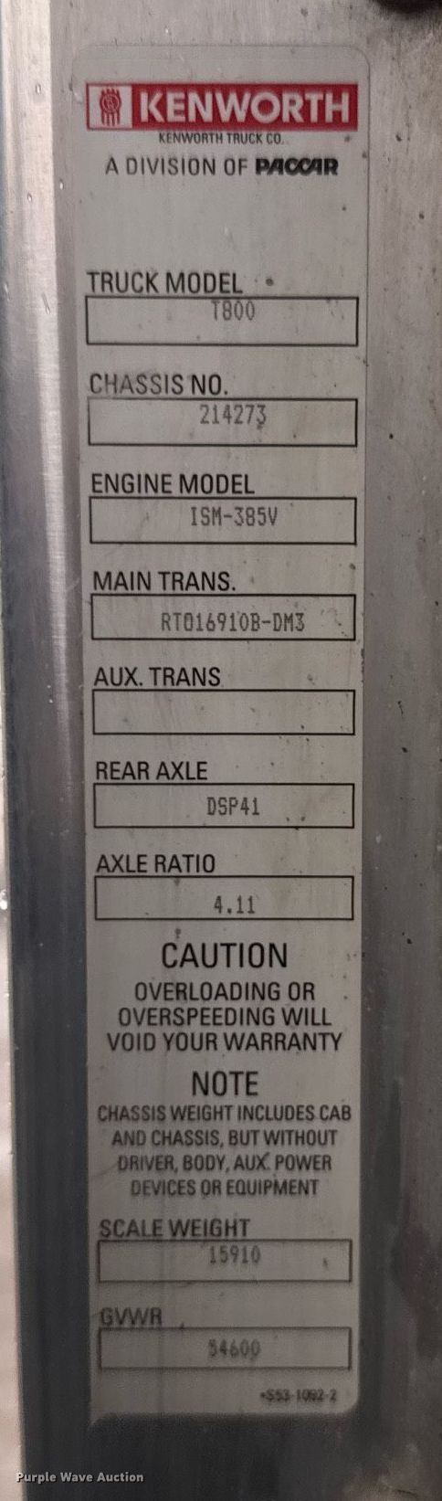 2007 Kenworth T800 vacuum truck. Miles: 184,129 on odometer, Hours: 21,414 on meter, VIN: 1NKDL09X27J214273. Engine Cummins, Displacement: 10.8L, Cylinders: 6, Fuel type: Diesel. Transmission Automatic. Chassis Axles: Tandem, Differential lock: Inter-axle, Suspension: Air, Brakes: Air, PTO, GVWR: 54,600 lbs. Interior AC, Heat, Power windows, Cruise control. Features Tank bed 2008 Dragon Products, Capacity: 3,472 gallons, Top hatches: 2, Vacuum pump Fruitland 500LSFH, Serial: 539933. Tires Front: 315/80R22.5, Rear: 11R22.5. Notes Windshield chipped or cracked. Oklahoma title. Seller is an Oklahoma licensed motor vehicle dealer. Title will be assigned and distributed by the dealer. Please contact the seller for distribution questions. Collinsville, OK 74021