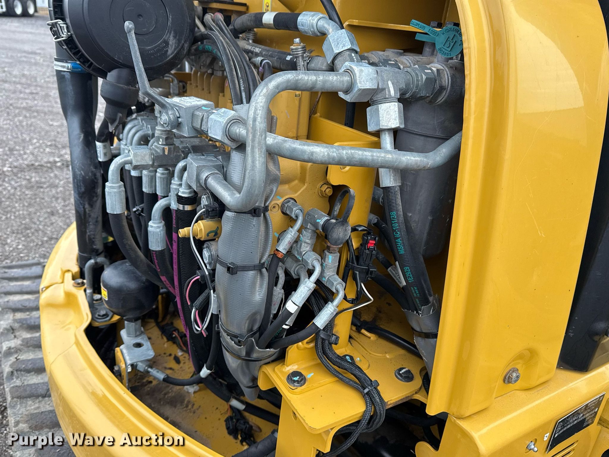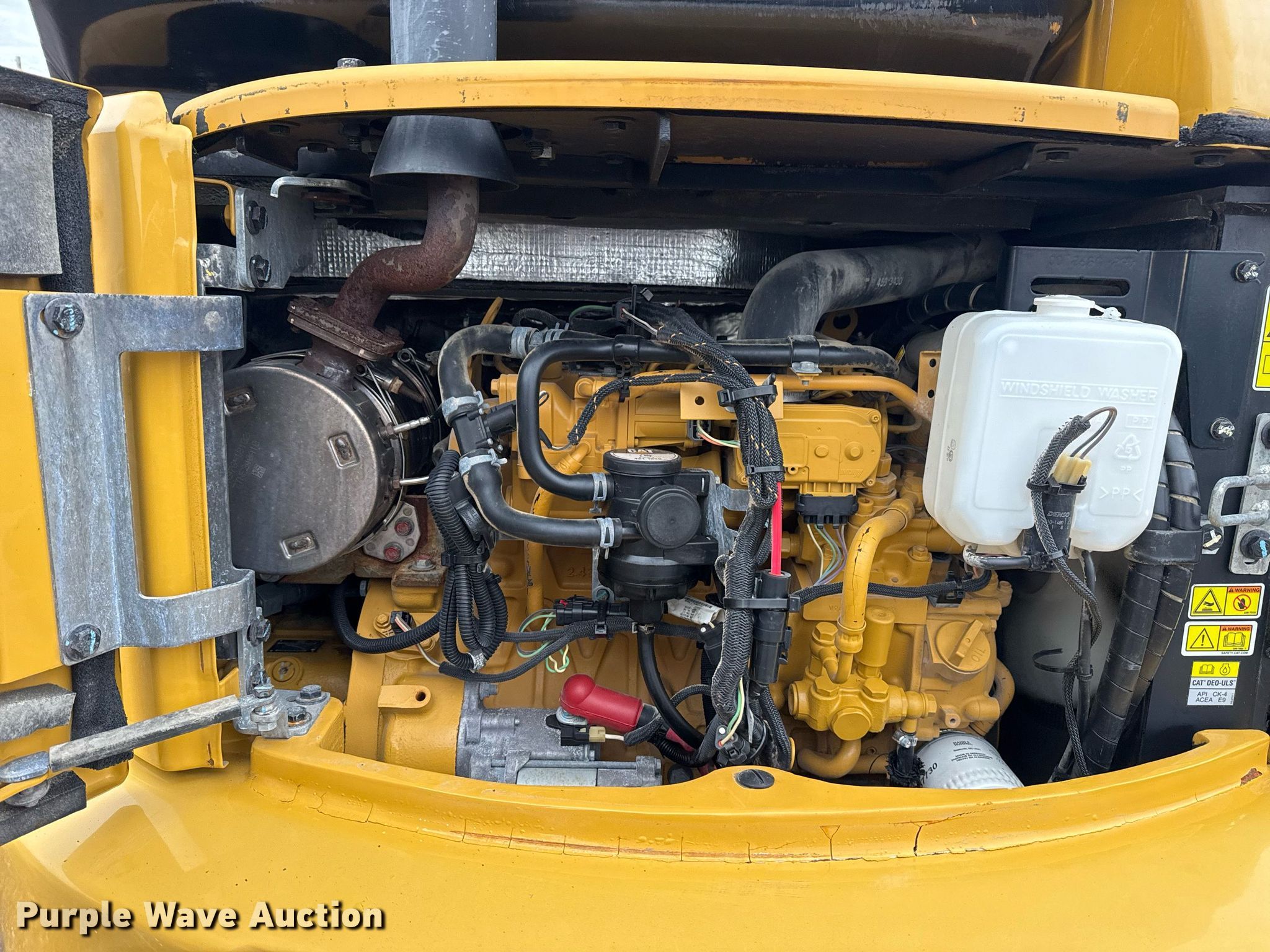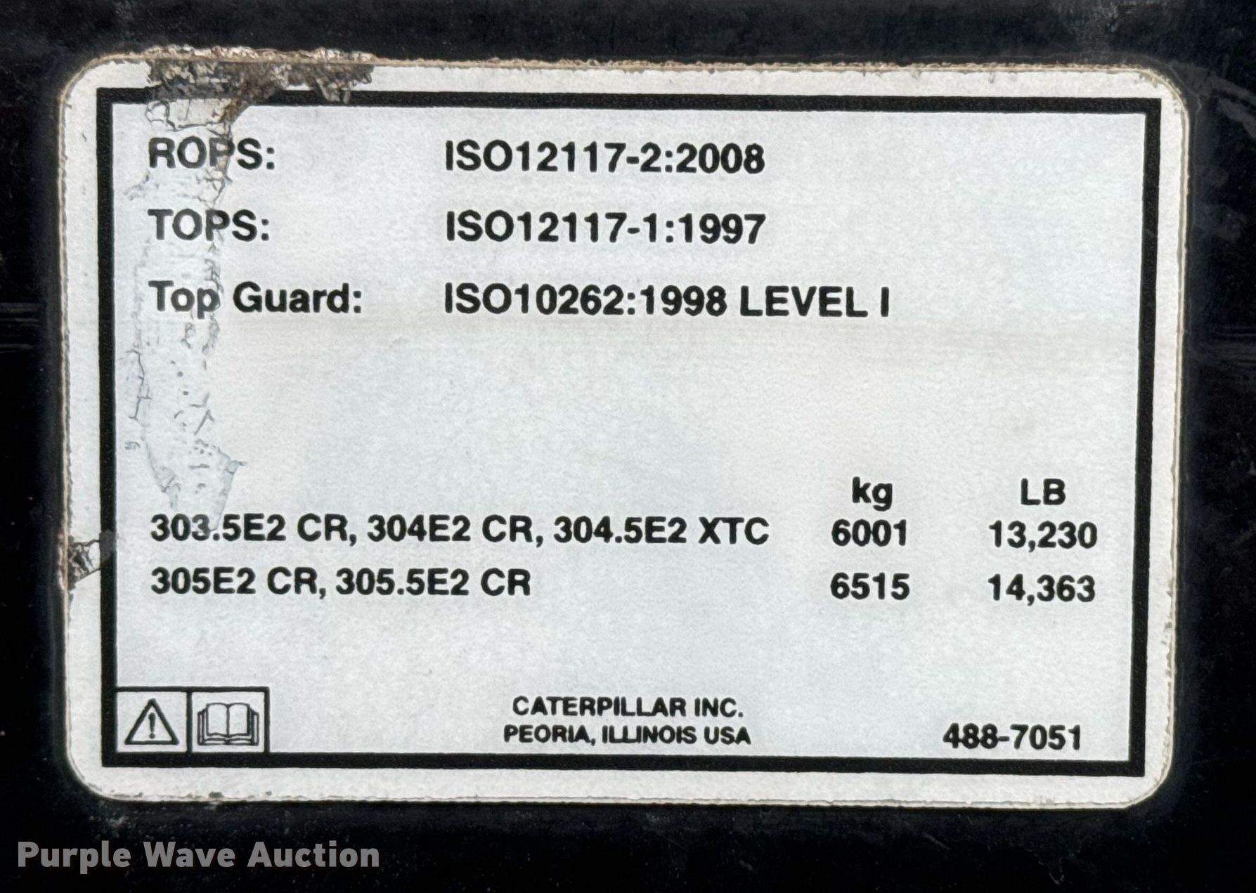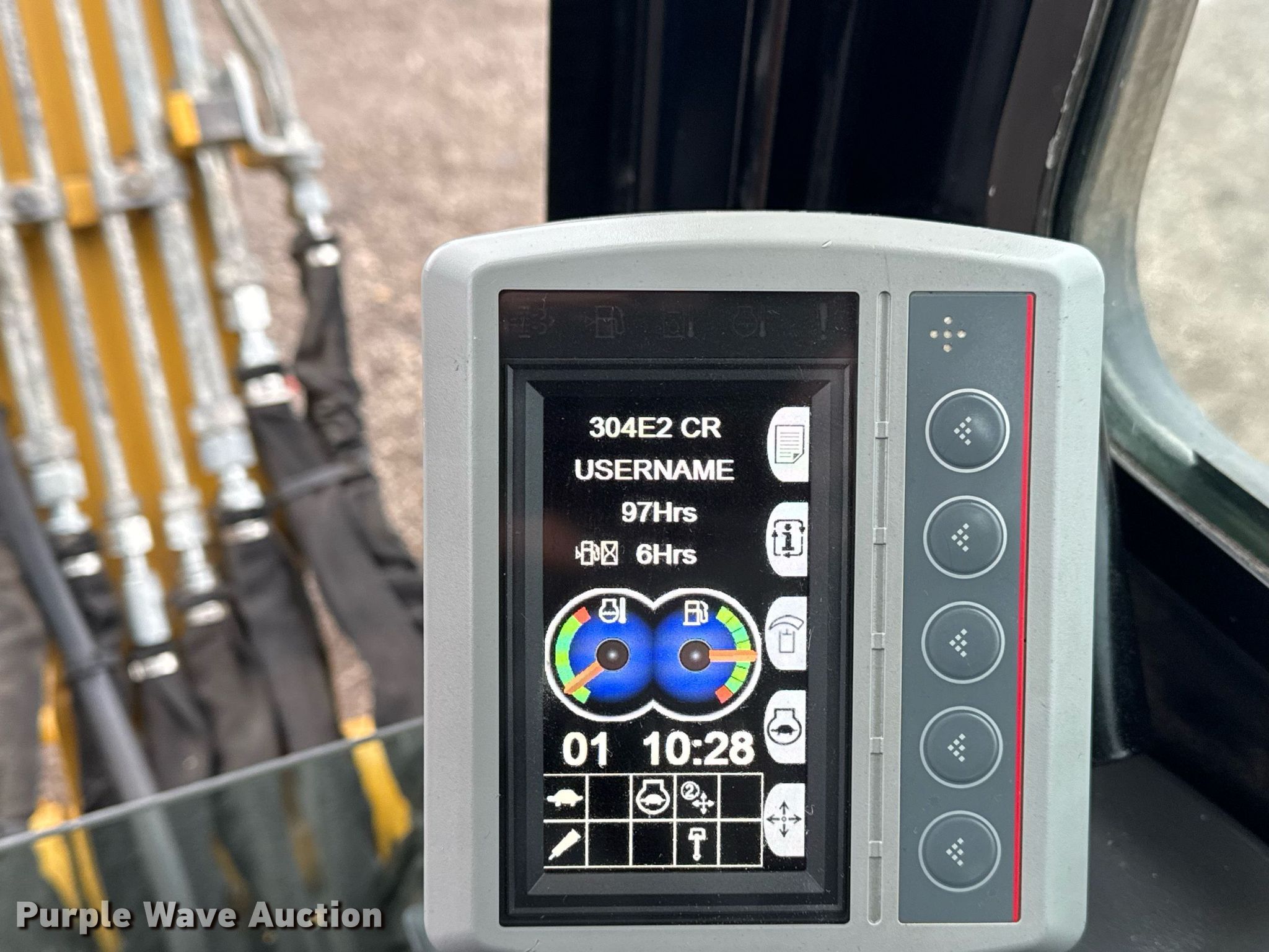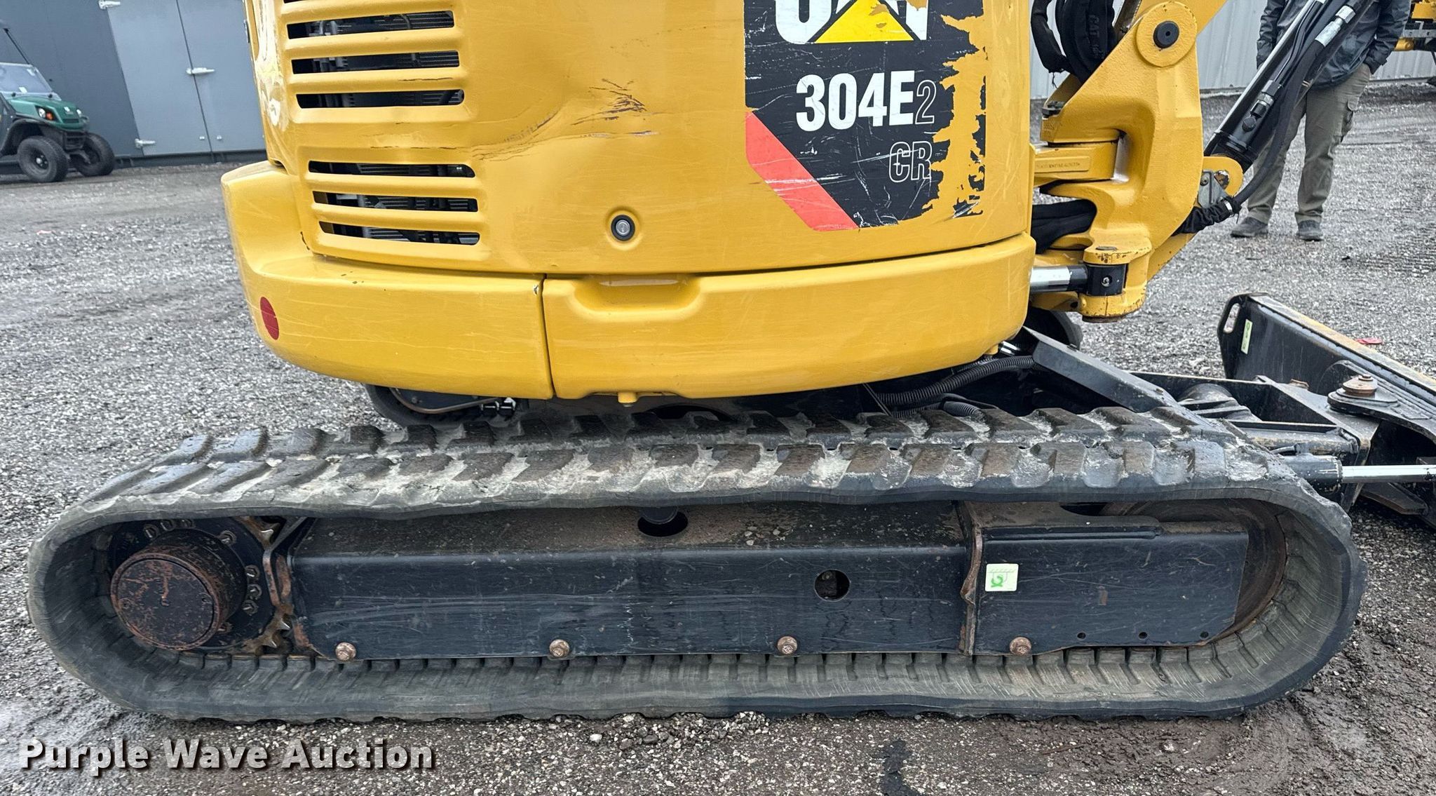 2018 Caterpillar 304E2 CR mini excavator. Hours: 3,123 on meter, Serial: CAT0304EVME403633. Engine Caterpillar, Cylinders: 4, Fuel type: Diesel. Transmission Hydrostatic, Two speed travel. Operators station Enclosed cab, AC, Heat, Backup camera, Pattern changer. Features Auxiliary hydraulics, Backfill blade Width: 77", Boom Swing, Stick Stick length: 65", Quick coupler: Mechanical, Bucket Caterpillar, Width: 17", Teeth: 4. Tracks Width: 14", Rubber. Notes Front glass missing. Collinsville, OK 74021
