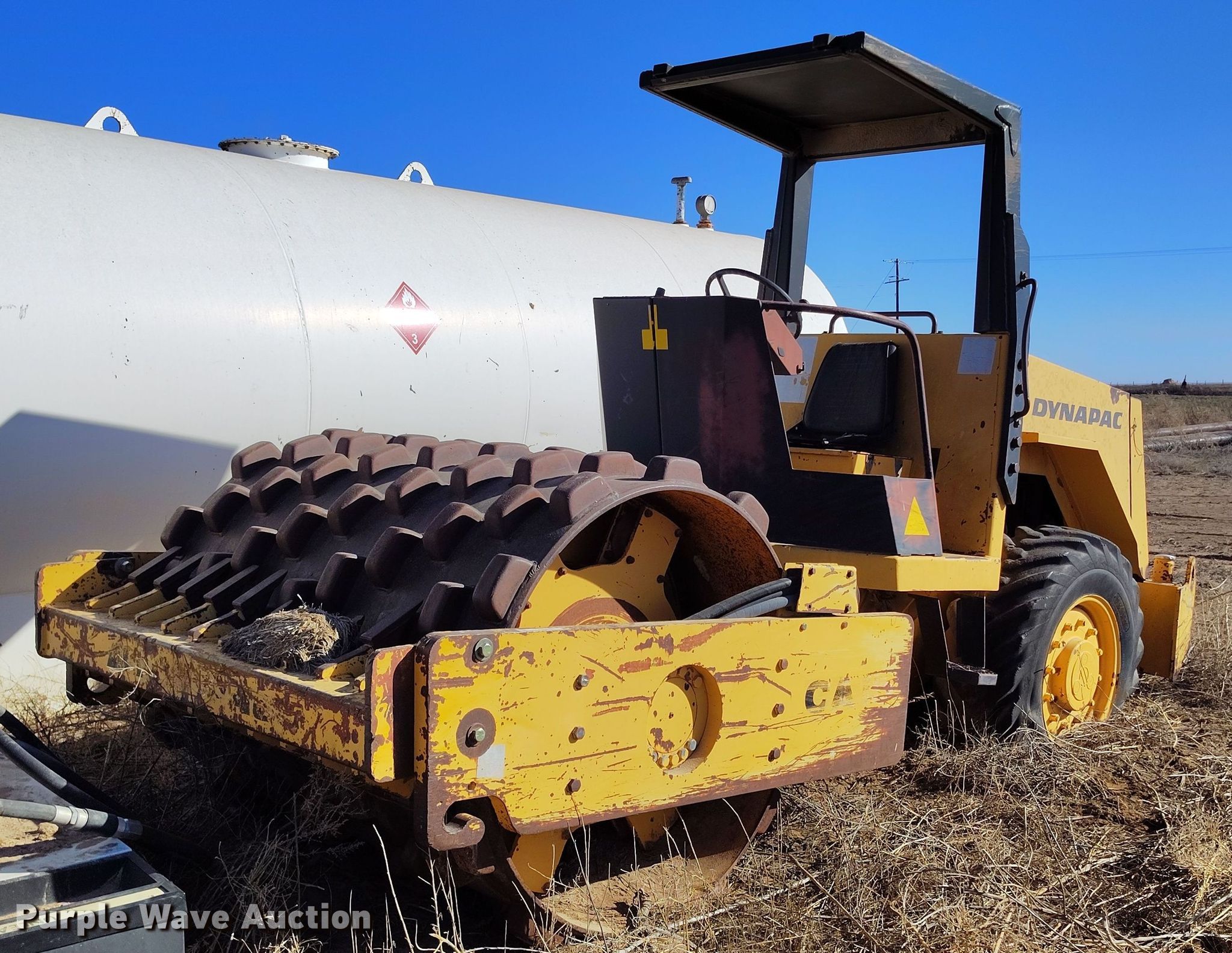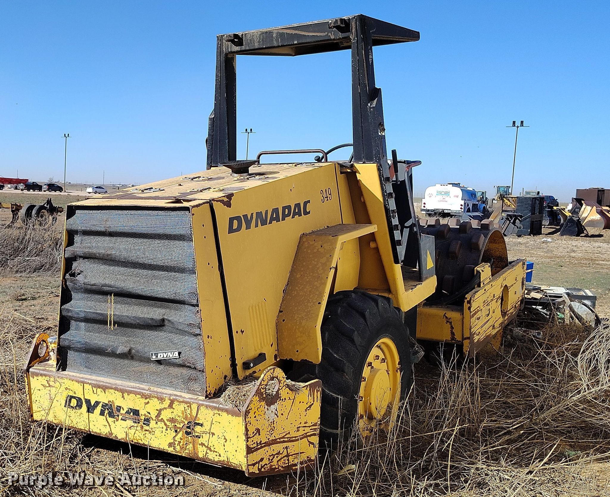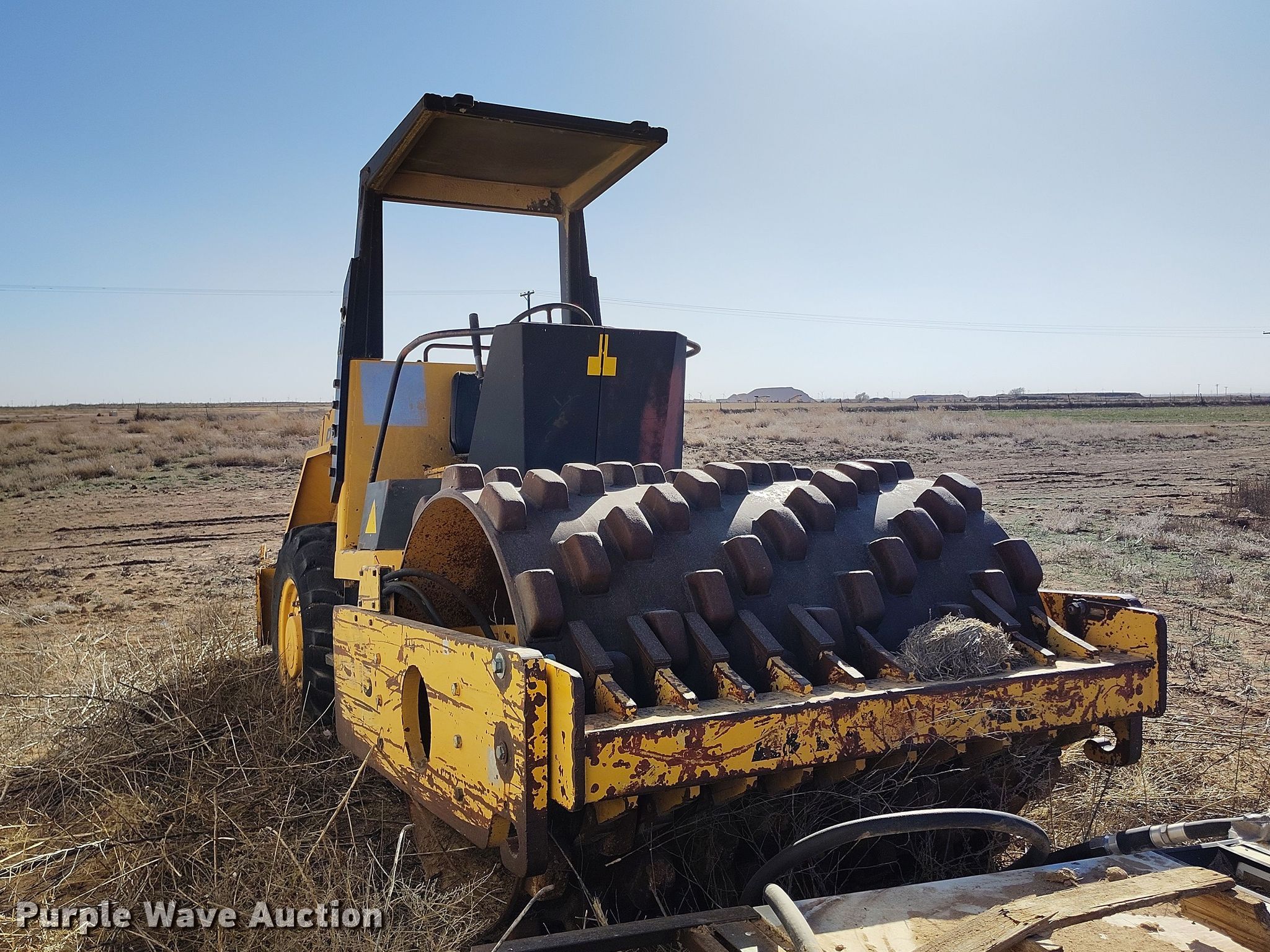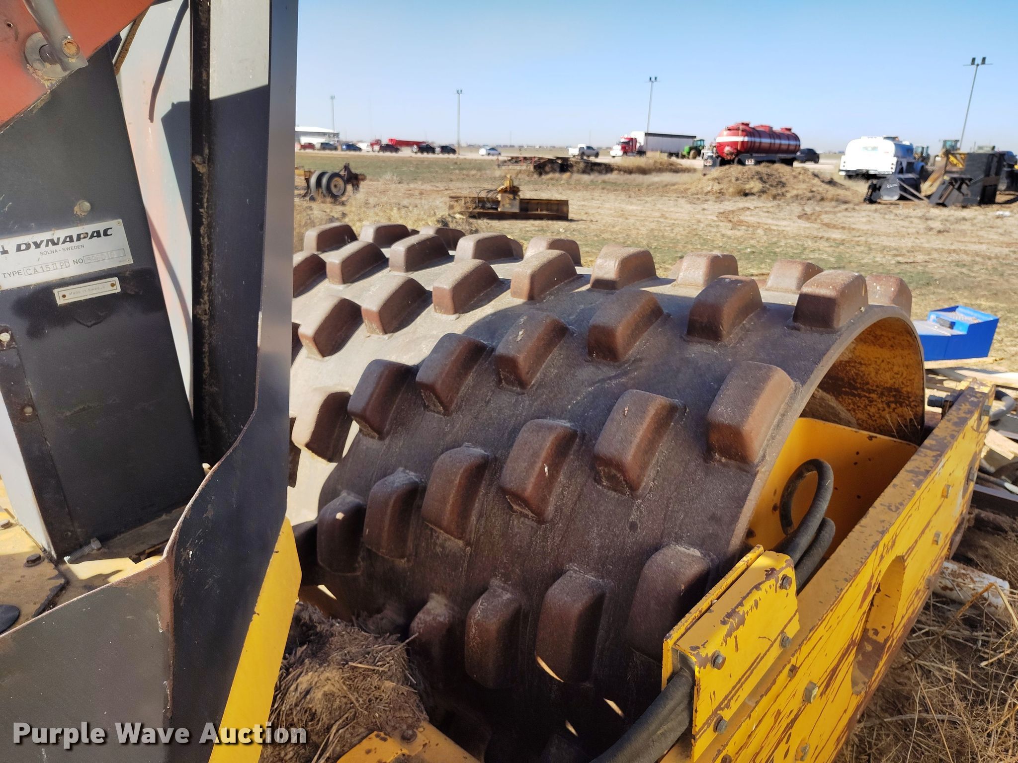 Dynapac CA15 II PD single drum vibratory roller. Hours: 1,850 on meter, Serial: 598018. Engine Cummins, Displacement: 3.9L, Cylinders: 4, Fuel type: Diesel. Transmission Hydrostatic. Features Drum: Padfoot, Vibratory system: Single, Front drum Width: 65", Diameter: 47", Drum scrapers: Front. Tires Size: 14.9/13-24. Notes Dead battery, Parts may be missing, Flat tires, Unknown operating condition. Reinert Hay Company. Hereford, TX 79045