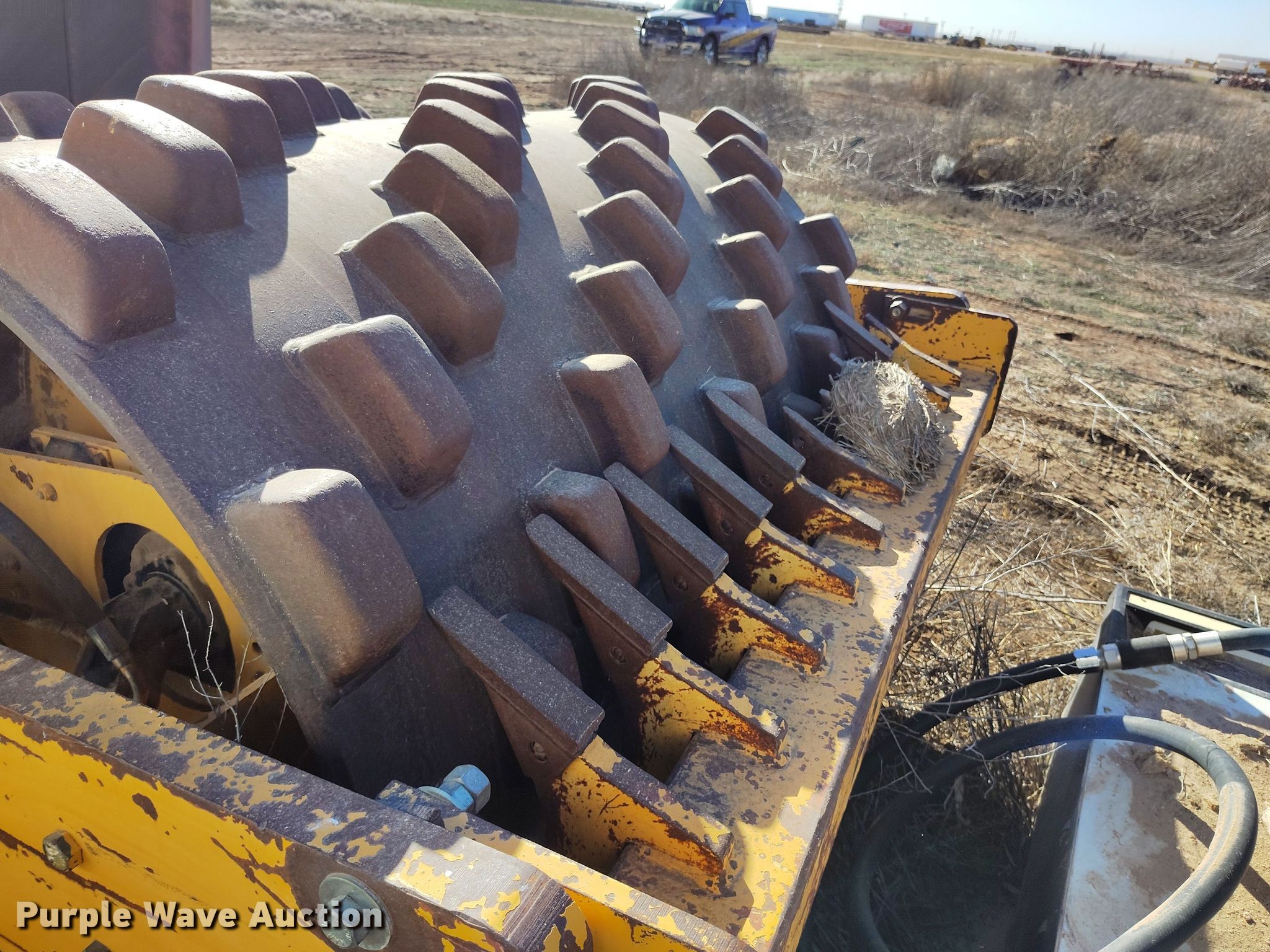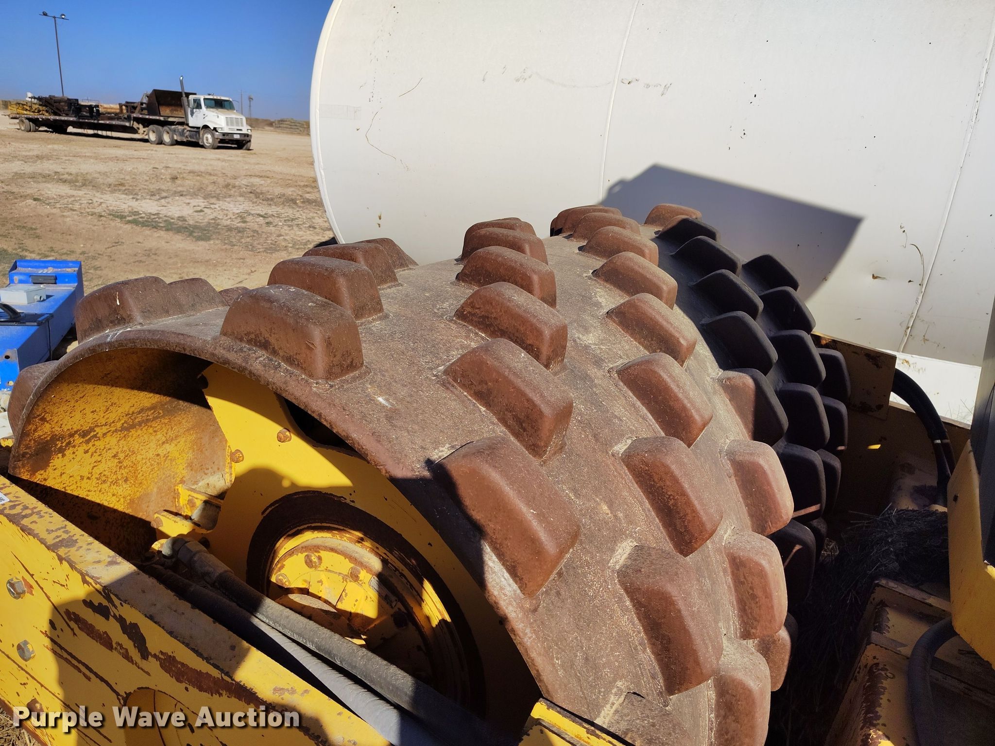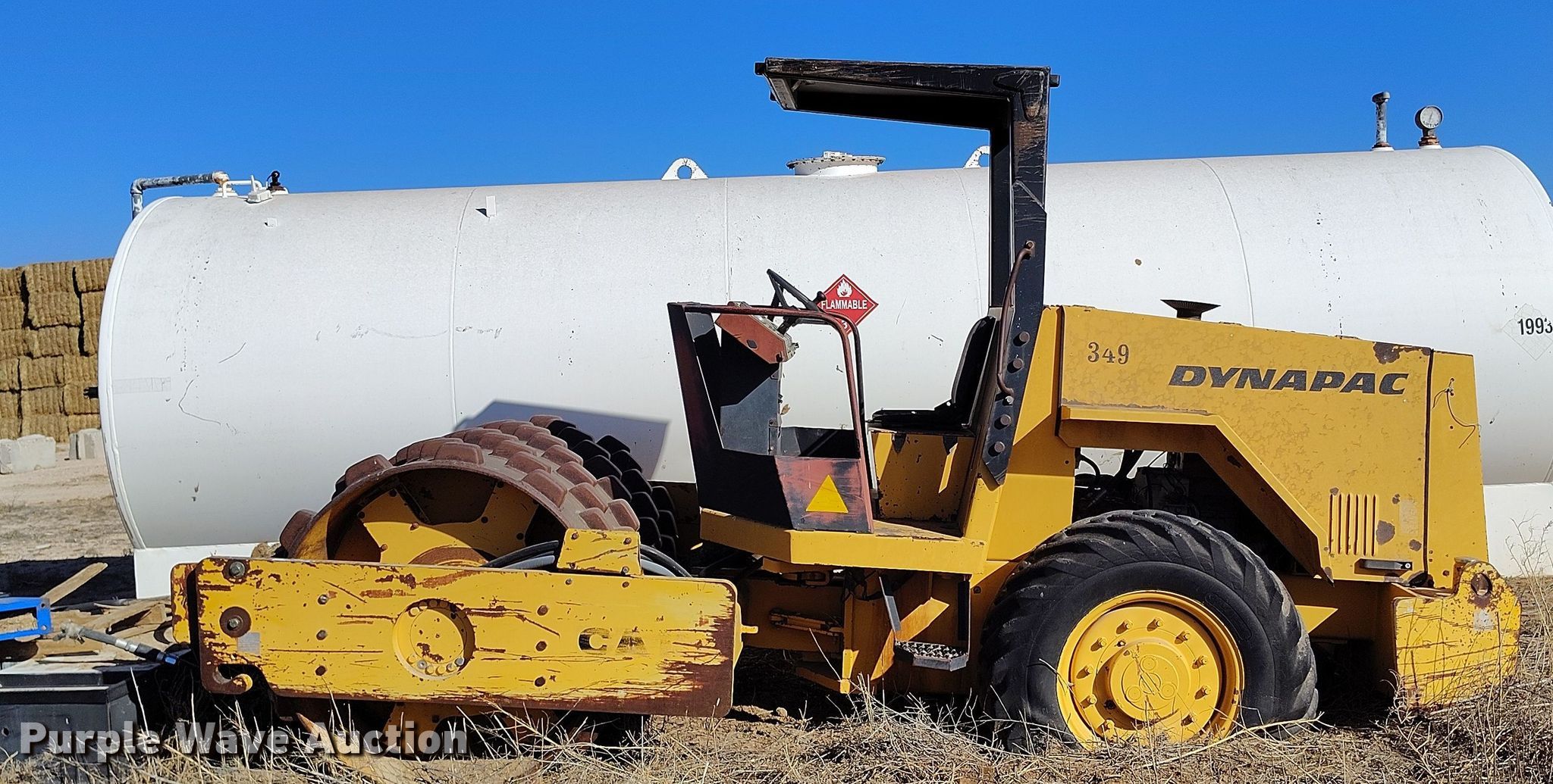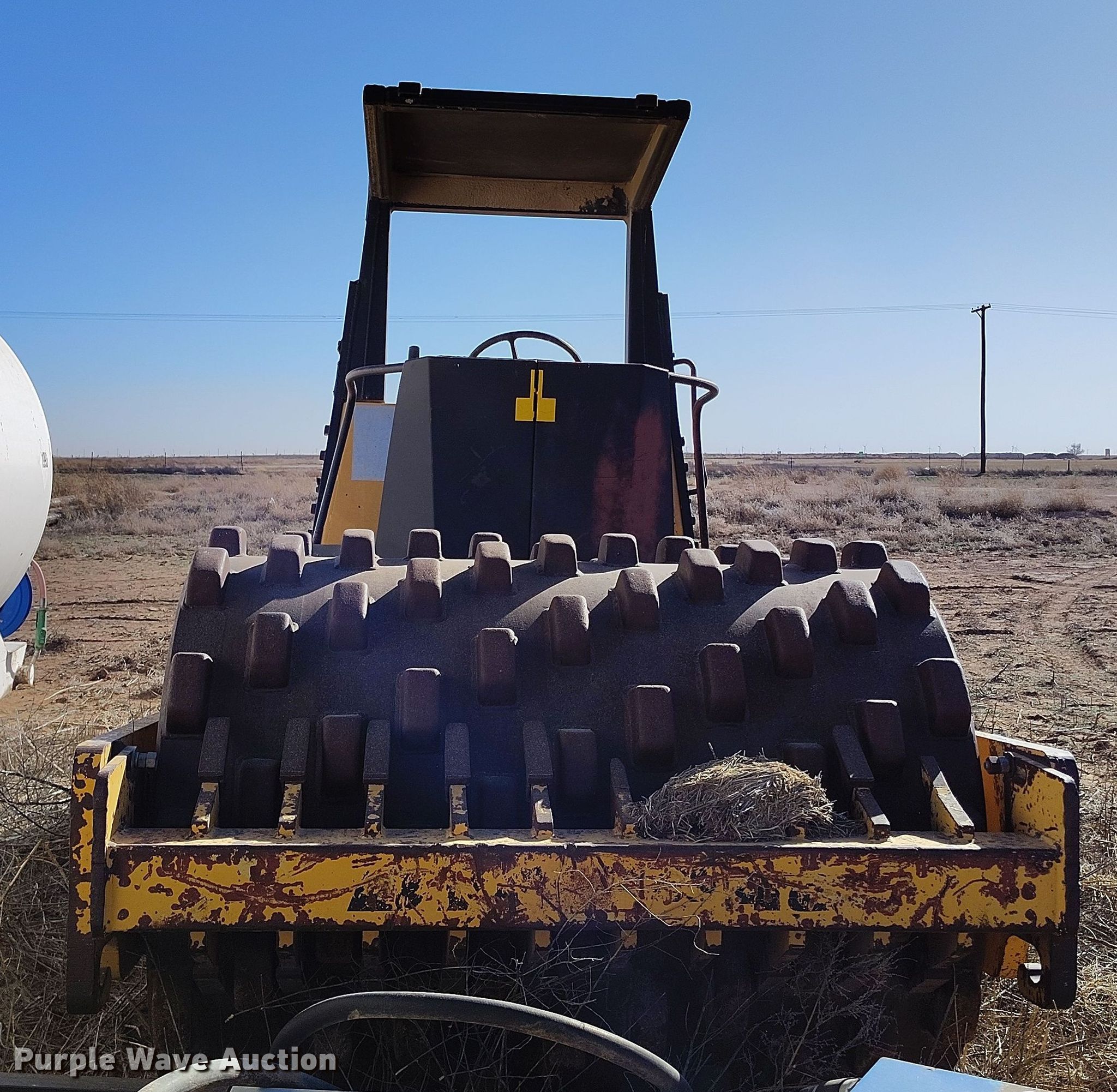 Dynapac CA15 II PD single drum vibratory roller. Hours: 1,850 on meter, Serial: 598018. Engine Cummins, Displacement: 3.9L, Cylinders: 4, Fuel type: Diesel. Transmission Hydrostatic. Features Drum: Padfoot, Vibratory system: Single, Front drum Width: 65", Diameter: 47", Drum scrapers: Front. Tires Size: 14.9/13-24. Notes Dead battery, Parts may be missing, Flat tires, Unknown operating condition. Reinert Hay Company. Hereford, TX 79045