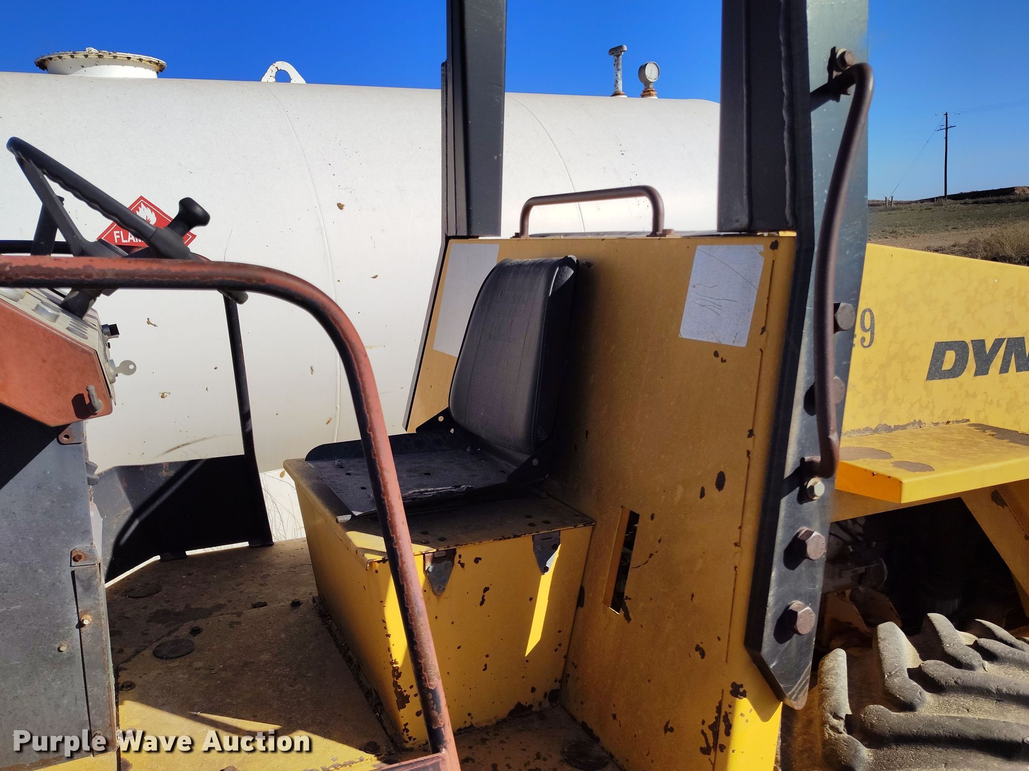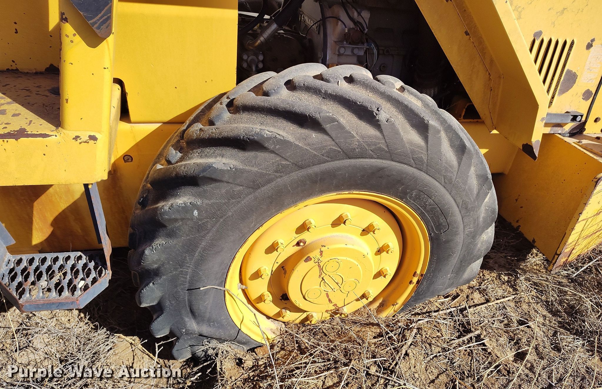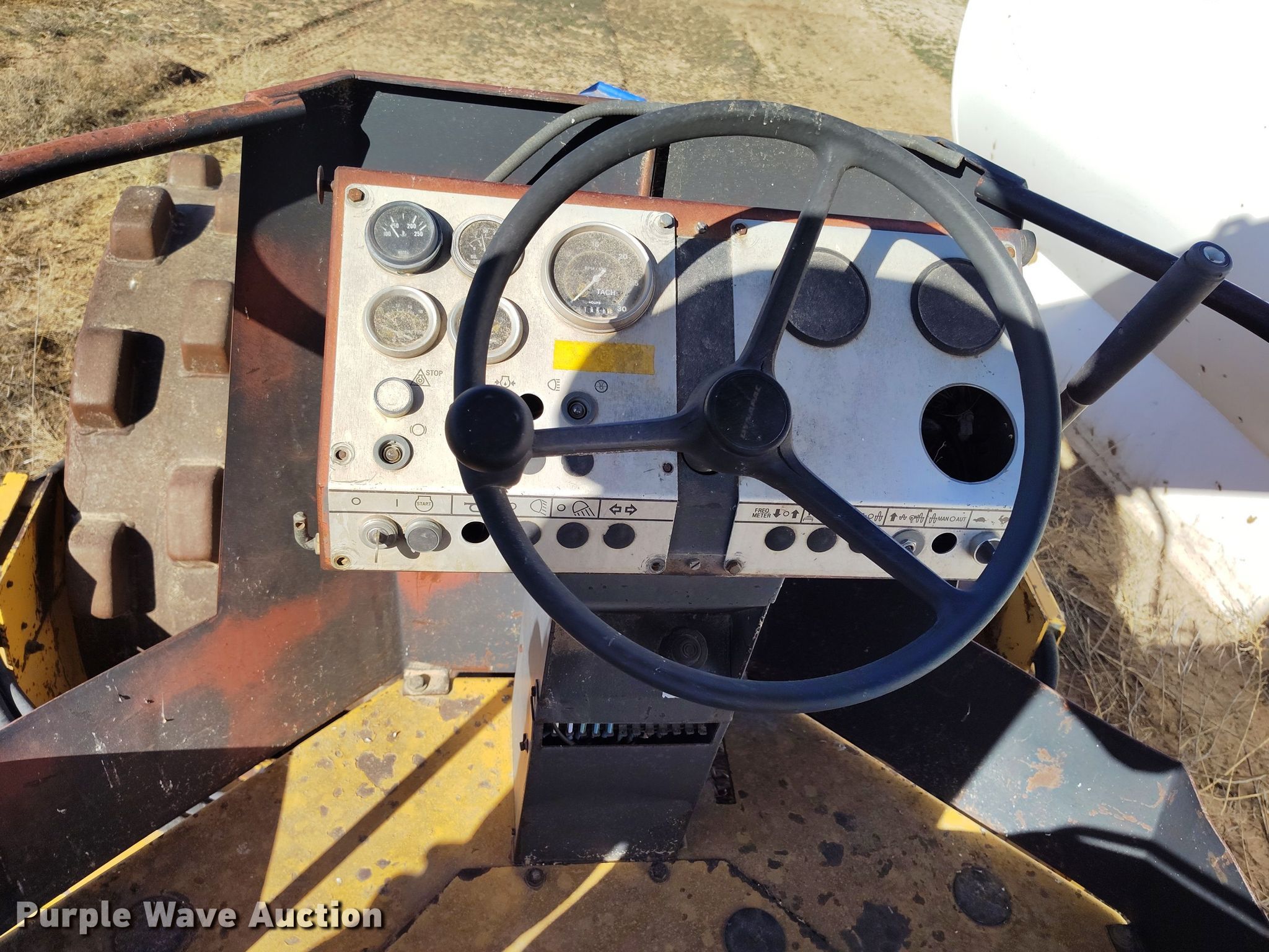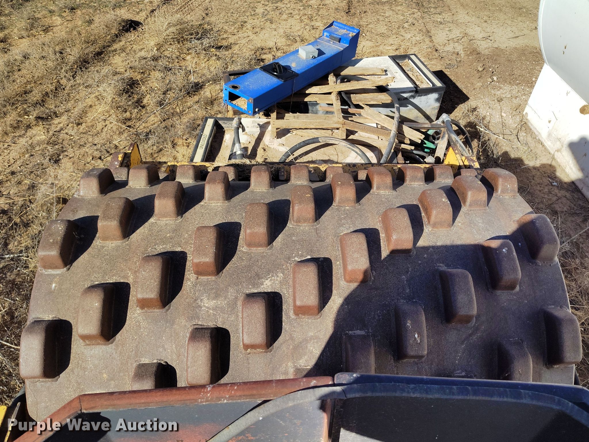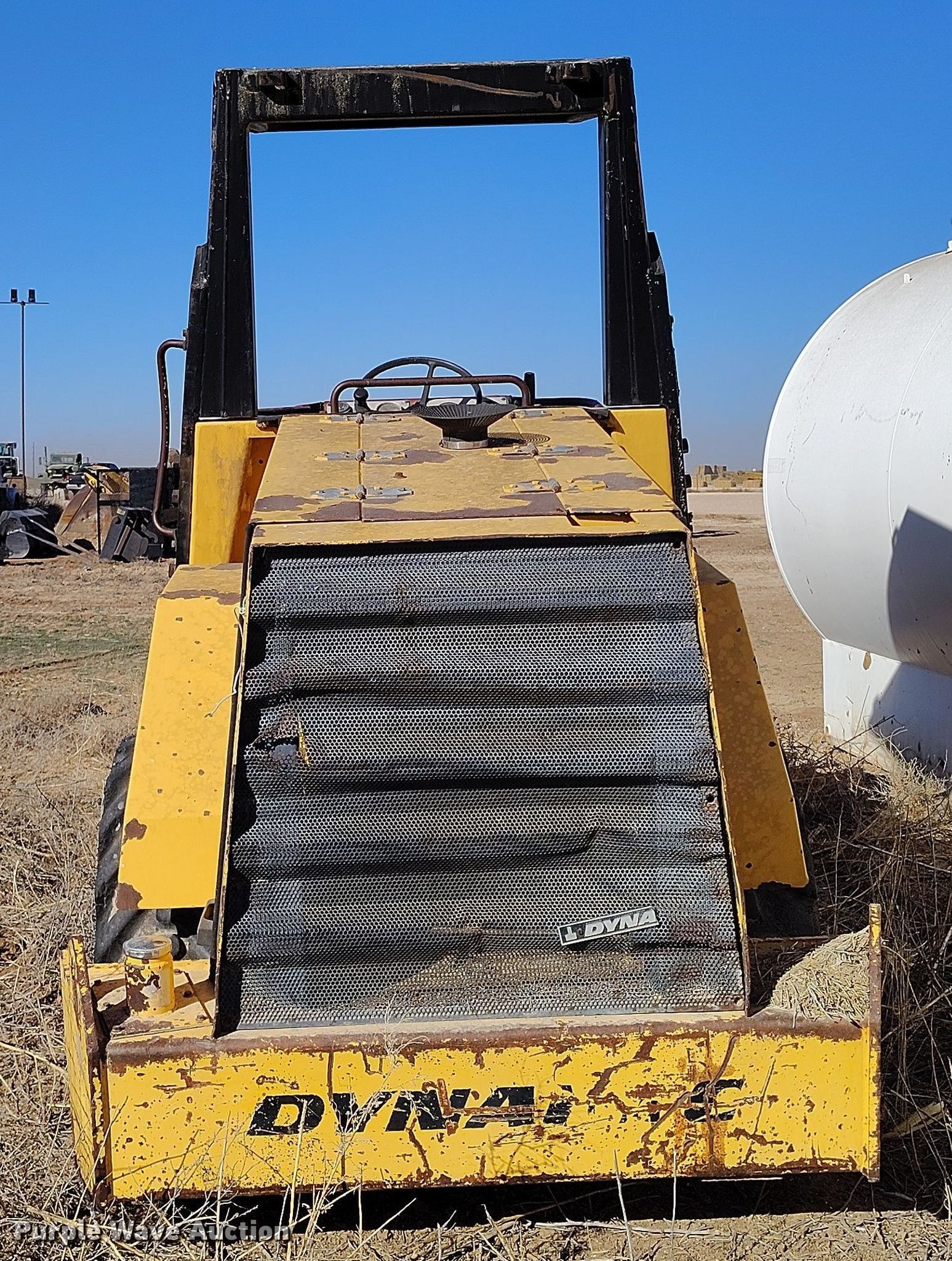 Dynapac CA15 II PD single drum vibratory roller. Hours: 1,850 on meter, Serial: 598018. Engine Cummins, Displacement: 3.9L, Cylinders: 4, Fuel type: Diesel. Transmission Hydrostatic. Features Drum: Padfoot, Vibratory system: Single, Front drum Width: 65", Diameter: 47", Drum scrapers: Front. Tires Size: 14.9/13-24. Notes Dead battery, Parts may be missing, Flat tires, Unknown operating condition. Reinert Hay Company. Hereford, TX 79045