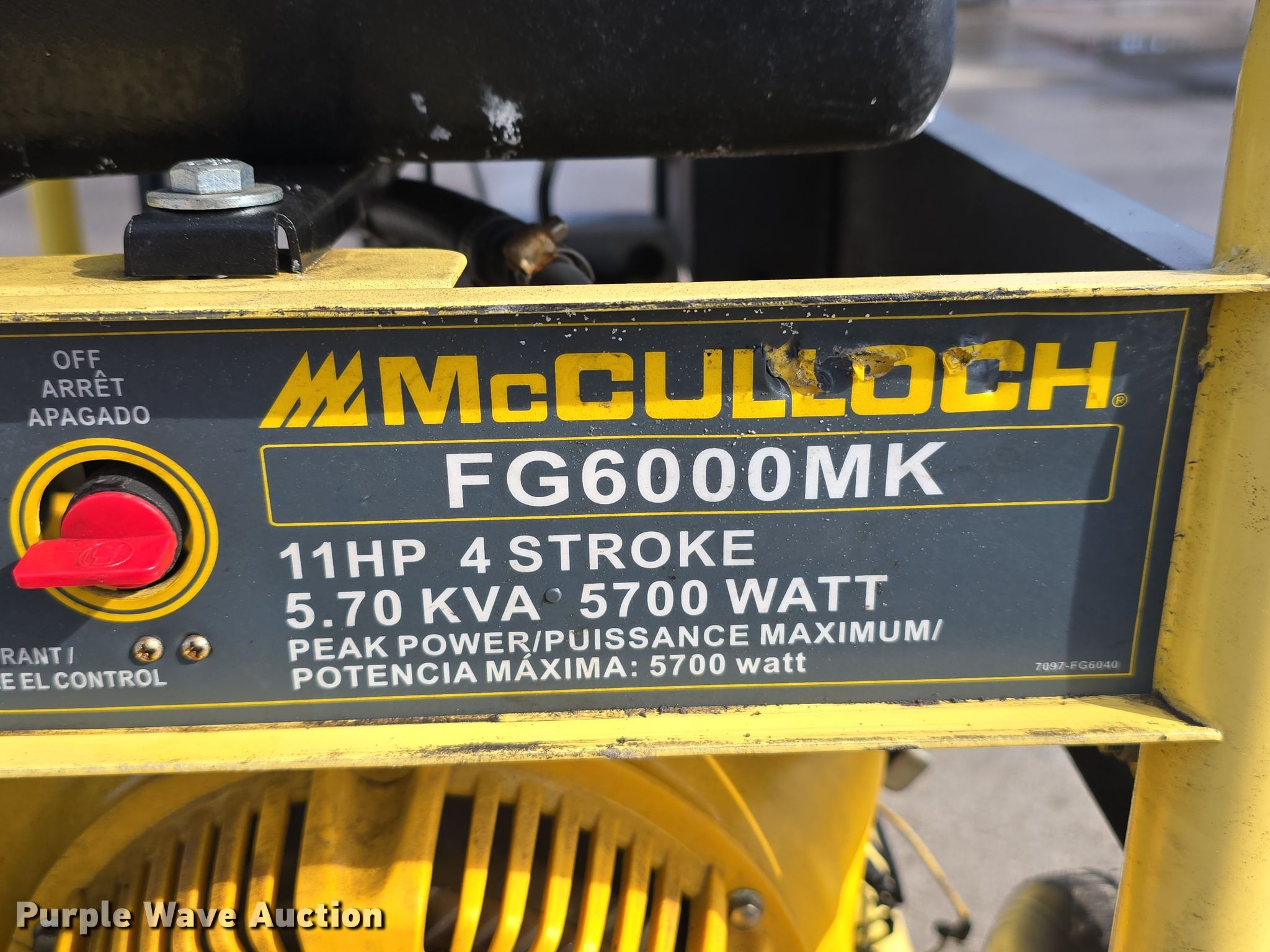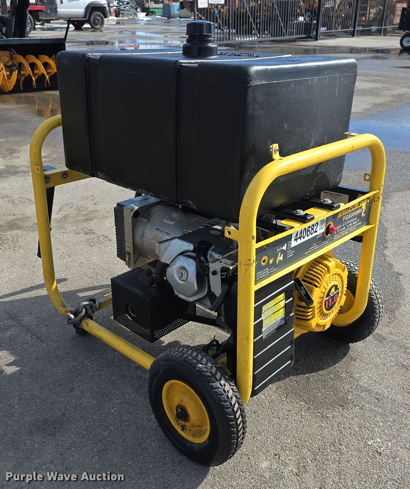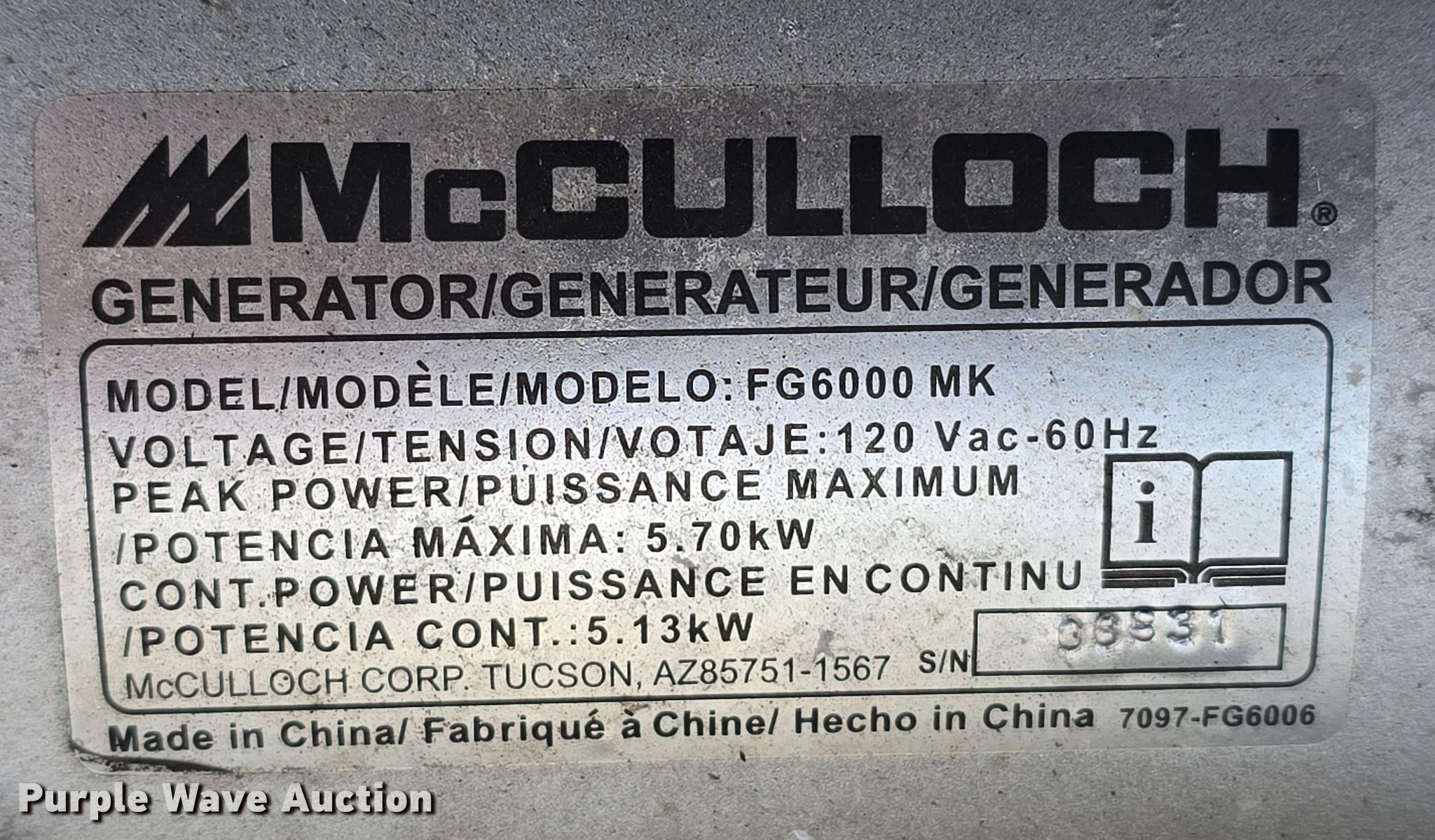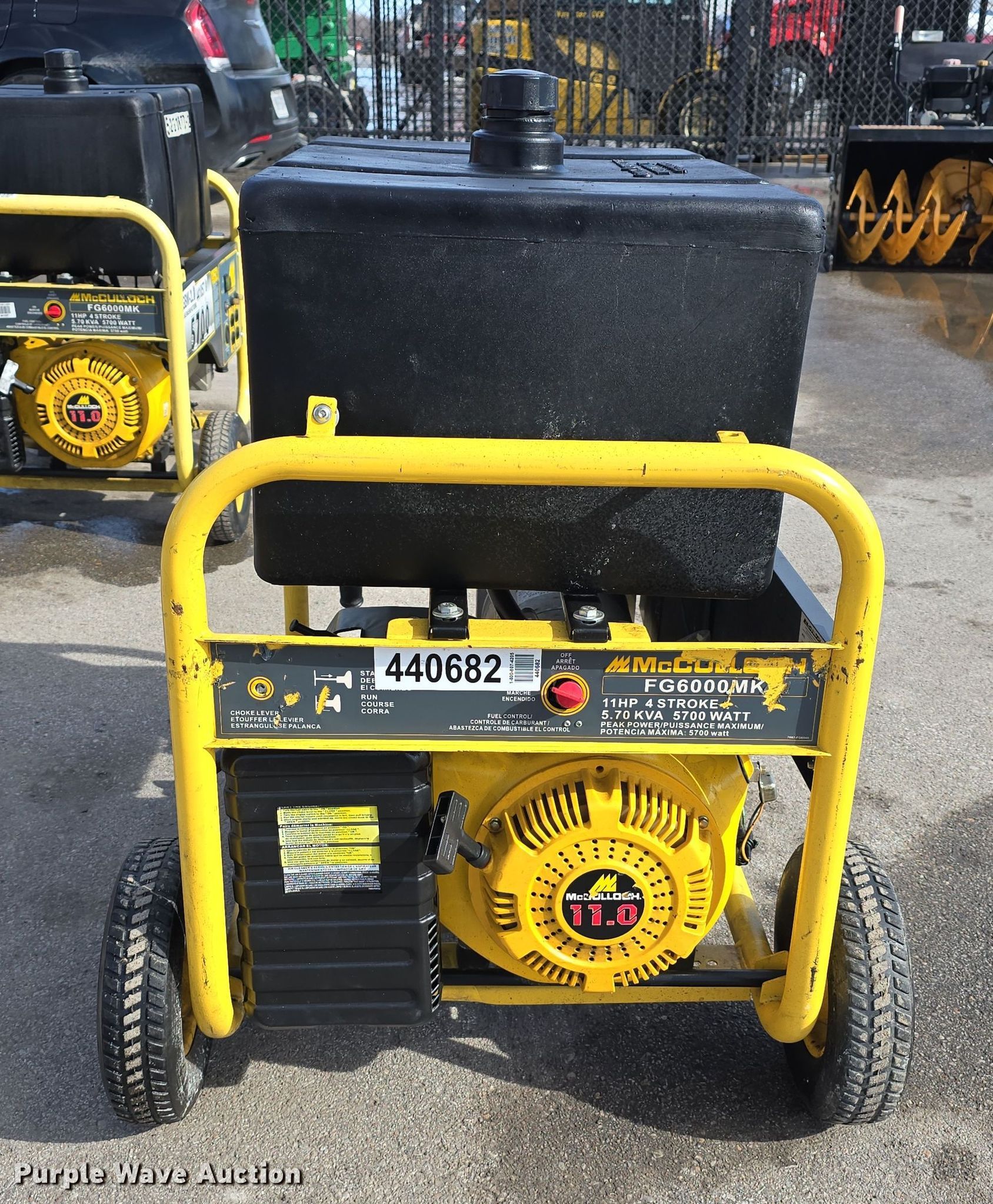 (2) McCulloch FG6000MK generators. Hours: Unknown, Serials: 2007E00 1838, 2006H00 14537. Engine McCulloch, Displacement: 338 cc, Cylinders: 1, Fuel type: Gas, HP: 11. Features Generator Watts: 5,700, kW: 5.7, Phase: Single, 120V outlets: 4, 240V outlets: 1, Fuel tank. Jordan Machinery/ S & N Auto Sales. Waterloo, NE 68069