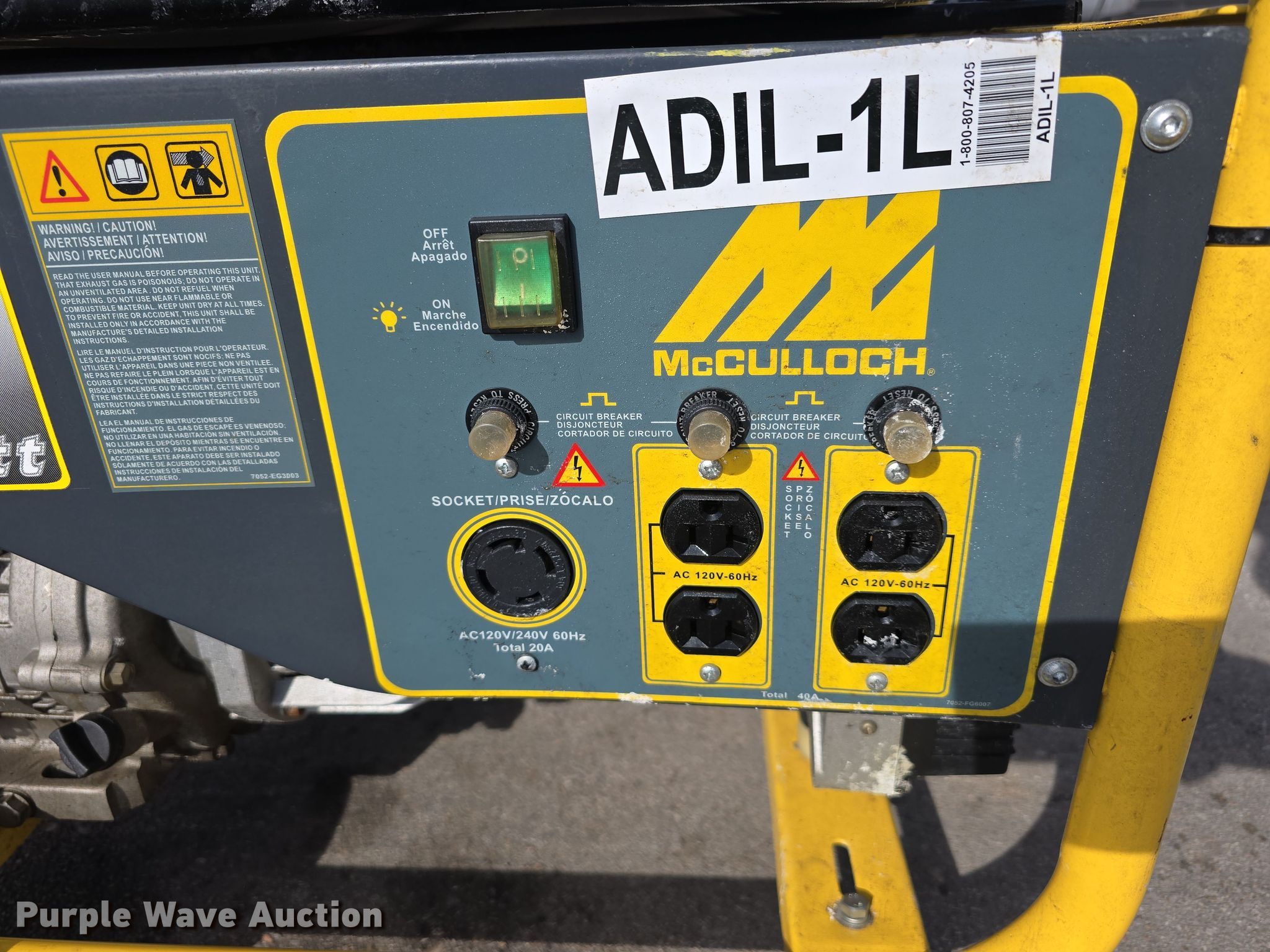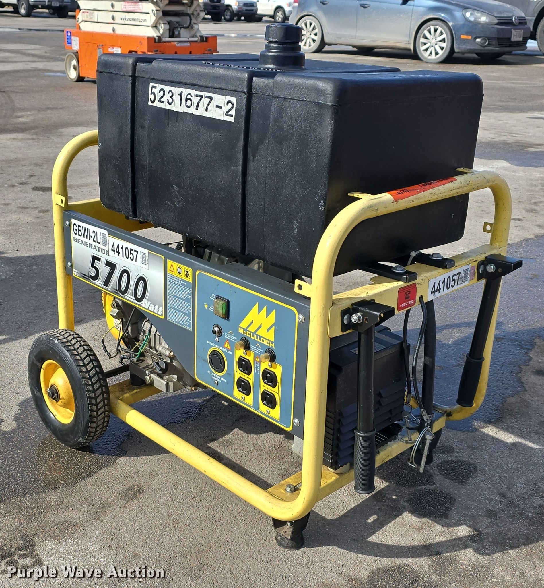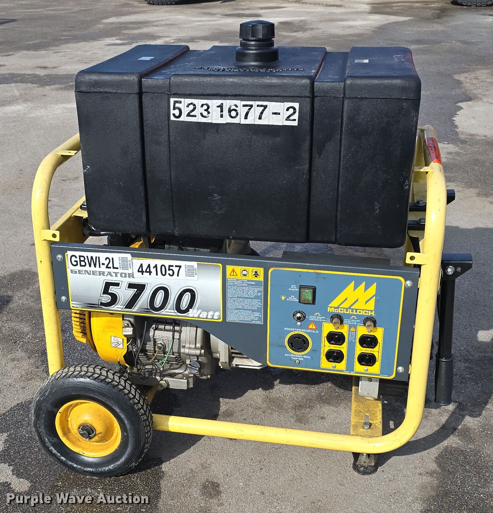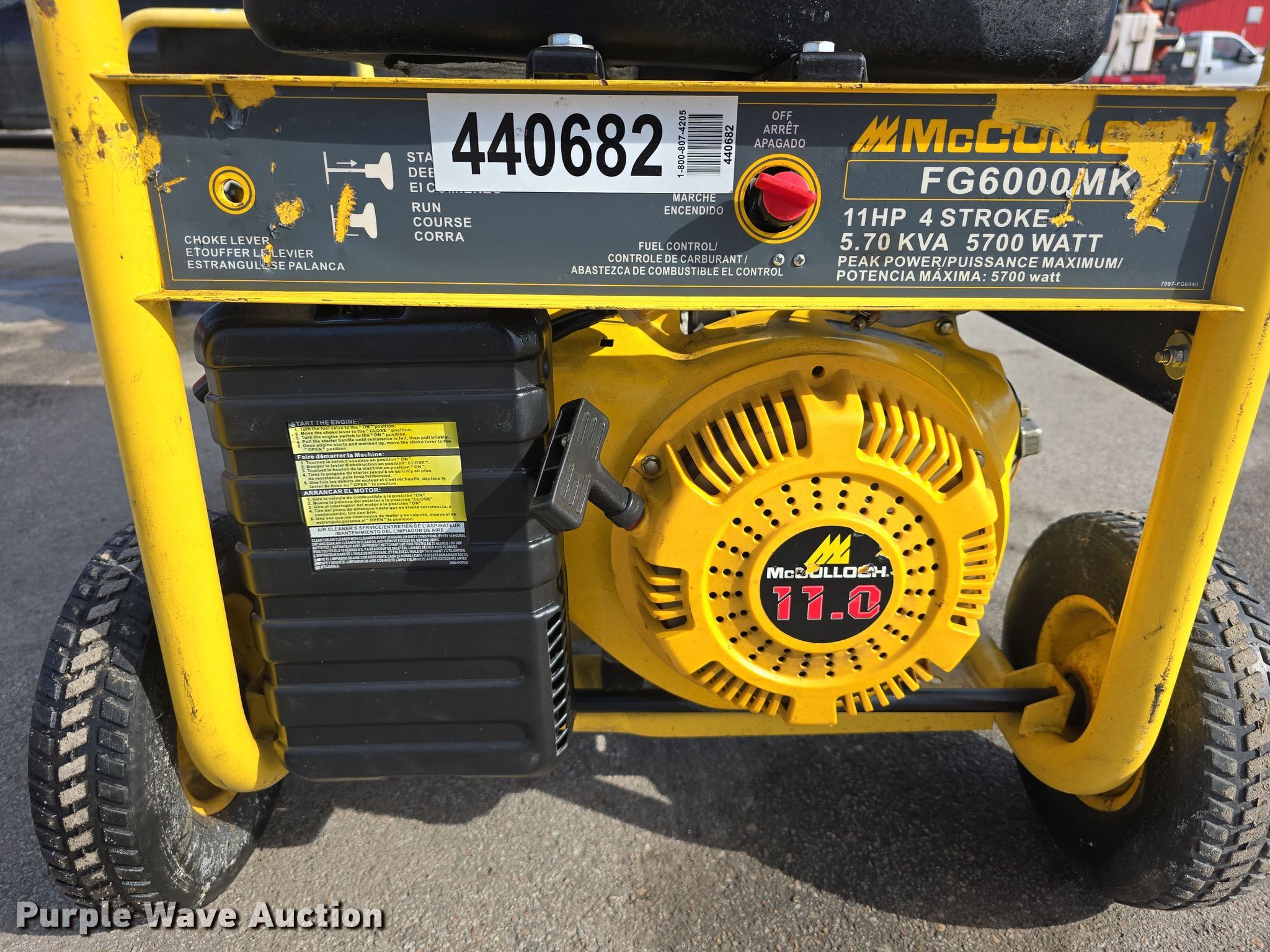 (2) McCulloch FG6000MK generators. Hours: Unknown, Serials: 2007E00 1838, 2006H00 14537. Engine McCulloch, Displacement: 338 cc, Cylinders: 1, Fuel type: Gas, HP: 11. Features Generator Watts: 5,700, kW: 5.7, Phase: Single, 120V outlets: 4, 240V outlets: 1, Fuel tank. Jordan Machinery/ S & N Auto Sales. Waterloo, NE 68069