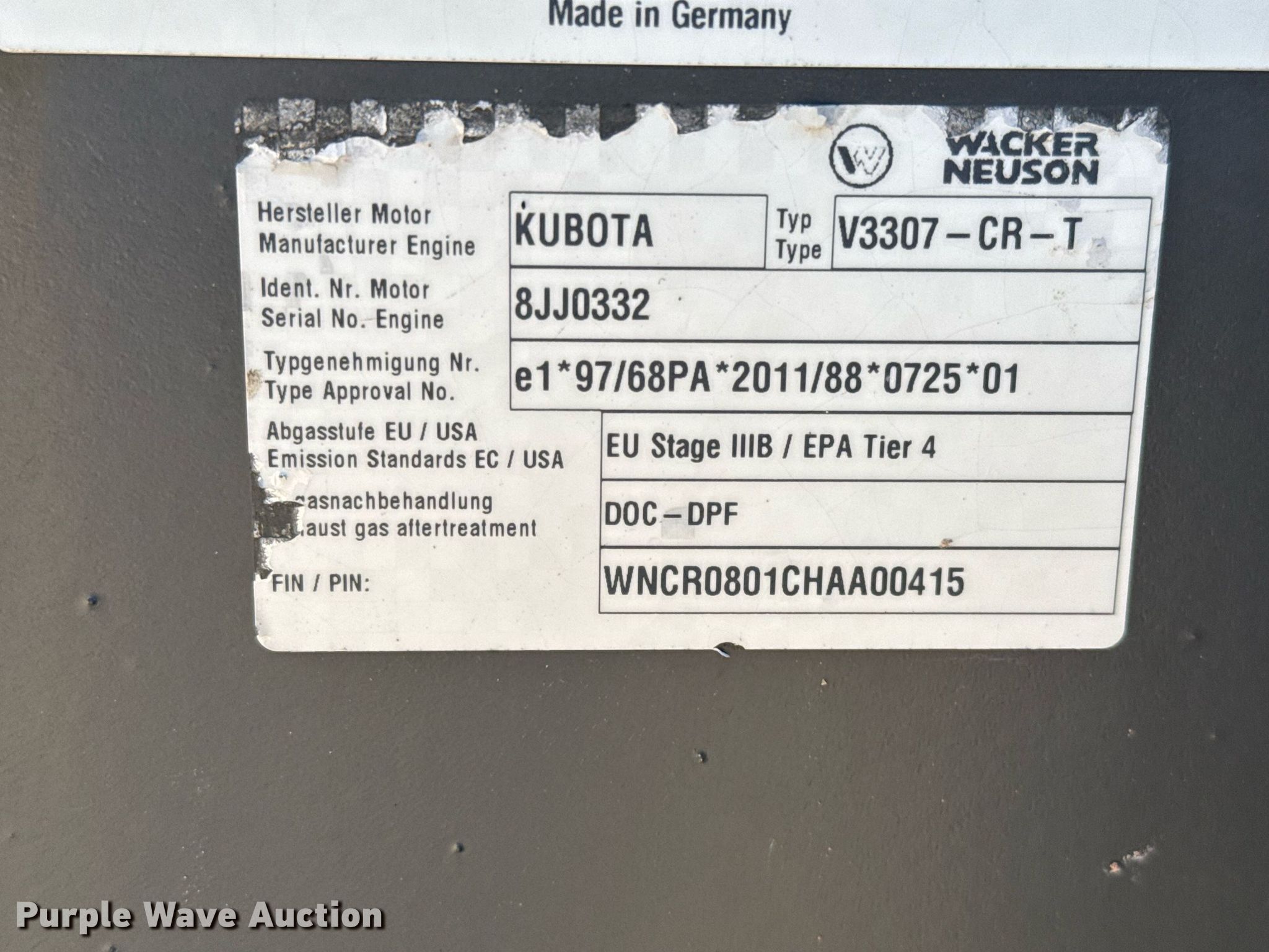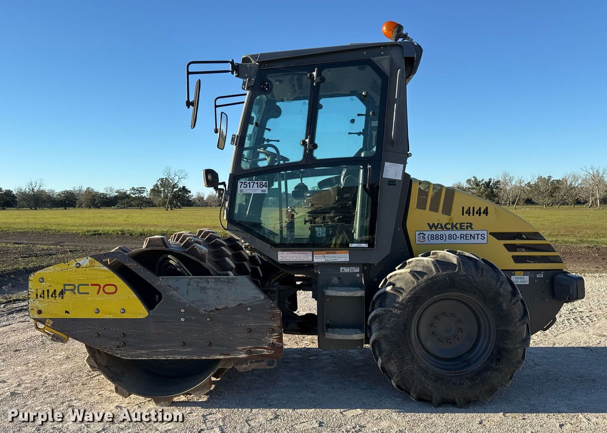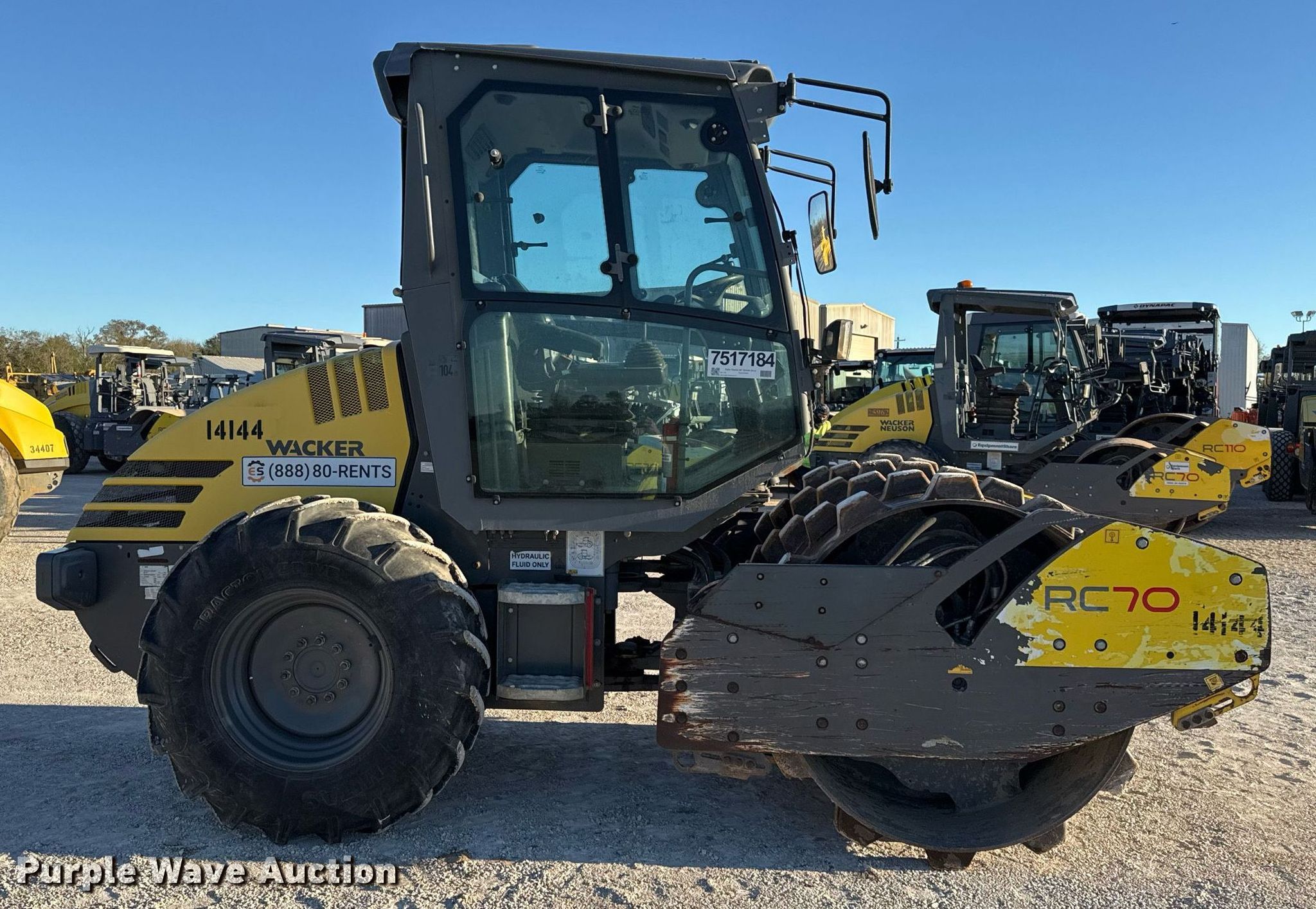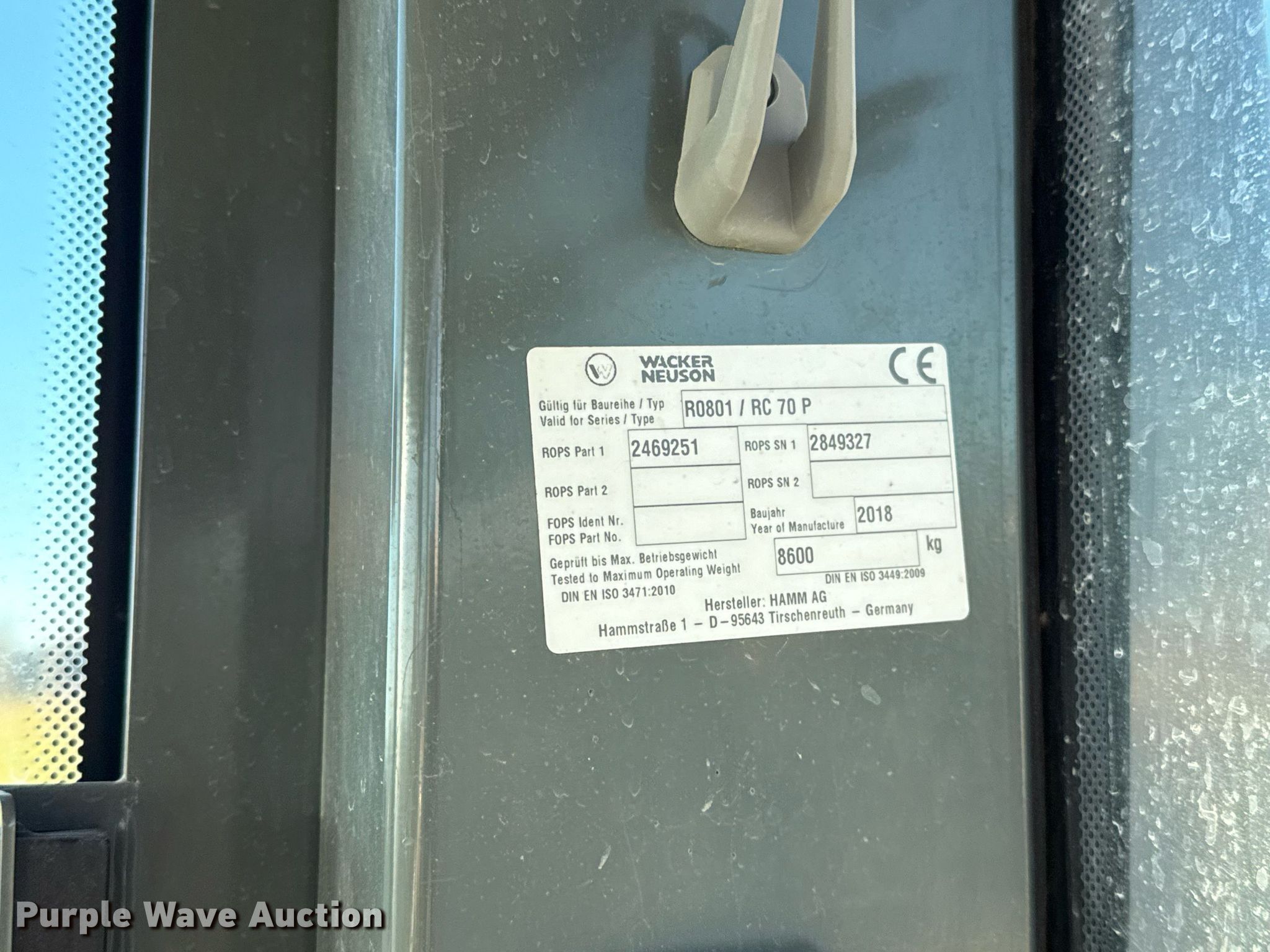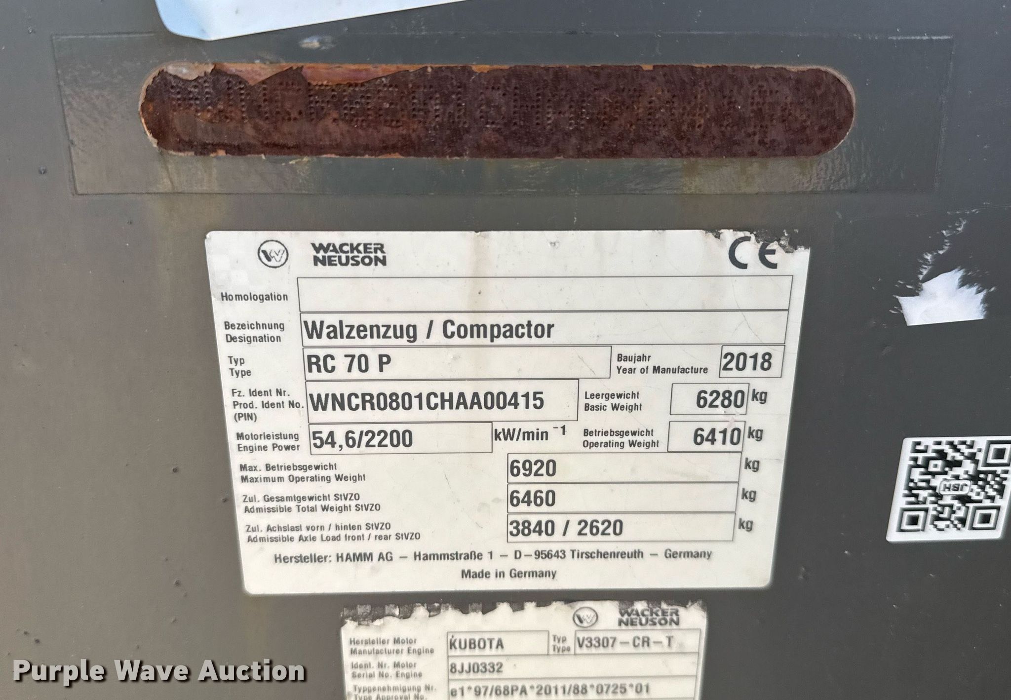 2018 Wacker Neuson RC70P single drum vibratory roller. Hours: 1,137 on meter, Serial: WNCR0801CHAA00415. Engine Kubota V3307, Serial: 8JJ0332, Displacement: 3.3L, Cylinders: 4, Fuel type: Diesel, kW: 54.6. Transmission Hydrostatic, Two speed travel. Operators station Enclosed cab, AC, Heat, Backup camera. Features Drum: Padfoot, Vibratory system: Single, Front drum Width: 66", Diameter: 47", Drum scrapers: Front. Tires Size: 14.9-24. Dealer Inventory. Sweeny , TX 77480