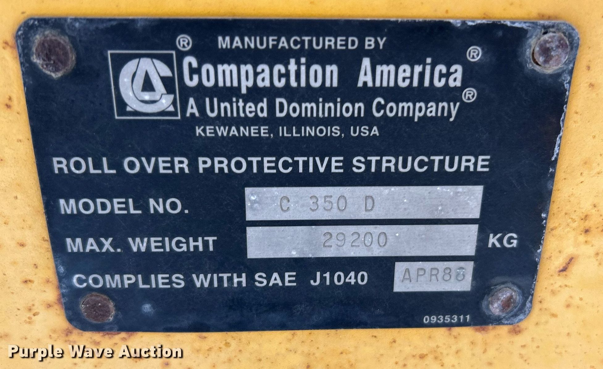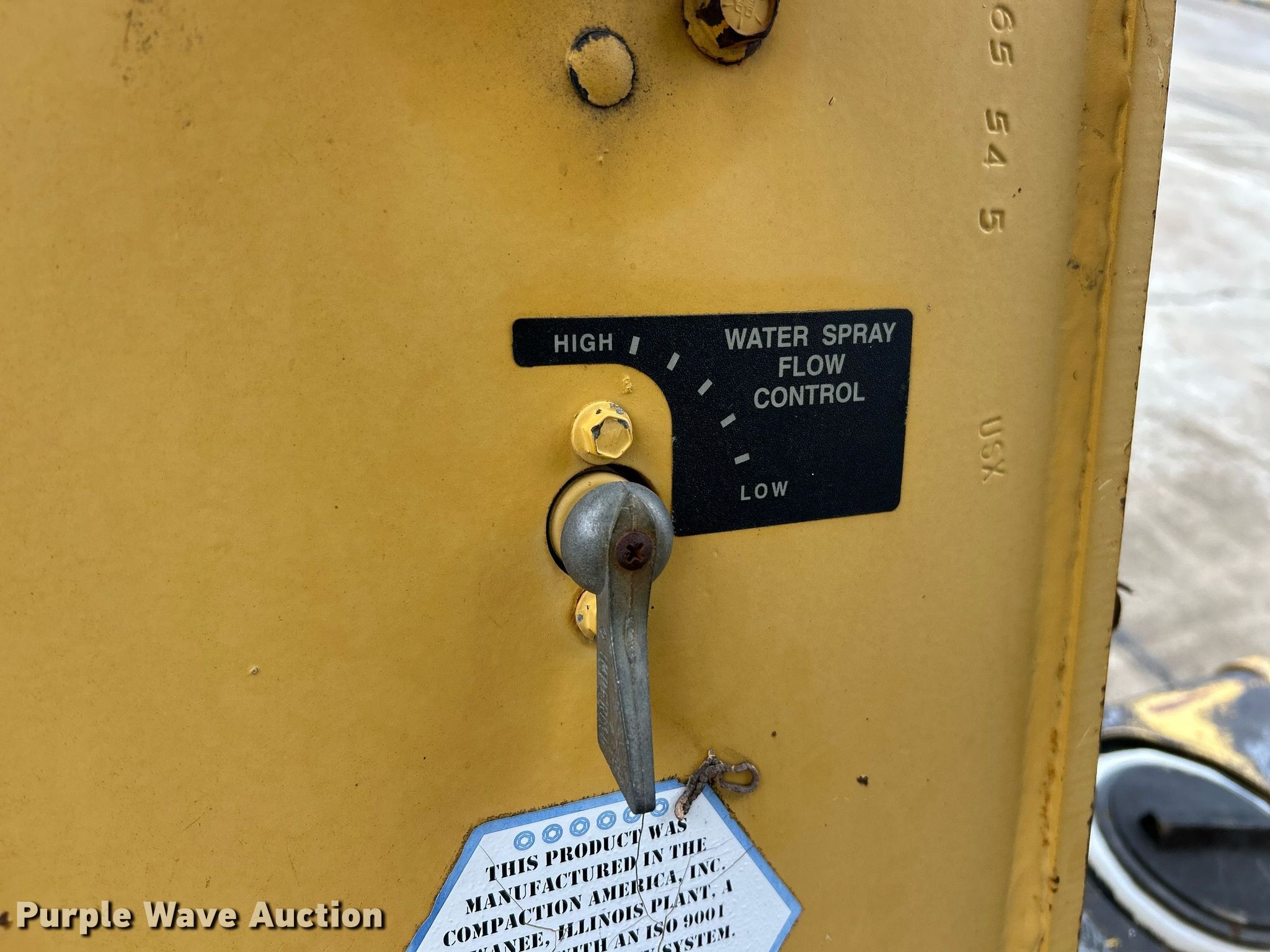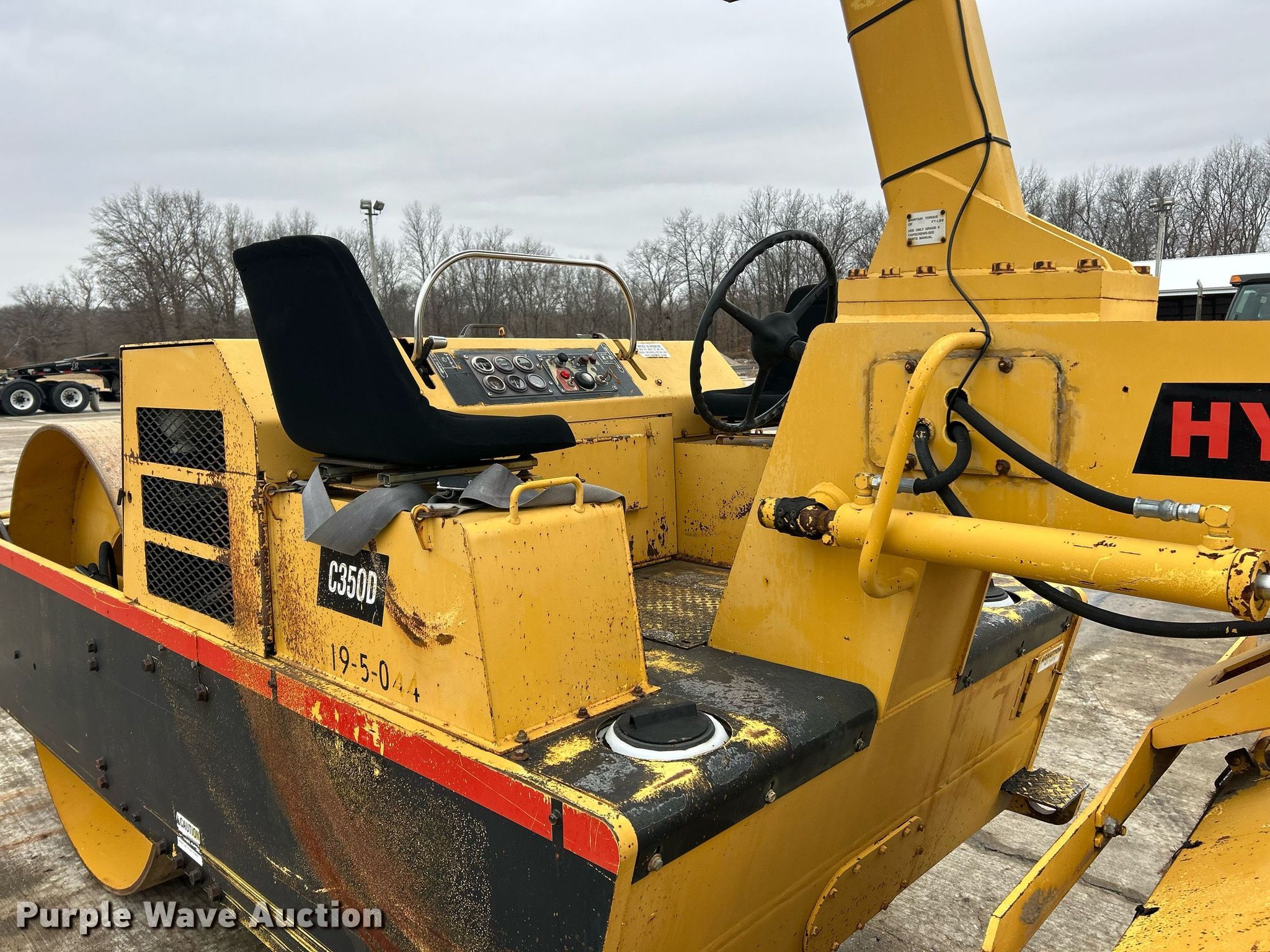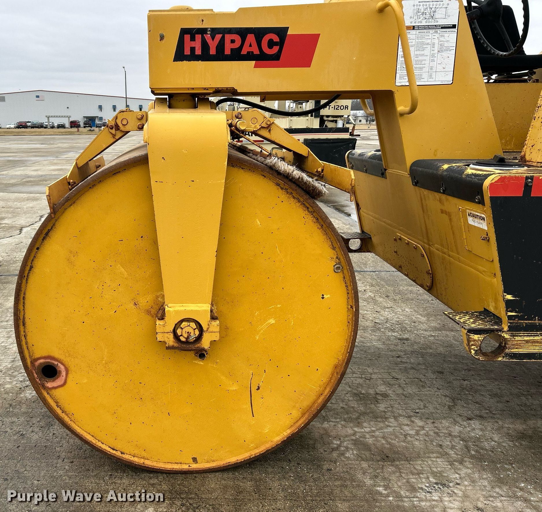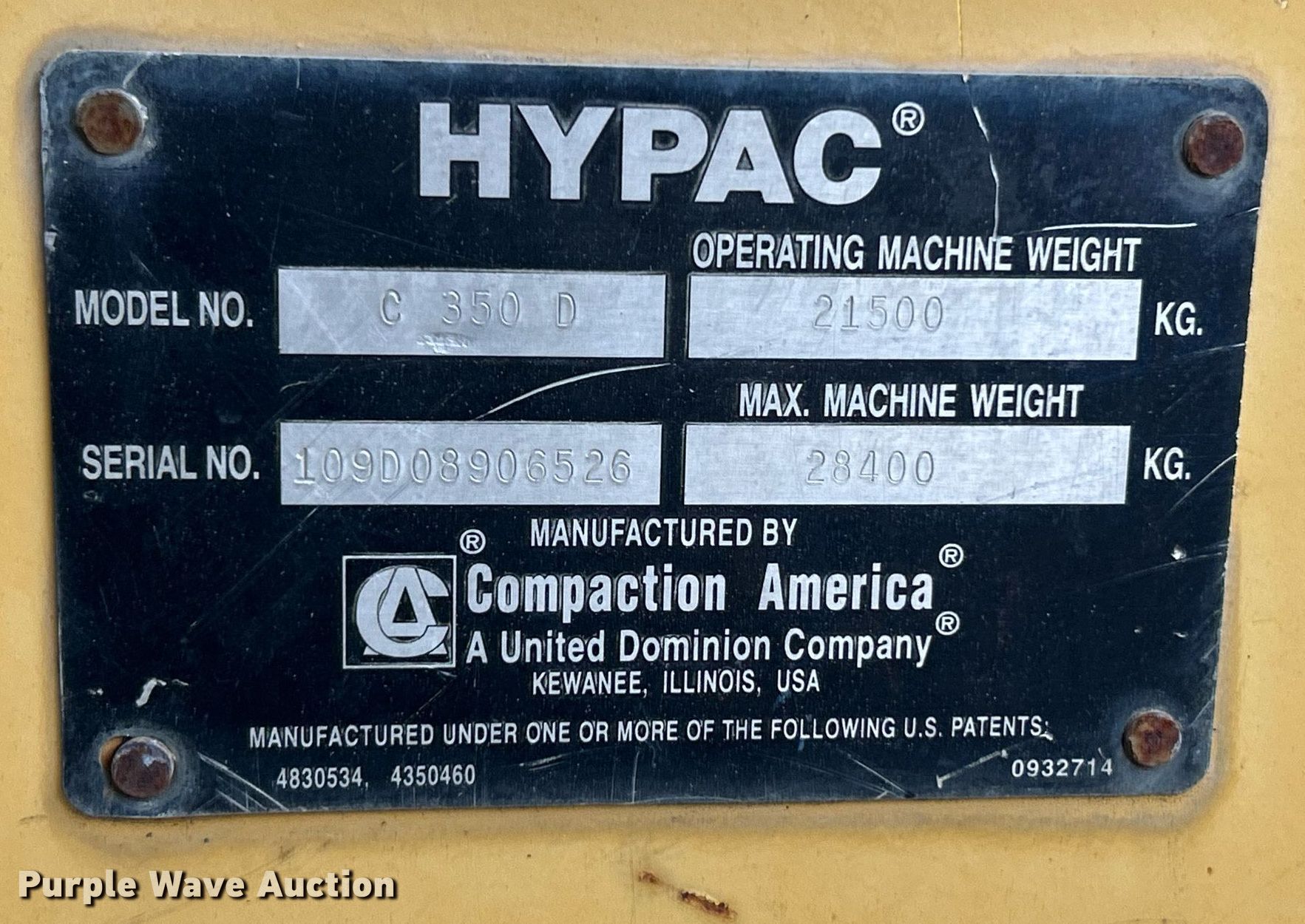 Hypac C350D double drum roller. Hours: 2,251 on meter, Serial: 109D08906526. Engine Cummins B3.9-C, Displacement: 3.9L, Cylinders: 4, Fuel type: Diesel. Transmission Hydrostatic, Two speed travel. Operators station OROPS. Features Drum: Smooth, Front drum Width: 54", Diameter: 47", Rear drum Width: 54", Diameter: 60", Drum scrapers: Front, Rear, Water spray applicator: Rear. Howell Paving. Salem, IL 62881