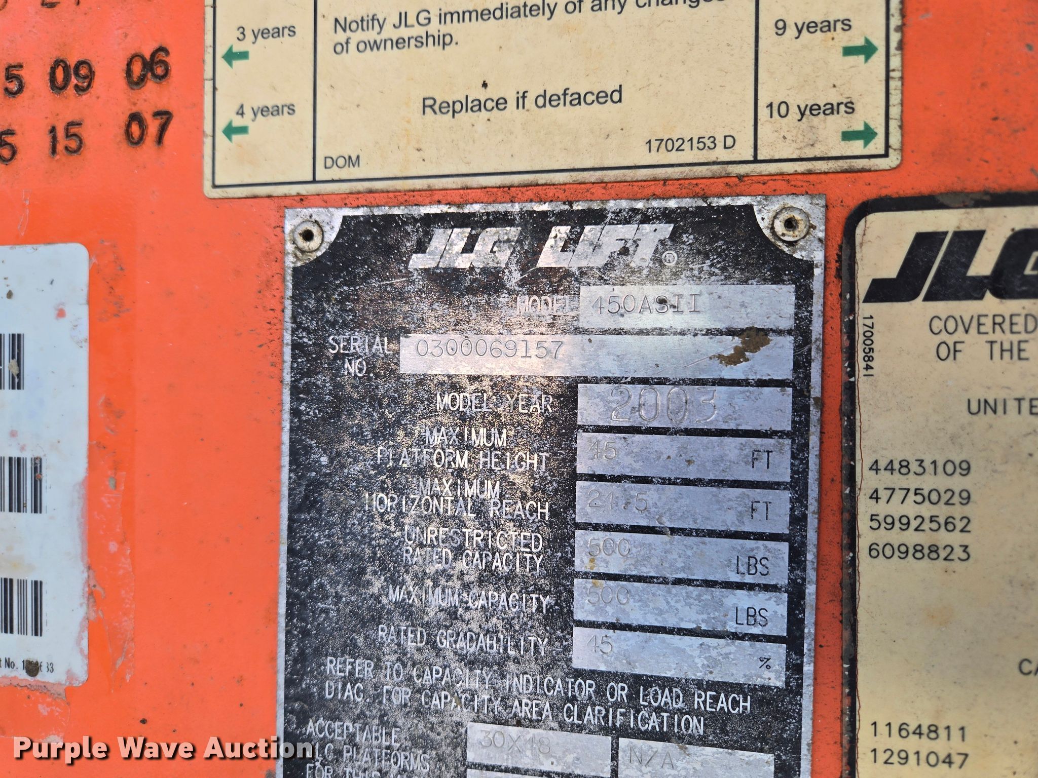 Purple Wave is selling a used Boom Lift in Missouri. This item is a 2003 JLG 450A boom lift with the following: Hours: 1,803 on meter, Serial: 0300069157