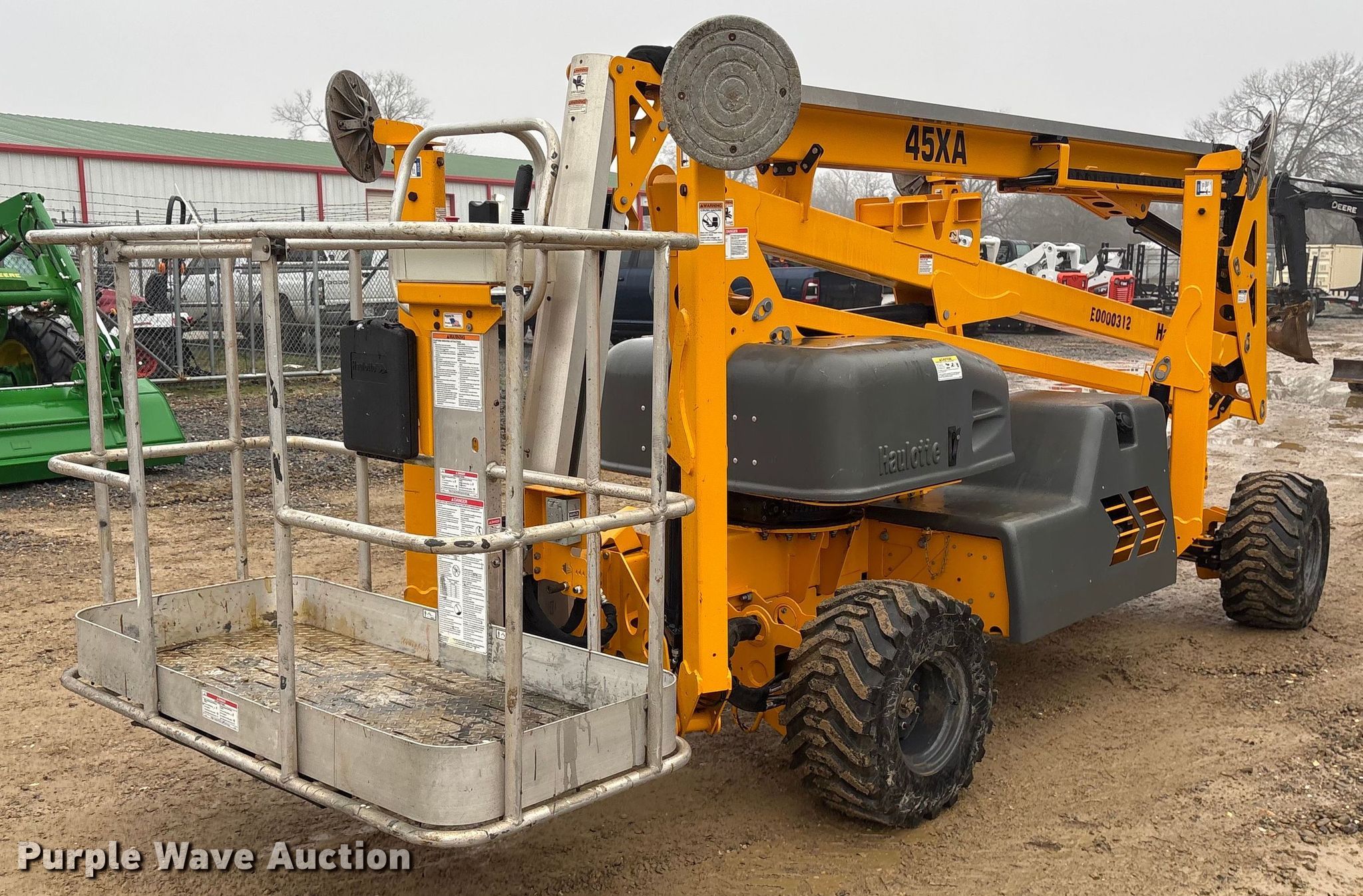 2020 Haulotte 45XA boom lift. Hours: 496 on meter, Serial: 2083316. Engine Kubota WG972-G-ET, Displacement: 962 cc, Cylinders: 2, Fuel type: Gas. Chassis Four wheel drive. Features Rough terrain, Boom type: Articulating, Telescopic, Maximum lift capacity: 500 lbs, Maximum reach length: 27', Maximum lift height: 45', Hydraulic outriggers, Hydraulic extendable jib, Hydraulic leveling, Platform: 27" L x 63" W, AC power outlet, Air outlet, Controls: Platform, Ground. Tires Tire size: 26x12.00-12 NHS. ROUTH Sales & Rentals. Broken Bow, OK 74728