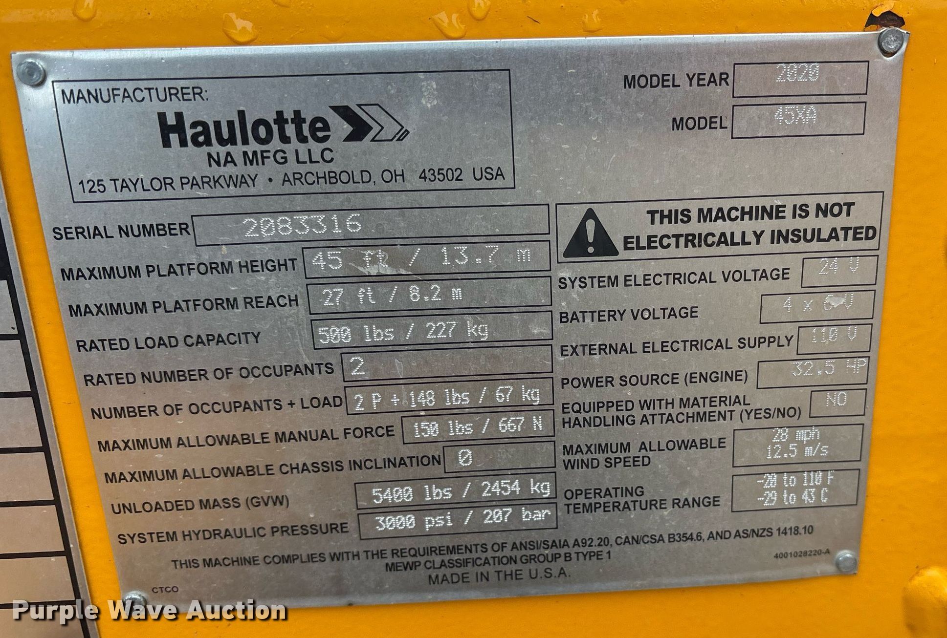 Purple Wave is selling a used Boom Lift in Oklahoma. This item is a 2020 Haulotte 45XA boom lift with the following: Hours: 496 on meter, Serial: 2083316