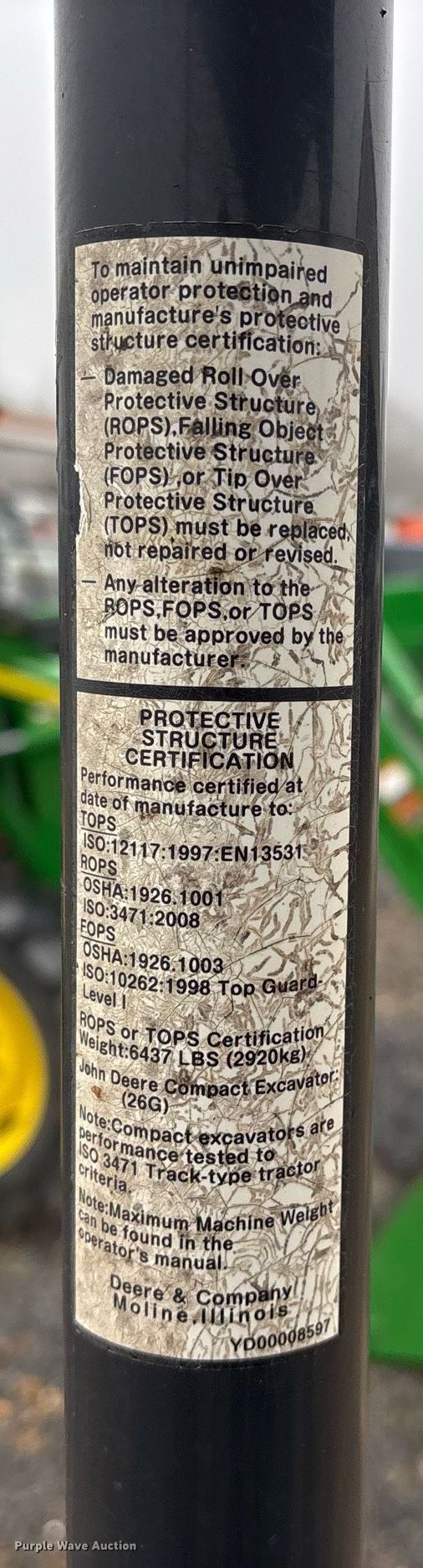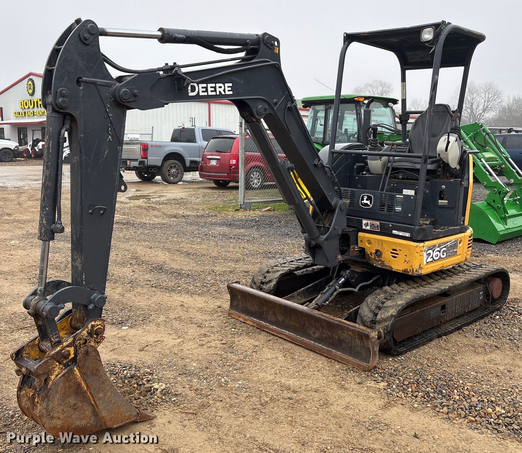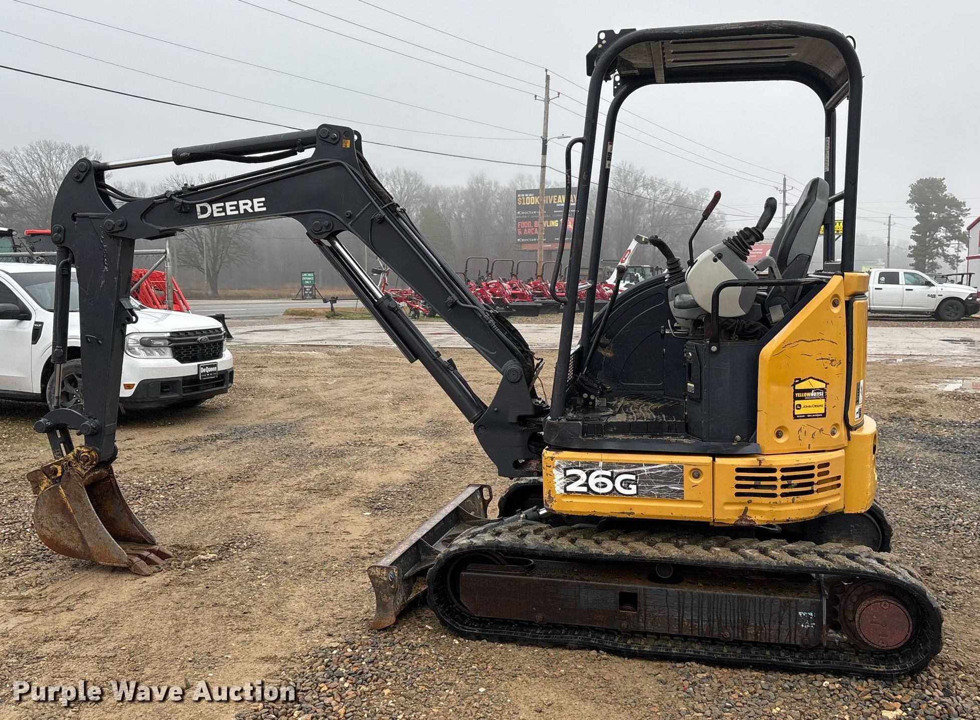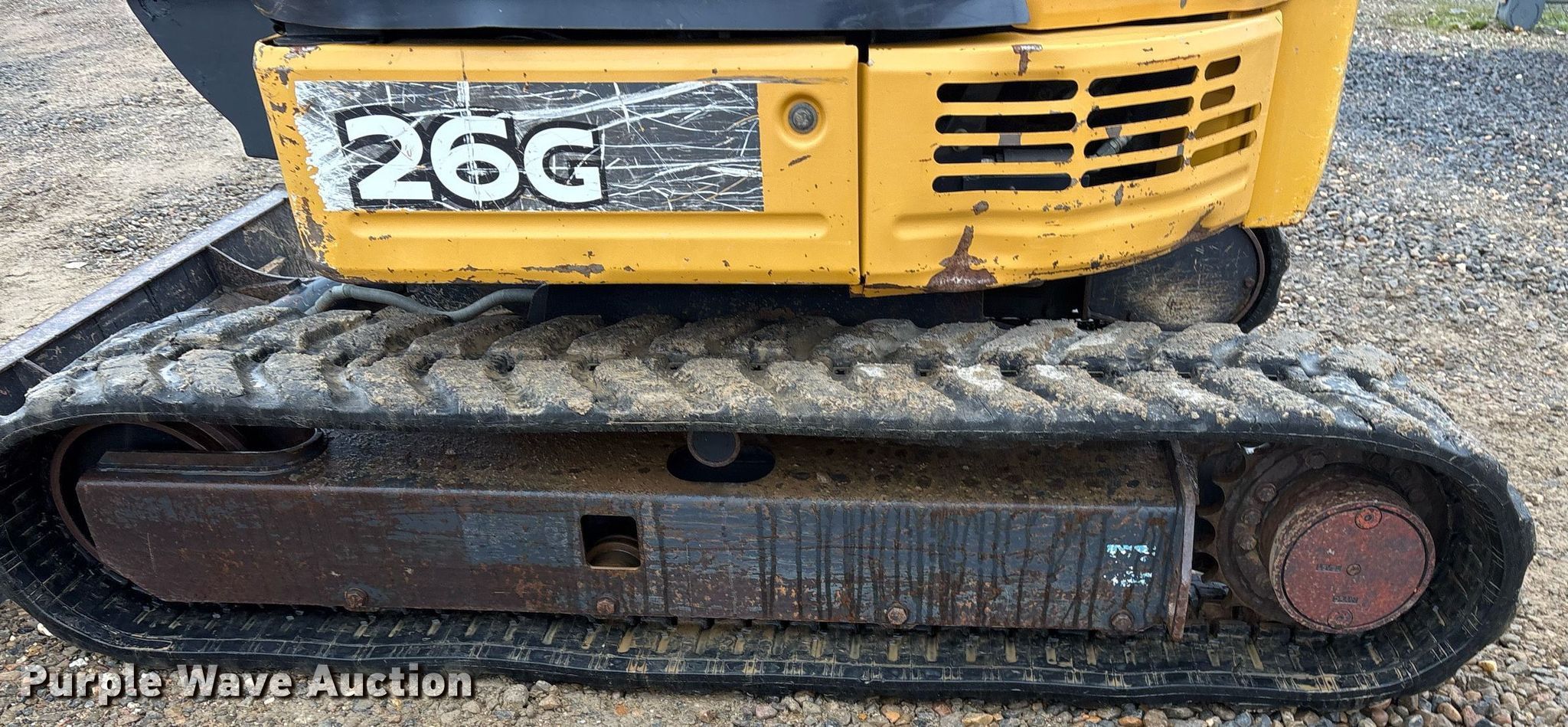 Purple Wave is selling a used Mini Excavator in Oklahoma. This item is a 2015 John Deere 26G mini excavator with the following: Hours: 1,174 on meter, Serial: 1FF026GXVFK260063