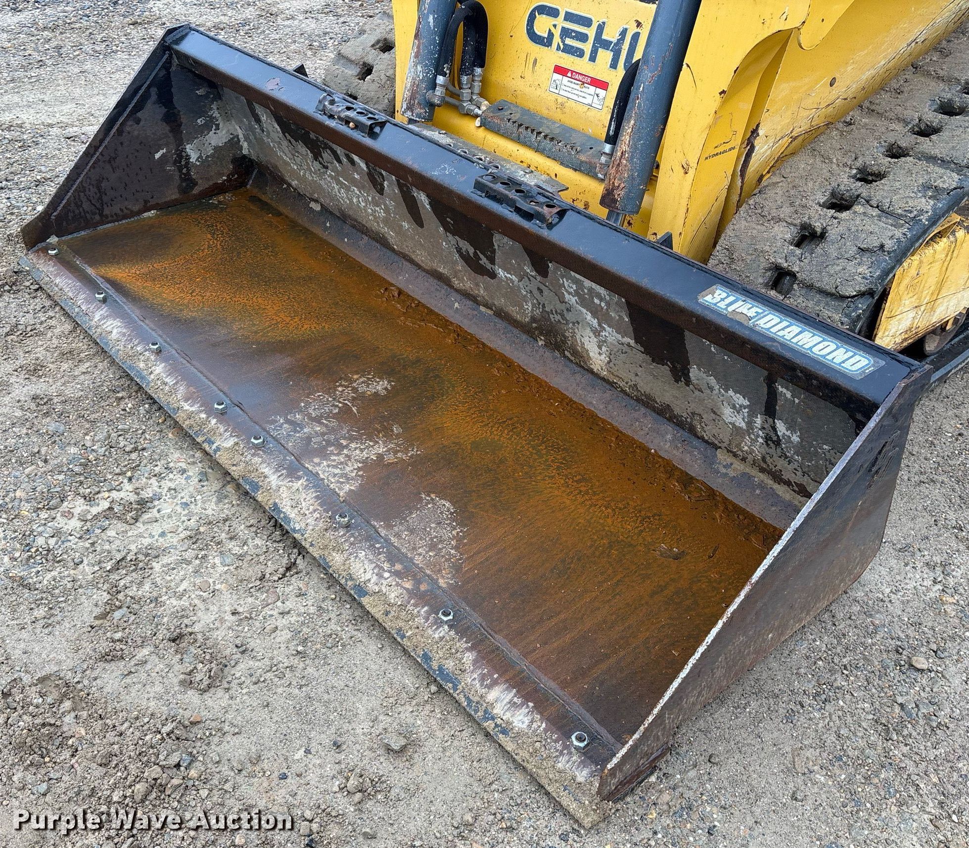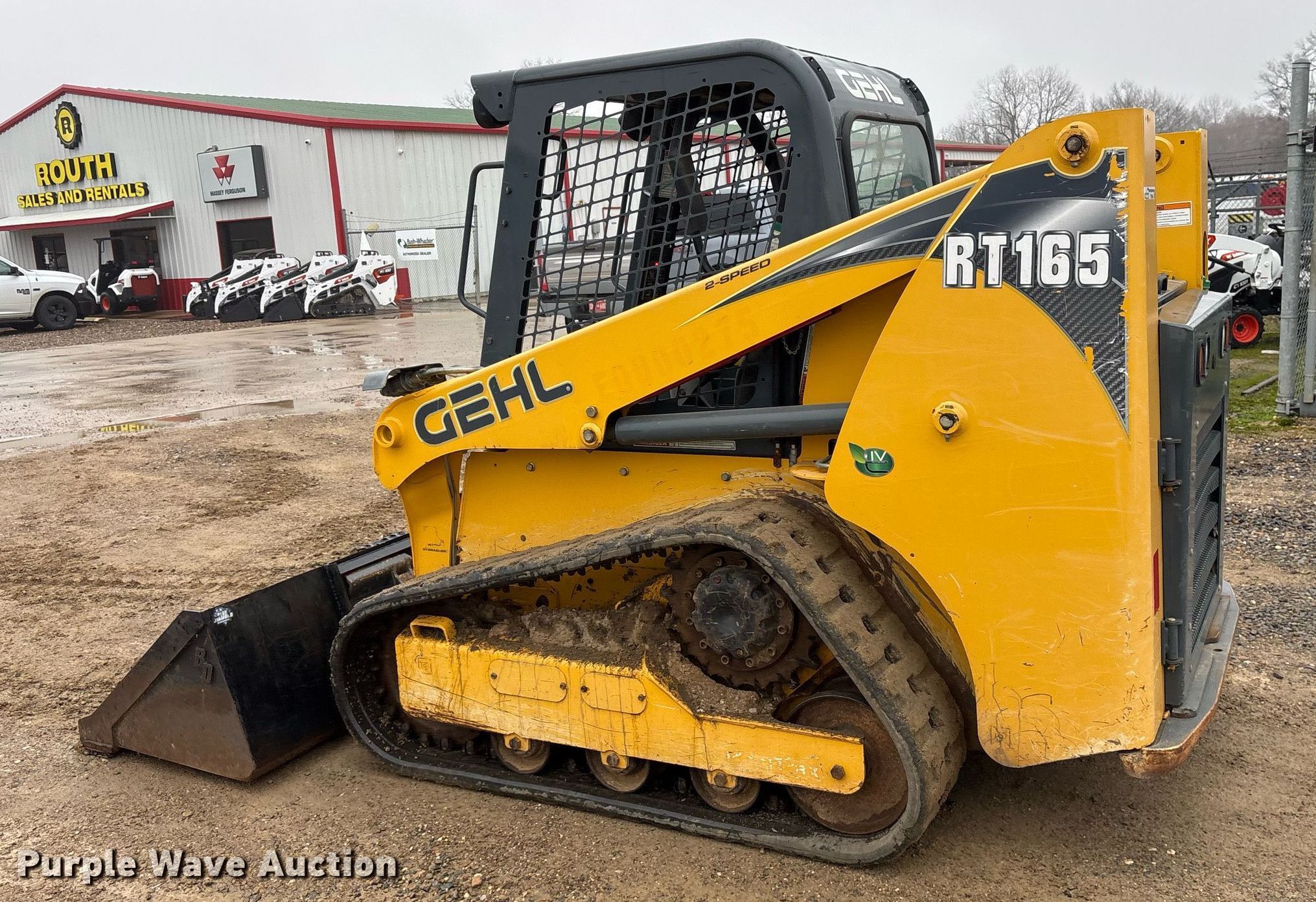2018 Gehl RT165 tracked skid steer loader. Hours: 797 on meter, Serial: GHLRT165H0D30140. Engine Yanmar 4TNV98C-NMS2, Displacement: 3.319L, Cylinders: 4, Fuel type: Diesel. Transmission Hydrostatic, Two speed travel. Operators station OROPS, Bucket control: Hand. Features Auxiliary hydraulics High flow, Quick coupler: Hydraulic, Bucket Blue Diamond 108130, Width: 84", Cutting edge: Bolt-on. Tracks Width: 12". ROUTH Sales & Rentals. Broken Bow, OK 74728