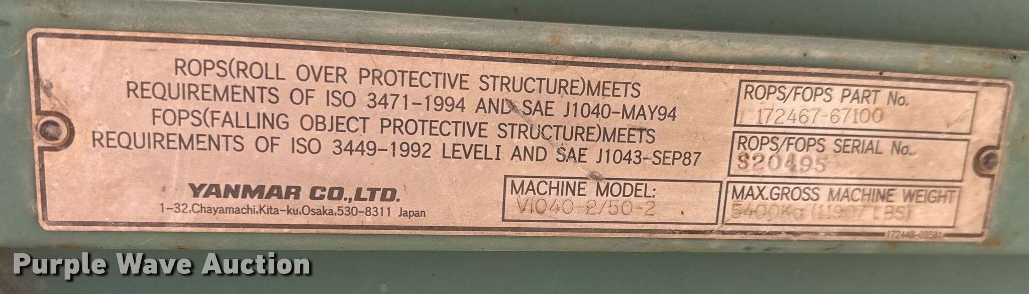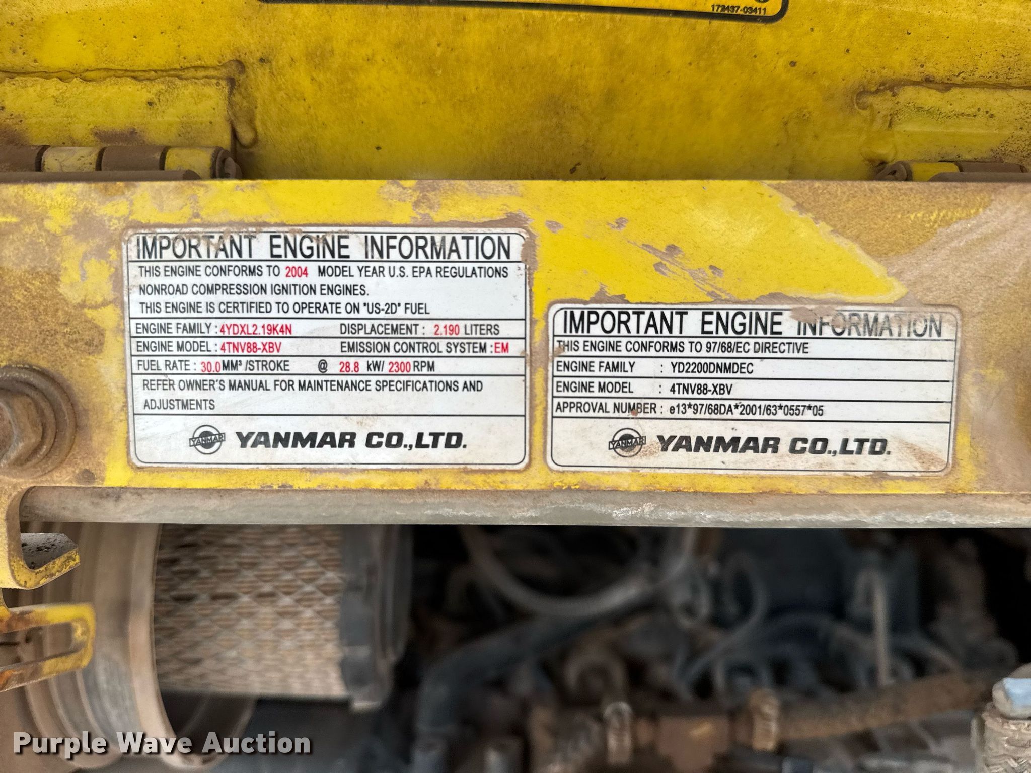 2004 Yanmar VI050-3 mini excavator. Hours: 5,336 on meter, Serial: 30507B. Engine Yanmar 4TNV88-XBV, Displacement: 2.190L, Cylinders: 4, Fuel type: Diesel. Transmission Hydrostatic. Operators station OROPS. Features Backfill blade Width: 77", Boom Swing, Stick Stick length: 5', Bucket TAG, Width: 24", Cutting edge: Weld-on, Teeth: 5. Tracks Width: 16", Rubber. Notes Hydraulic oil leak, Unknown operating condition of bucket controls Bucket controls stuck. Freeman Paving LLC. Wichita Falls, TX 76305