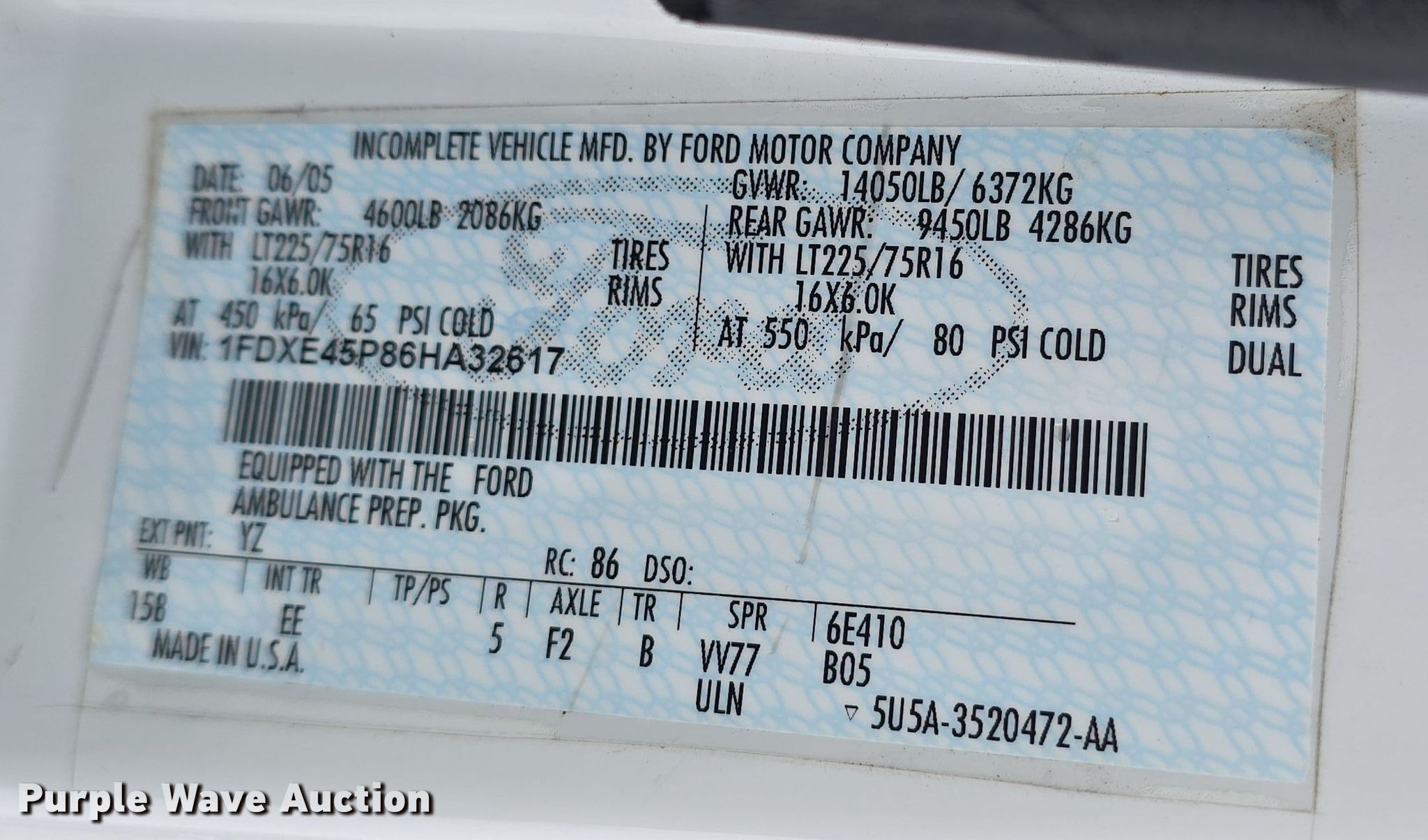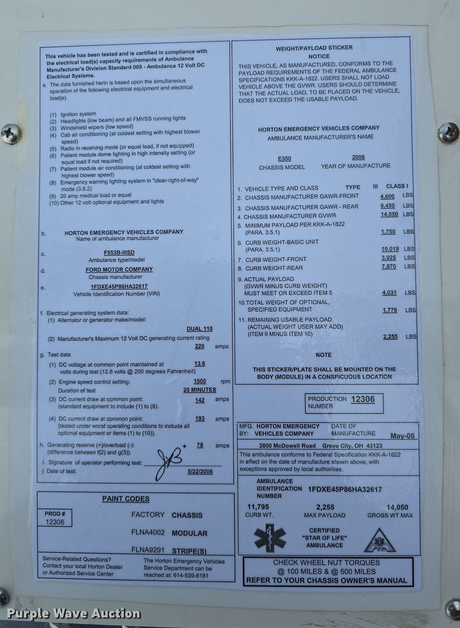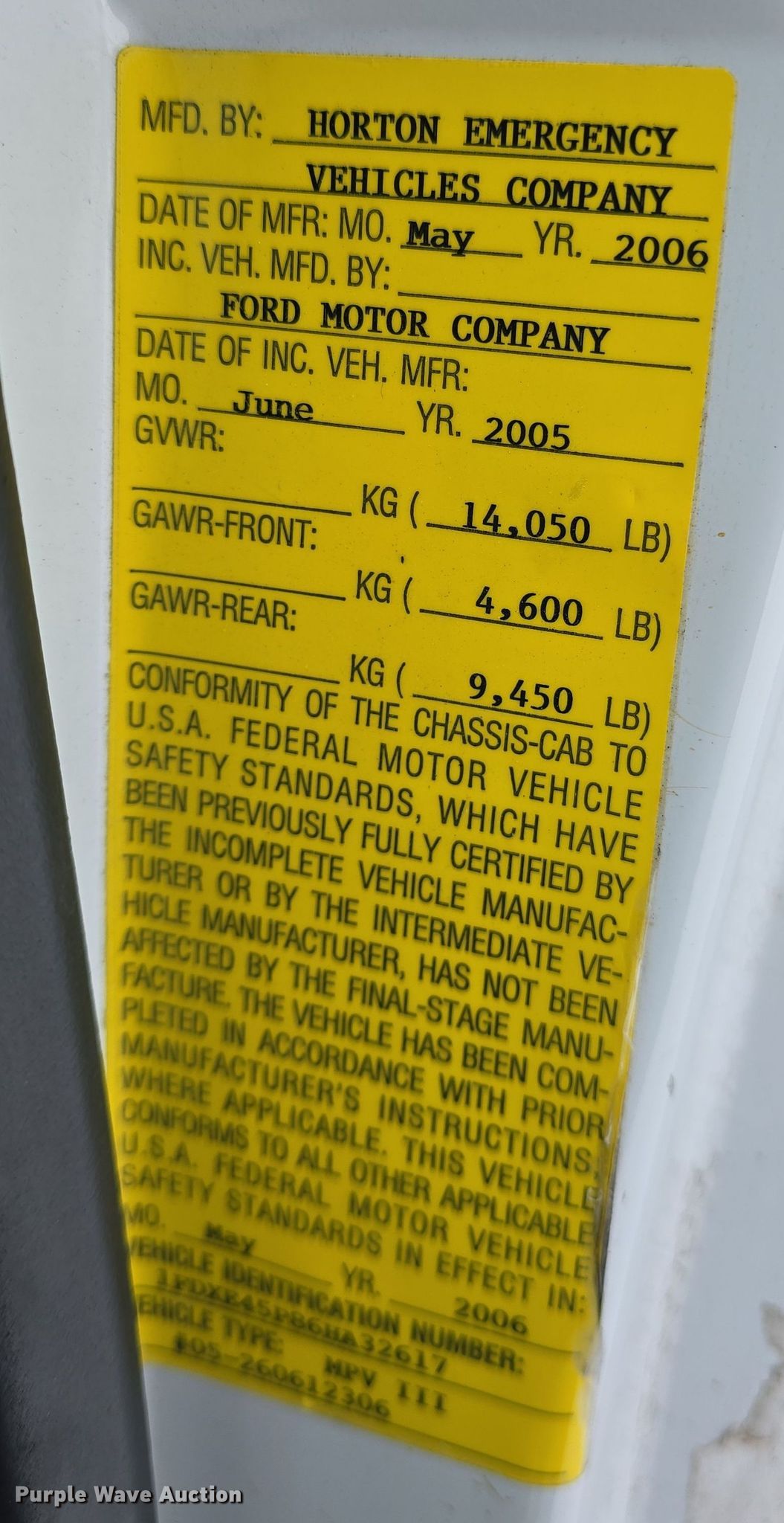 2006 Ford E450 ambulance. Miles: 106,956 on odometer, Hours: 3,987 on meter, VIN: 1FDXE45P86HA32617, Unit #: 52. Engine Displacement: 6.0L, Cylinders: 8, Fuel type: Diesel. Transmission Automatic. Chassis Axles: Single, Suspension: Spring, Brakes: Hydraulic, GVWR: 14,050 lbs, Wheelbase: 158". Interior AC, Heat, Power windows, Power locks, Cruise control. Features Ambulance body Horton F553BIIISD, PA/ siren controls, Oxygen hookups. Tires Size: 225/75R16, Brand: Michelin. Kansas title. Title distribution may be delayed up to 14 days from verification of funds. Manhattan Area Technical College. Manhattan, KS 66503