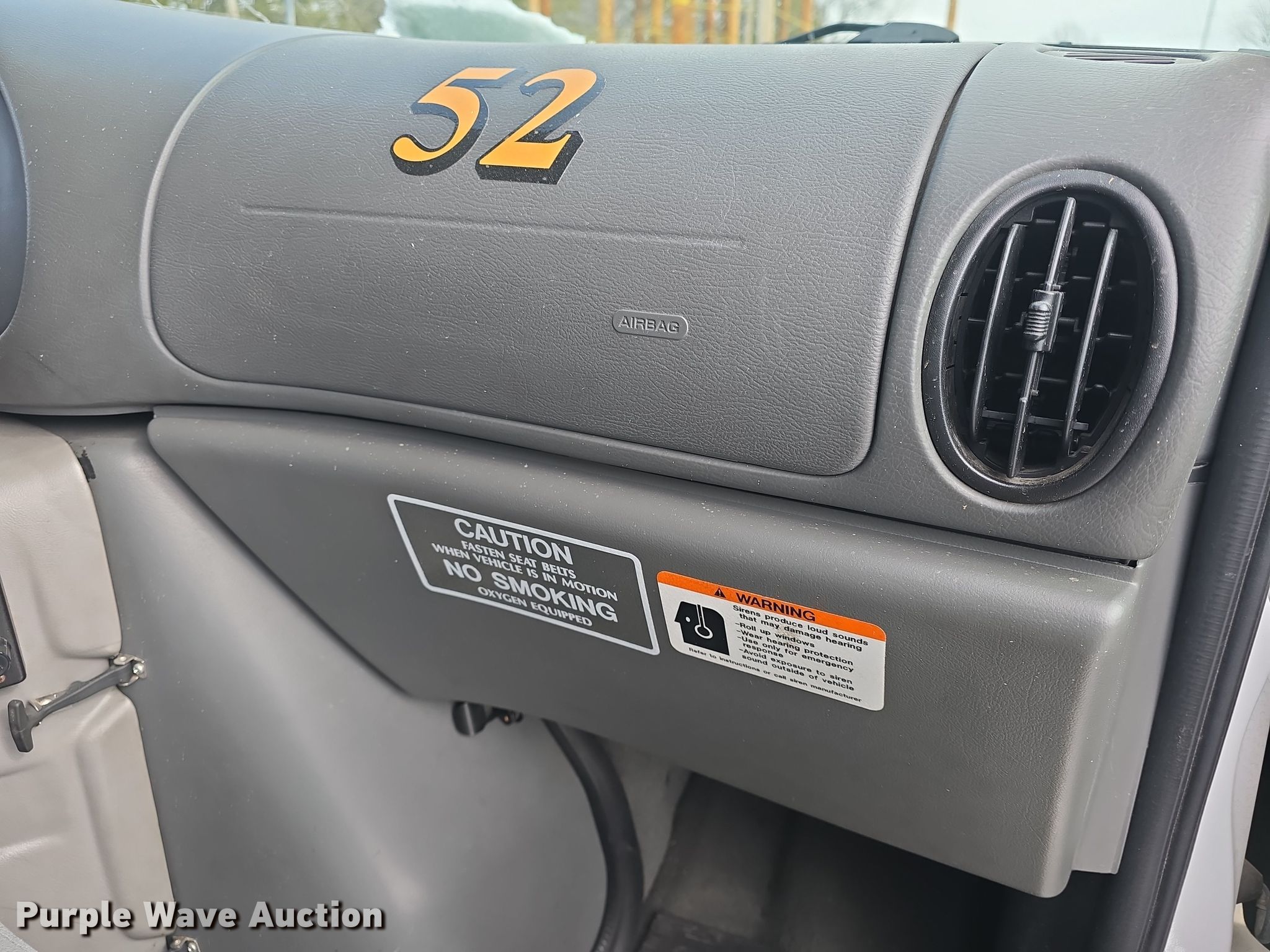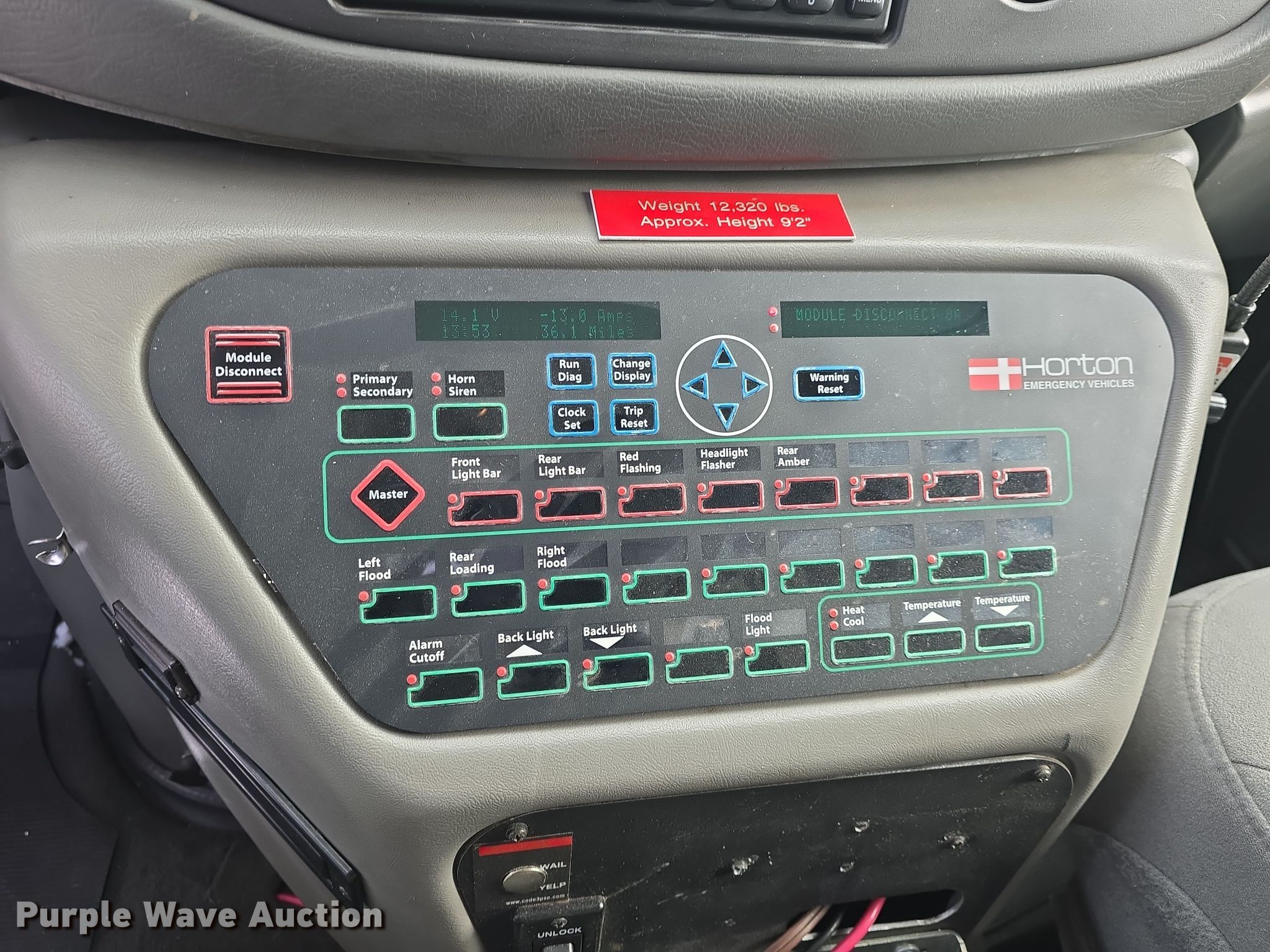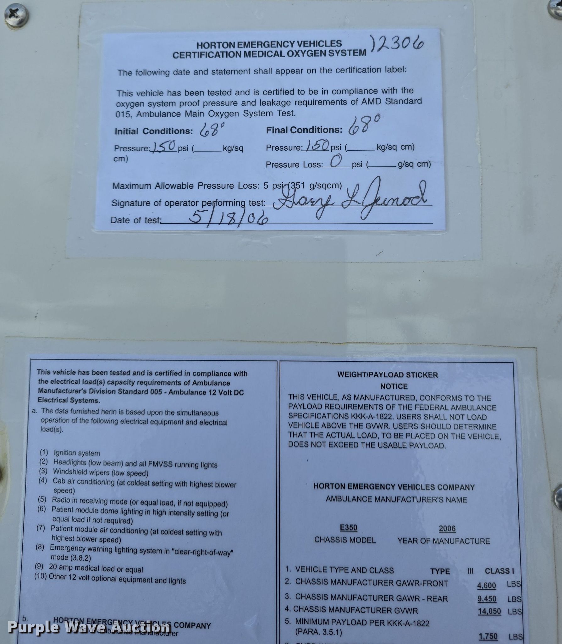 2006 Ford E450 ambulance. Miles: 106,956 on odometer, Hours: 3,987 on meter, VIN: 1FDXE45P86HA32617, Unit #: 52. Engine Displacement: 6.0L, Cylinders: 8, Fuel type: Diesel. Transmission Automatic. Chassis Axles: Single, Suspension: Spring, Brakes: Hydraulic, GVWR: 14,050 lbs, Wheelbase: 158". Interior AC, Heat, Power windows, Power locks, Cruise control. Features Ambulance body Horton F553BIIISD, PA/ siren controls, Oxygen hookups. Tires Size: 225/75R16, Brand: Michelin. Kansas title. Title distribution may be delayed up to 14 days from verification of funds. Manhattan Area Technical College. Manhattan, KS 66503