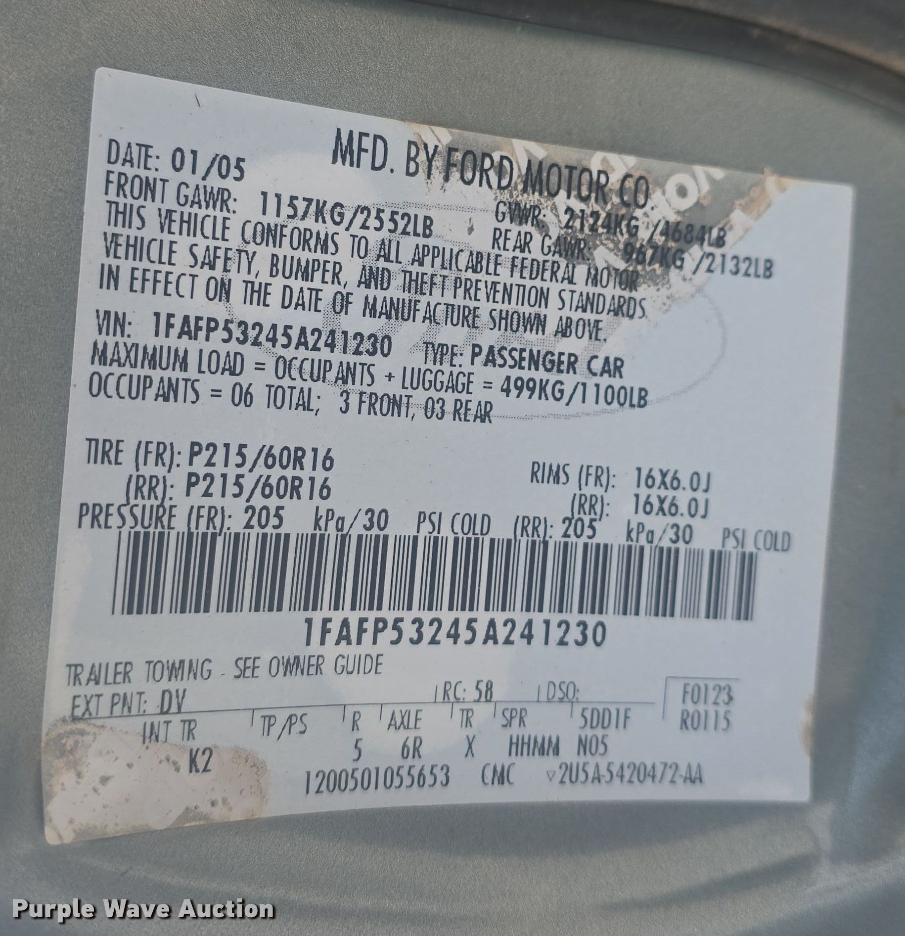 2005 Ford Taurus. Miles: 197,226 on odometer, VIN: 1FAFP53245A241230. Engine Displacement: 3.0L V6 OHV, Cylinders: 6, Fuel type: Gas. Transmission Automatic. Interior AC, Heat, Power windows, Power locks, Cruise control. Tires Size: 215/60R16. Notes Decals will be removed prior to auction, Contents not included. Kansas title. Title distribution may be delayed up to 14 days from verification of funds. Brookville, KS 67425
