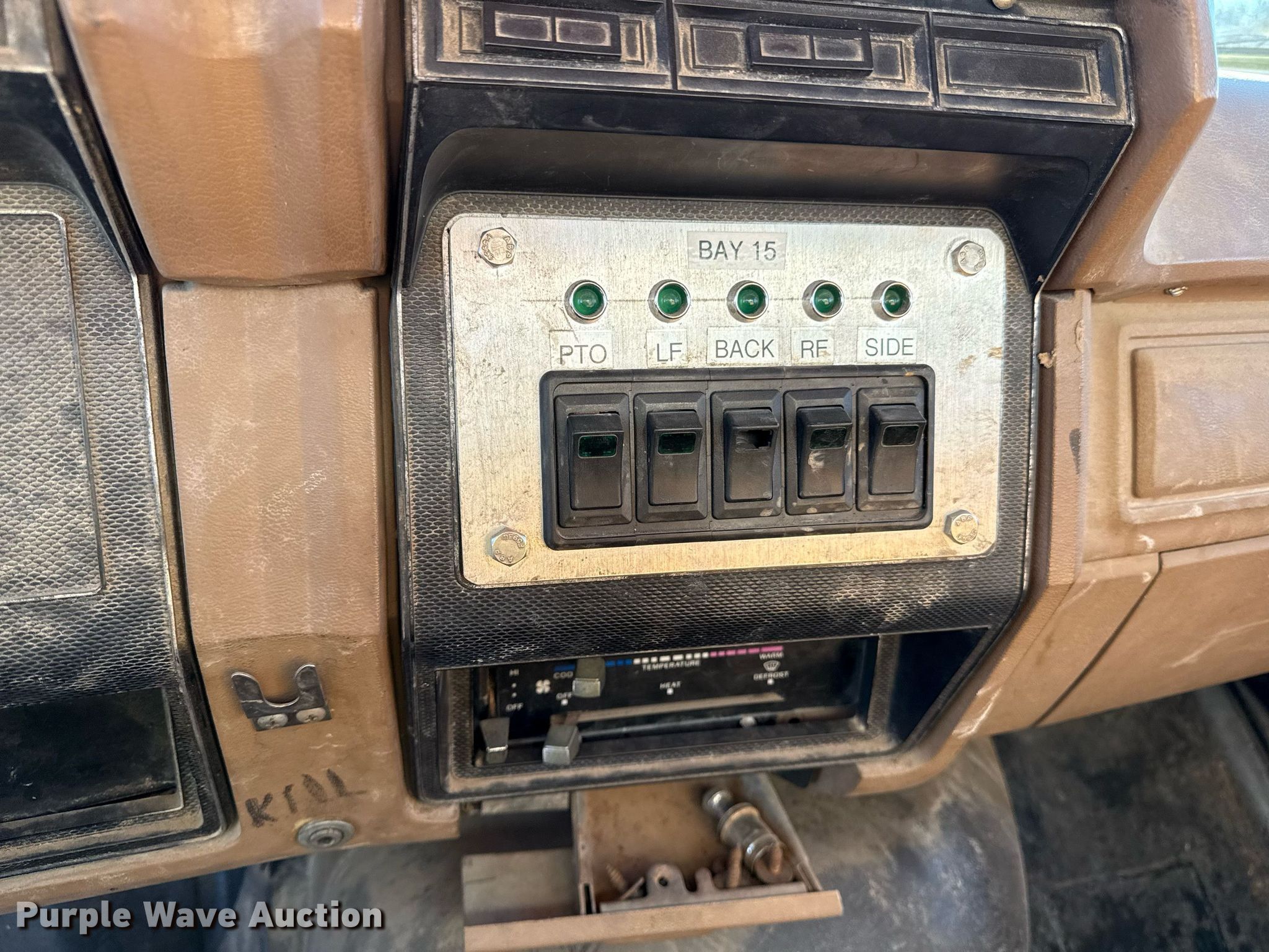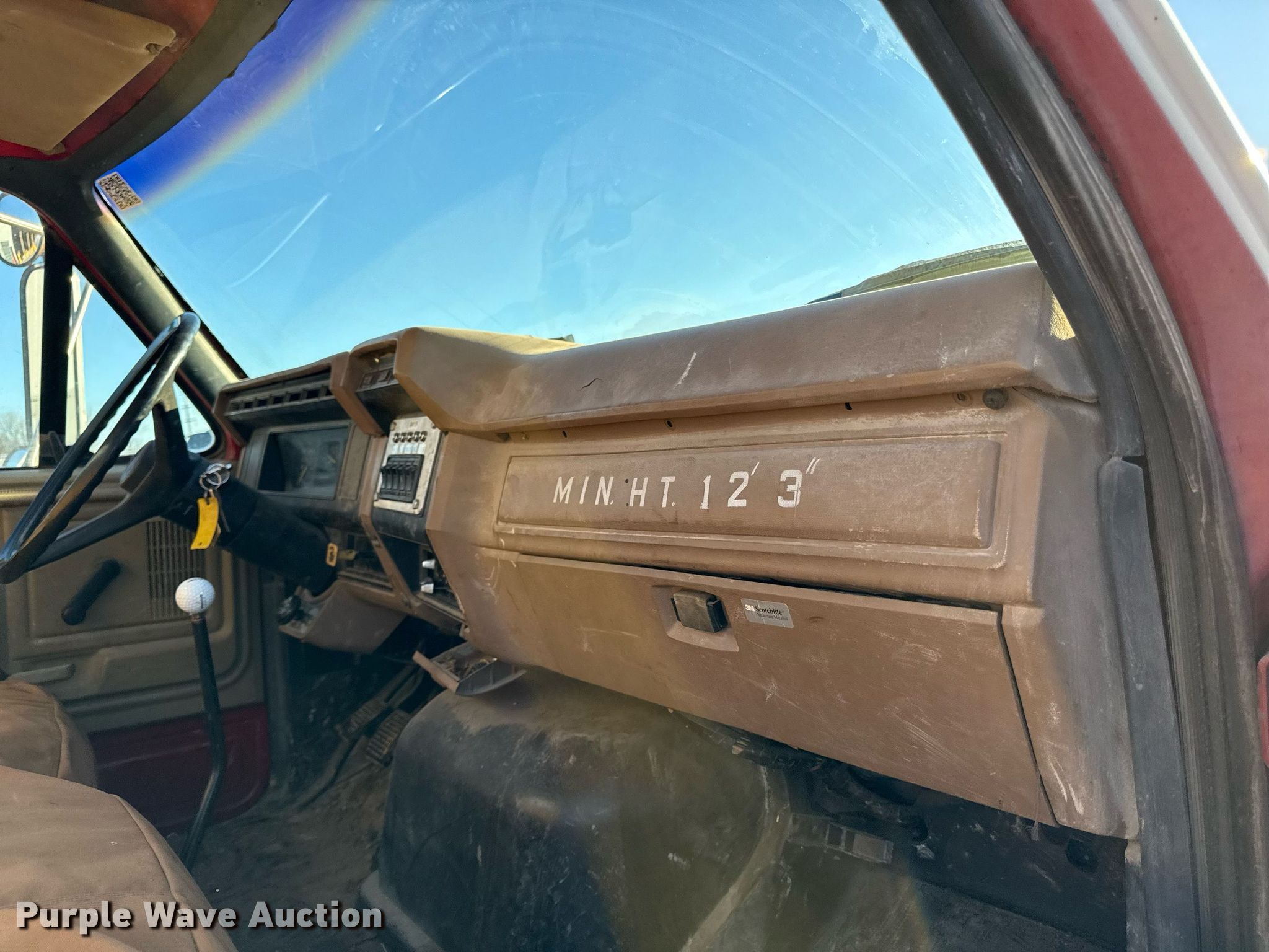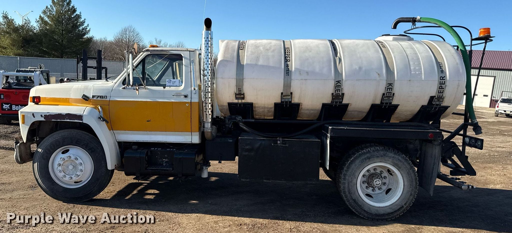 1987 Ford F700 water truck. Miles: 91,161 on odometer, Hours: 981 on meter, VIN: 1FDNT74P9HVA42853. Engine Displacement: 6.6L, Cylinders: 6, Fuel type: Diesel. Transmission Manual. Chassis Axles: Single, Suspension: Spring, Brakes: Hydraulic. Interior Heat. Features Bed / tank Capacity: 1,600 gallons, 13" L x 96" W, Spray bar: Rear, Top fill, Rear drain: 2". Tires Front: 11R22.5, Rear: 9.00-20. Kansas title. Title distribution may be delayed up to 14 days from verification of funds. City of De Soto Kansas. De Soto, KS 66018