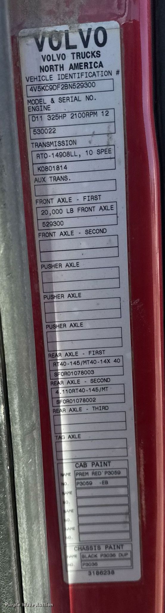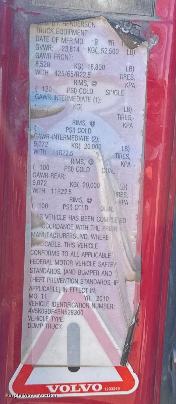 2011 Volvo VHD dump truck. Miles: 293,081 on odometer, VIN: 4V5KC9DF2BN529300. Engine Volvo D11, Serial: 530022, Displacement: 10.8L, Cylinders: 6, Fuel type: Diesel, HP: 325. Transmission Eaton Fuller RTO-14908LL, Manual, Speed: 10. Chassis Axles: Tandem, Differential lock: Full, Suspension: Spring over walking beam, Brakes: Air, PTO, GVWR: 52,500 lbs FAWR: 18,800 lbs, IAWR: 20,000 lbs, RAWR: 20,000 lbs. Interior AC, Heat, Power windows, Cruise control. Features Dump bed Henderson, 16' L x 96" W, Side height: 35", Side board height: 10", Bed type: Steel, Ram: Single. Tires Front: 425/55R22.5, Rear: 11R22.5. Notes Dash warning indicator: Check engine, ABS, Inlet air heater #2 error. Iowa title. Seller is a government entity who will be assigning and distributing the title. Please contact the seller for distribution questions. Title distribution may be delayed up to 14 days from verification of funds. Jasper County Highway Department. Newton, IA 50208
