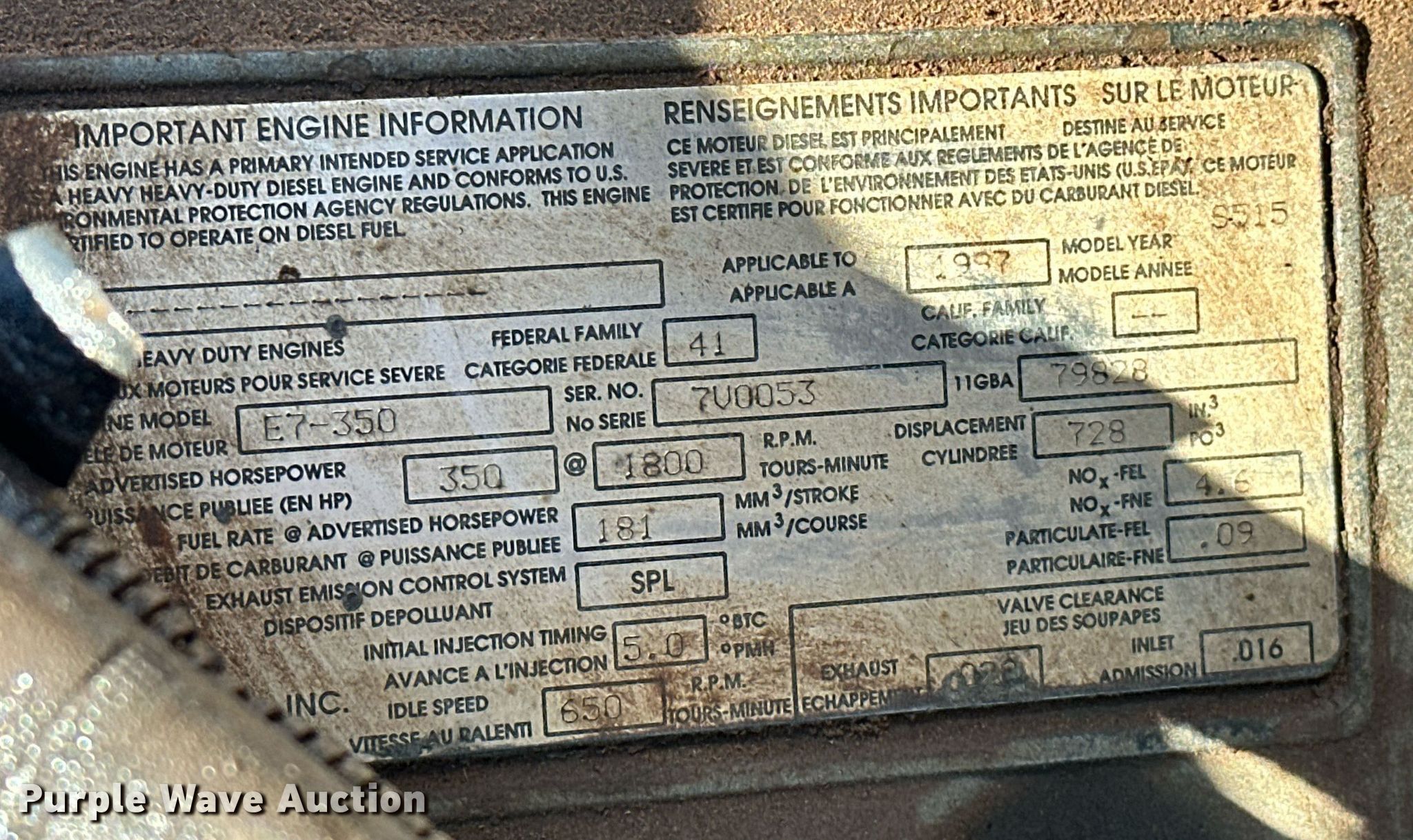 1998 Mack CH600 semi truck. Miles: 645,036 on odometer, Hours: 12,853 on meter, VIN: 1M1AA13Y2WW093487. Engine Mack E7-350, Serial: 7V0053, Displacement: 12.0L, Cylinders: 6, Fuel type: Diesel, HP: 350. Transmission Eaton Fuller, Manual. Chassis Axles: Tandem, Differential lock: Inter-axle, Suspension: Air Dump valves, Brakes: Air, PTO. Interior AC, Heat, Heated mirrors, Power windows, Power locks, Cruise control, Air ride cab. Features Fifth wheel type: Sliding, Fuel tank: Dual. Tires Size: 295/75R22 5. Notes Windshield chipped or cracked, Engine issues, valve cover leak. Oklahoma classic title. Seller is a government entity who will be assigning and distributing the title. Please contact the seller for distribution questions. Custer County - District 2. Weatherford, OK 73096