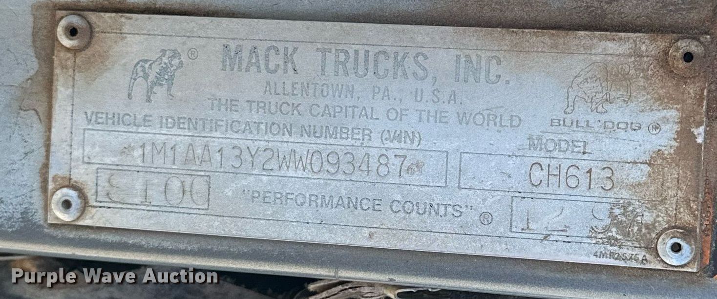 Purple Wave is selling a used Truck Tractor in Oklahoma. This item is a 1998 Mack CH600 semi truck with the following: Miles: 645,036 on odometer, Hours: 12,853 on meter, VIN: 1M1AA13Y2WW093487