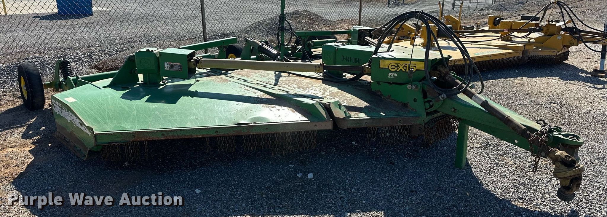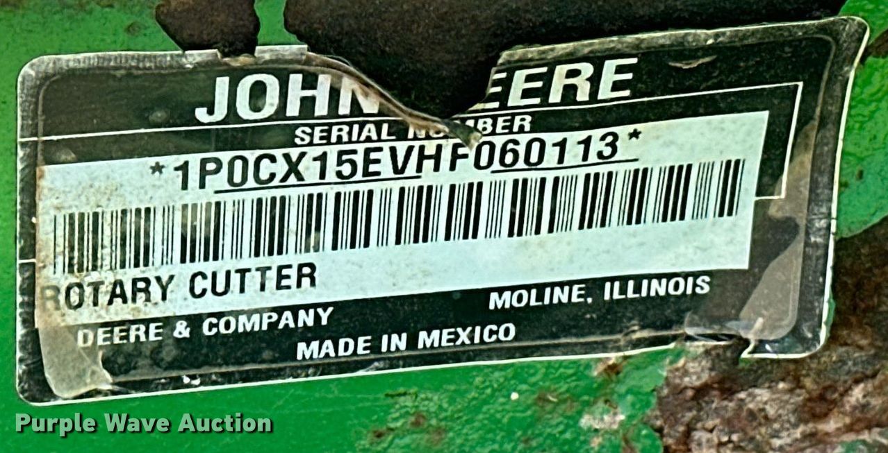 2017 John Deere CX15 rotary mower. Serial: 1P0CX15EVHF060113. Features Width: 15', Hydraulic lift, Hydraulic fold, PTO: 540. Tires Solid. Custer County - District 2. Weatherford, OK 73096
