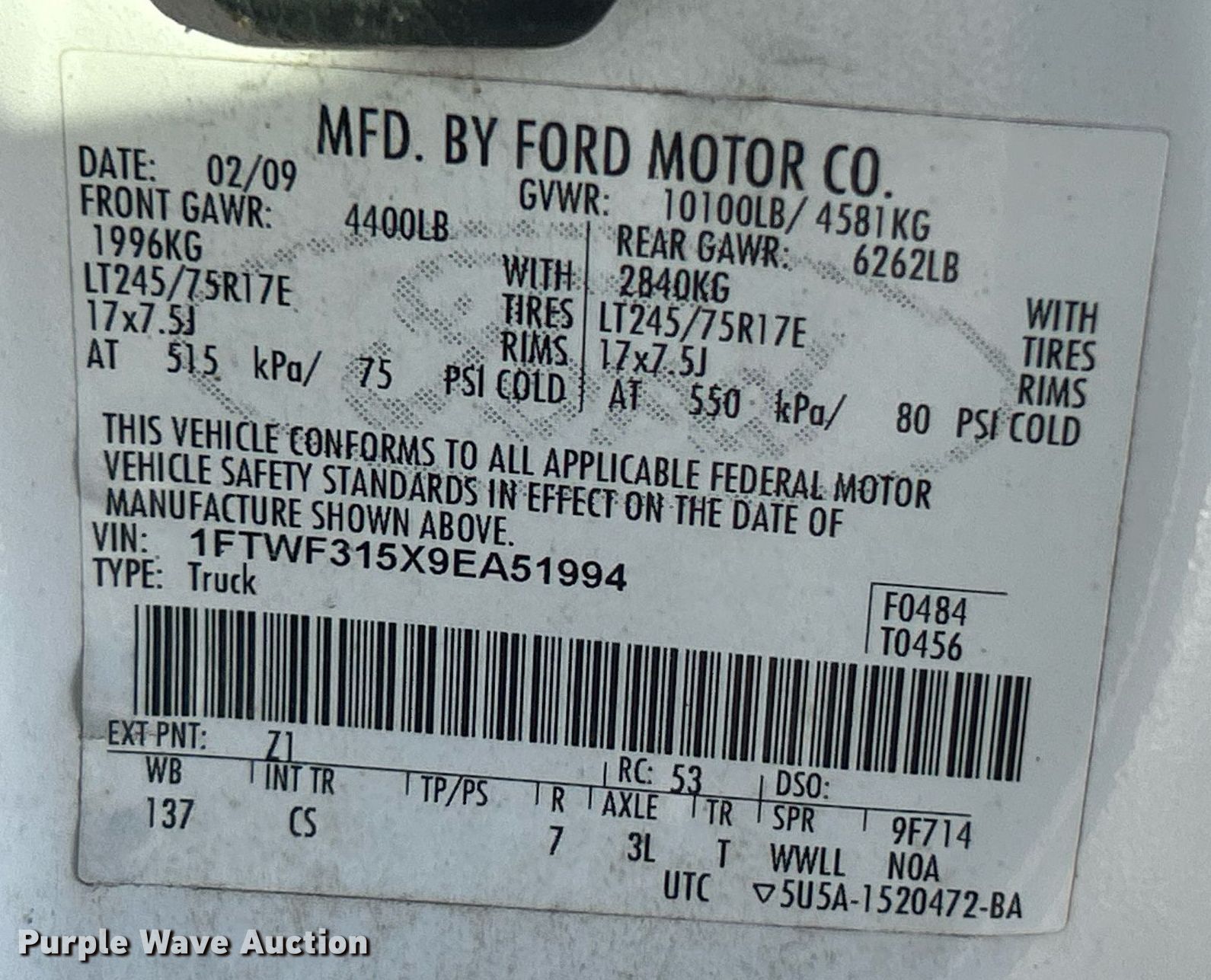 2009 Ford F350 Super Duty XL pickup truck. Miles: 36,859 on odometer, VIN: 1FTWF315X9EA51994. Engine Displacement: 5.4L V8 SOHC, Cylinders: 8, Fuel type: Gas. Transmission Automatic, Four wheel drive. Interior AC, Heat. Tires Size: 245/75R17. Notes Dash warning indicator: TPMS. Missouri title. Title distribution may be delayed up to 30 days from verification of funds. Lincoln County. Troy, MO 63379