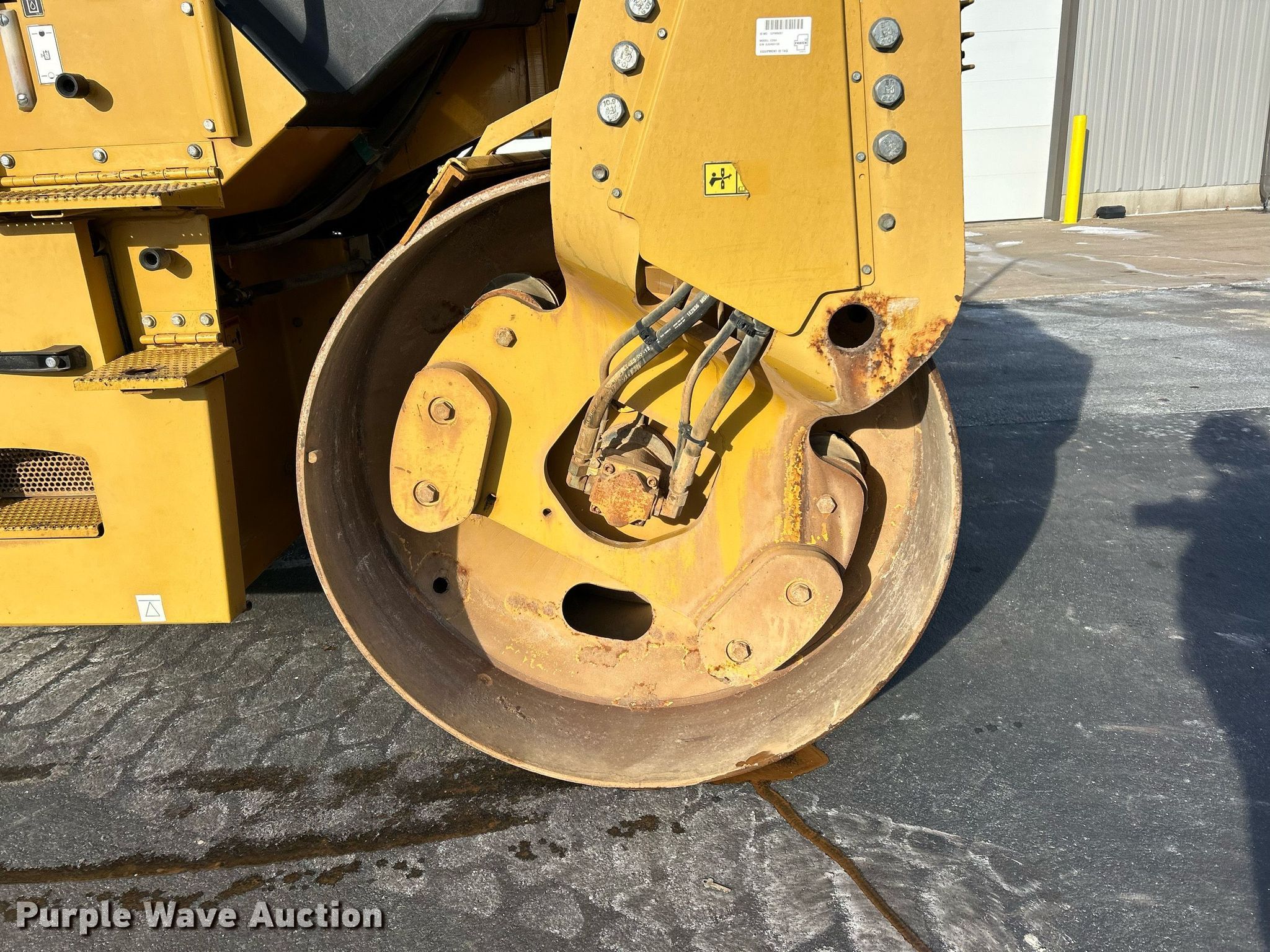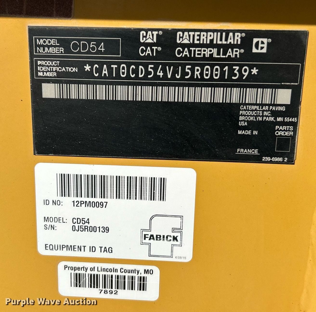 2010 Caterpillar CD54 double drum vibratory roller. Hours: 2,604 on meter, Serial: CAT0CD54VJ5R00139. Engine Caterpillar 3054C, Cylinders: 4, Fuel type: Diesel. Transmission Hydrostatic, Two speed travel. Operators station Enclosed cab, AC, Heat. Features Crab operation, Drum: Smooth, Vibratory system: Double, Independent drum controls, Two speed, Front drum Width: 67", Diameter: 47", Rear drum Width: 67", Diameter: 47", Drum scrapers: Front, Rear, Water spray applicator: Front, Rear. Lincoln County. Troy, MO 63379