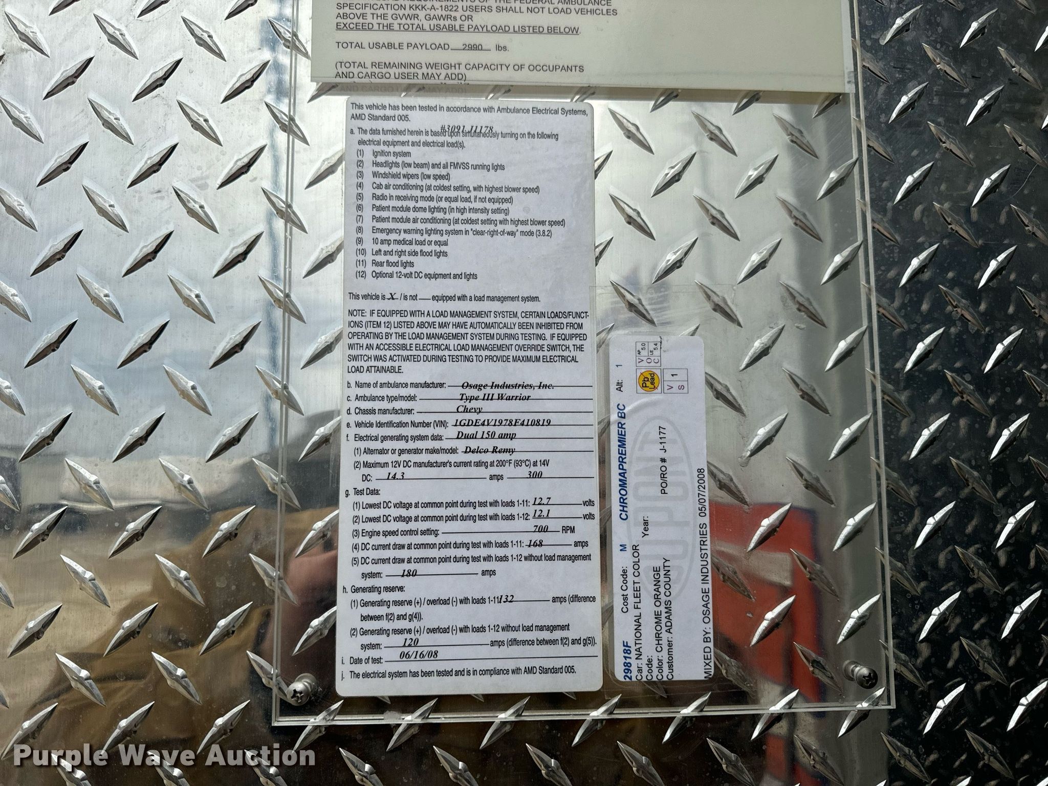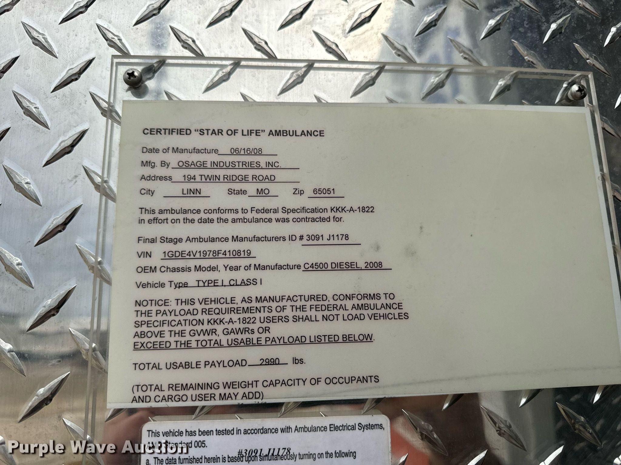 2008 GMC C4500 ambulance. Miles: 156,119 on odometer, VIN: 1GDE4V1978F410819, Unit #: 12. Engine Displacement: 6.6L, Cylinders: 8, Fuel type: Diesel. Transmission Automatic. Chassis Axles: Single, Suspension: Spring, Brakes: Hydraulic, GVWR: 16,500 lbs. Interior AC, Heat, Heated mirrors, Power windows, Power locks, Cruise control, Auxiliary controls. Features Ambulance body Osage Industries Inc. Type 3 Warrior, PA/ siren controls, Oxygen hookups. Tires Size: 225/70R19.5. Notes Non-operational unit, * Unit must be towed or hauled, Engines issues, intermittently goes into limp mode , Engine issues, intermittently will not start. Illinois title. Title distribution may be delayed up to 14 days from verification of funds. Adams County Ambulance & EMS. Quincy, IL 62305