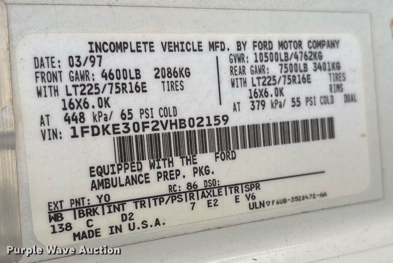 Purple Wave is selling a used Fire Truck or Emergency Vehicle in Oklahoma. This item is a 1997 Ford E350 ambulance with the following: Miles: 96,005 on odometer, VIN: 1FDKE30F2VHB02159