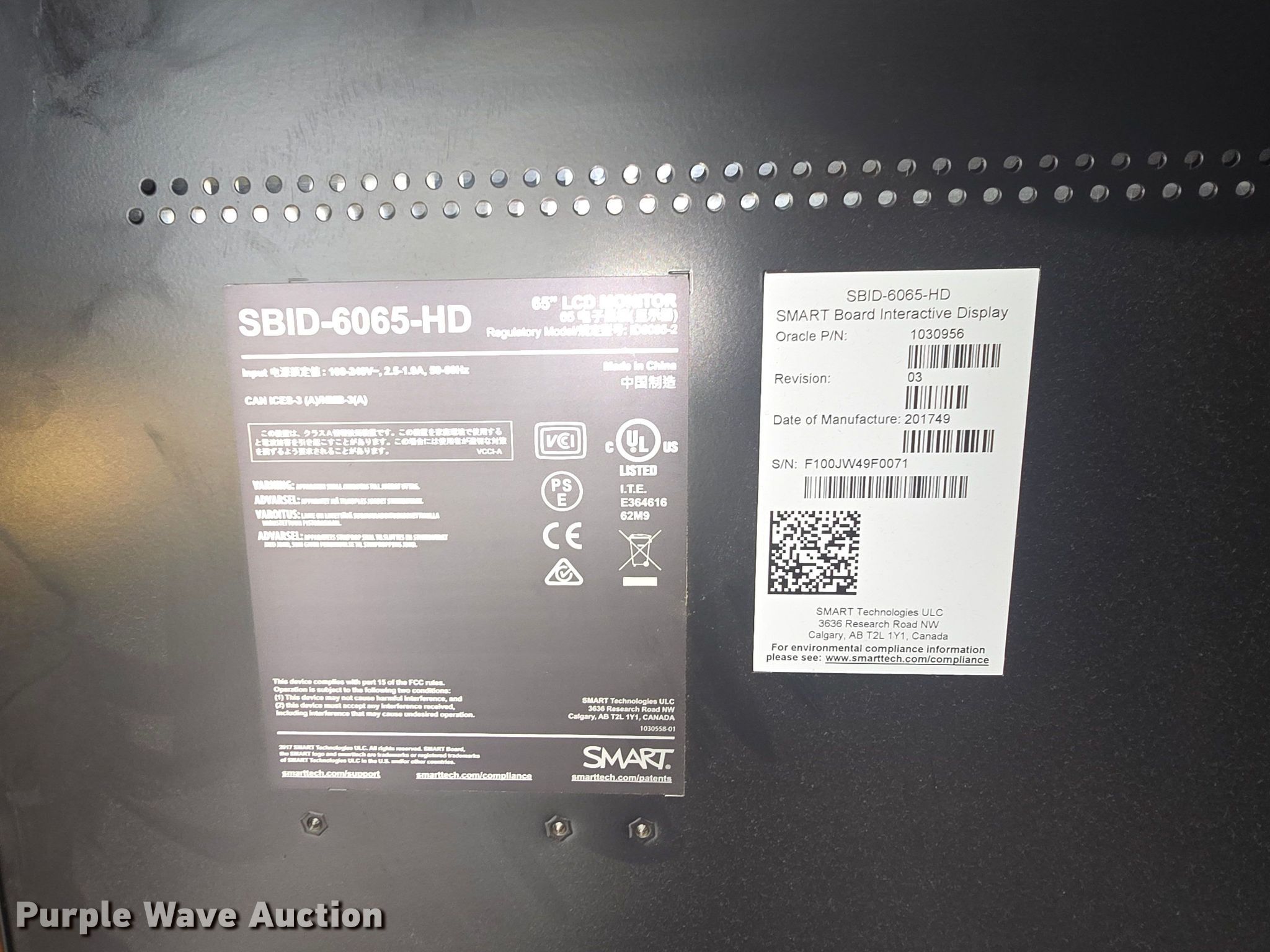 Purple Wave is selling a used Electronics in Kansas. This item is a 2017 Smart SBID-6065-HD smart board with the following: 59" x 39", Serial: F100JW49F0071