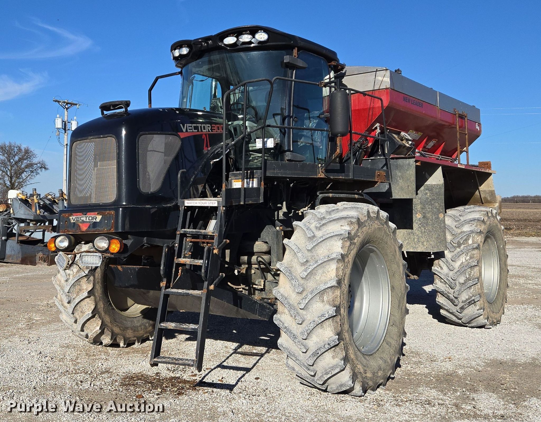 2014 RBR Vector 300 spreader. Engine hours: 4,417 on meter, Serial: M14004321. Engine Cummins, Cylinders: 6, Fuel type: Diesel. Transmission Automatic, Four wheel drive. Operators station AC, Heat. Features Hydraulic ladder, Dry fertilizer spreader bed New Leader G4, Length: 13', Stainless steel, Dual spinners, Conveyor belt Width: 22", Electronics Light bar, GPS monitor Raven, GPS receiver Raven Viper 4, Auto steer. Tires Size: 650/65R38, Flotation tires. MFA Ag Inc. Lamar, MO 64759