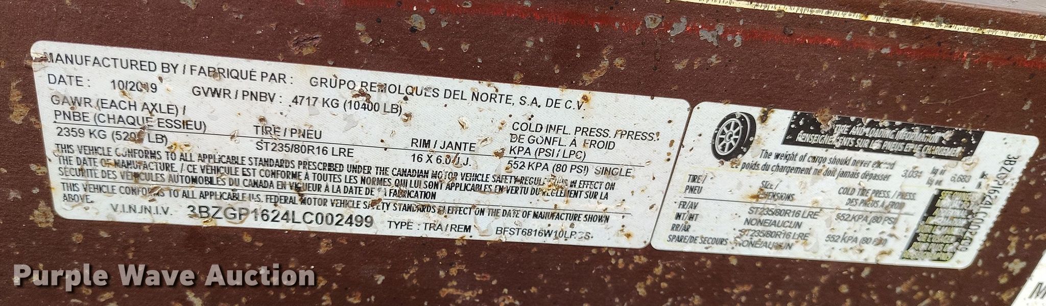 2020 Grupo Remolques Del Norte livestock trailer. VIN: 3BZGP1624LC002499. Dimensions Overall: 19' 6" L x 96" W, Body: 16' L x 84' W. Features Center gates: 1, Ground load. Chassis Ball hitch: 2 5/16", Landing gear: Single, Suspension: Spring, Brakes: Electric, Axles: Tandem, GVWR: 10,400 lbs, GAWR: 5,200 lbs. Tires Steel wheels, Size: ST235/80R16. Texas title. Title distribution may be delayed up to 14 days from verification of funds. Claude, TX 79019