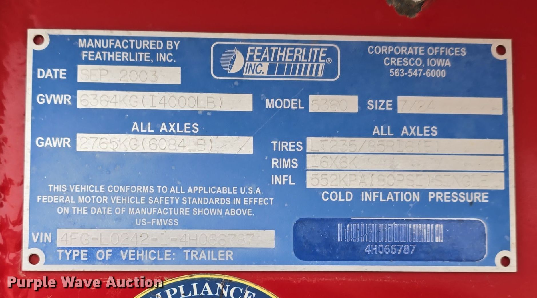 Purple Wave is selling a used Livestock Trailer in Kansas. This item is a 2004 Featherlite Inc. 5360 livestock trailer with the following: VIN: 4FGL024214H066787